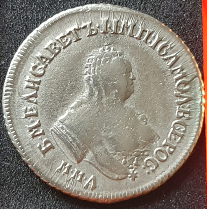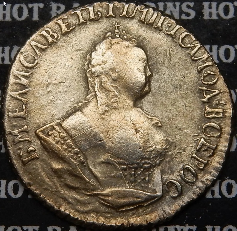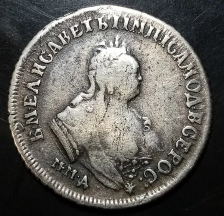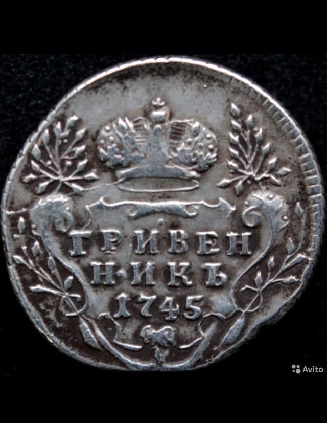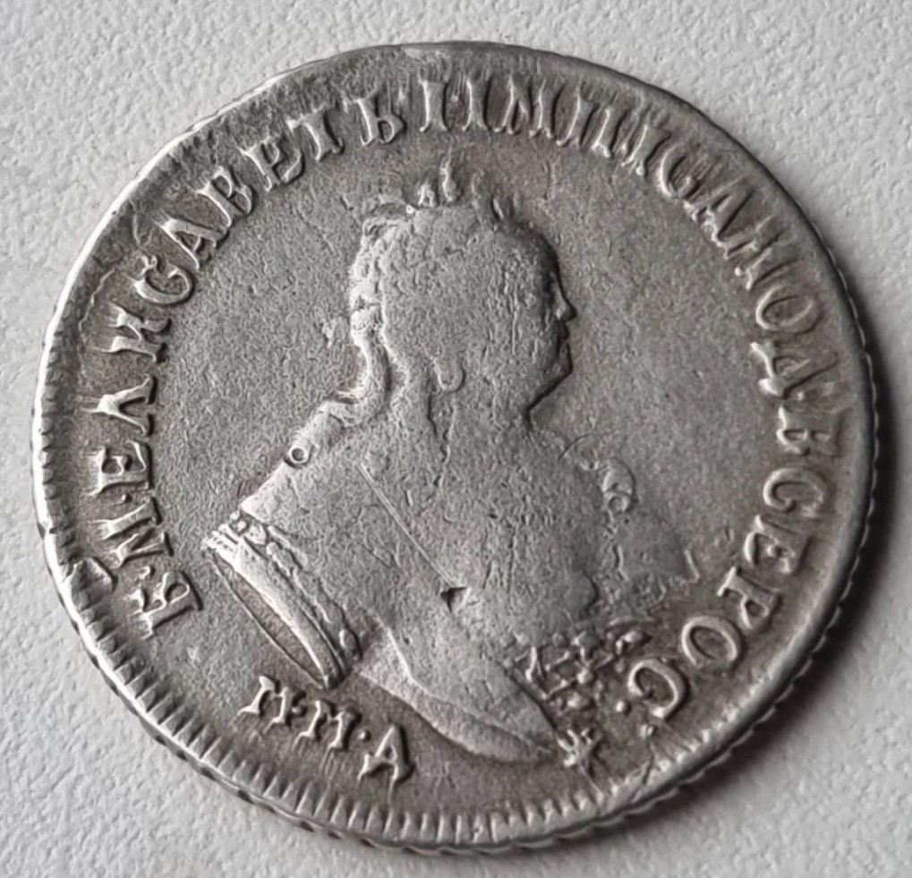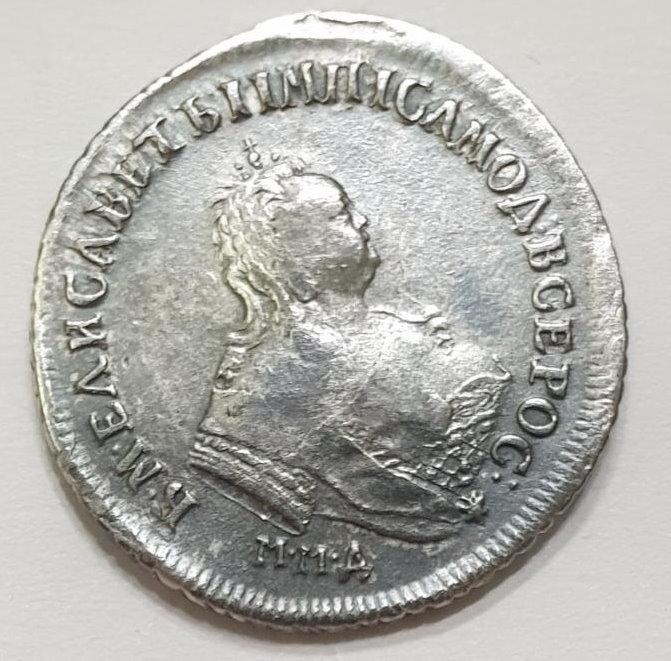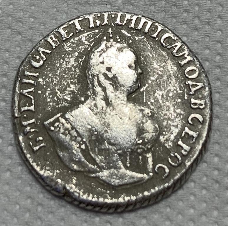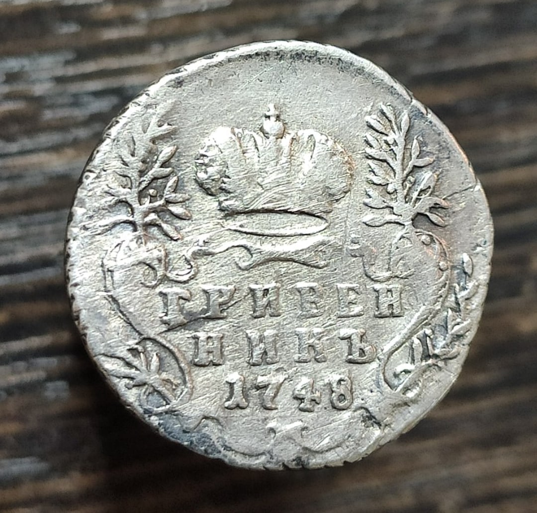 Монета представляет собой гривенник (10 копеек) времён правления императрицы Елизаветы Петровны, отчеканенный в 1744 году. Оригинальные экземпляры этого периода являются редкими и ценными. Представленный в посте экземпляр является копией, что прямо указано автором и подтверждено комментаторами.