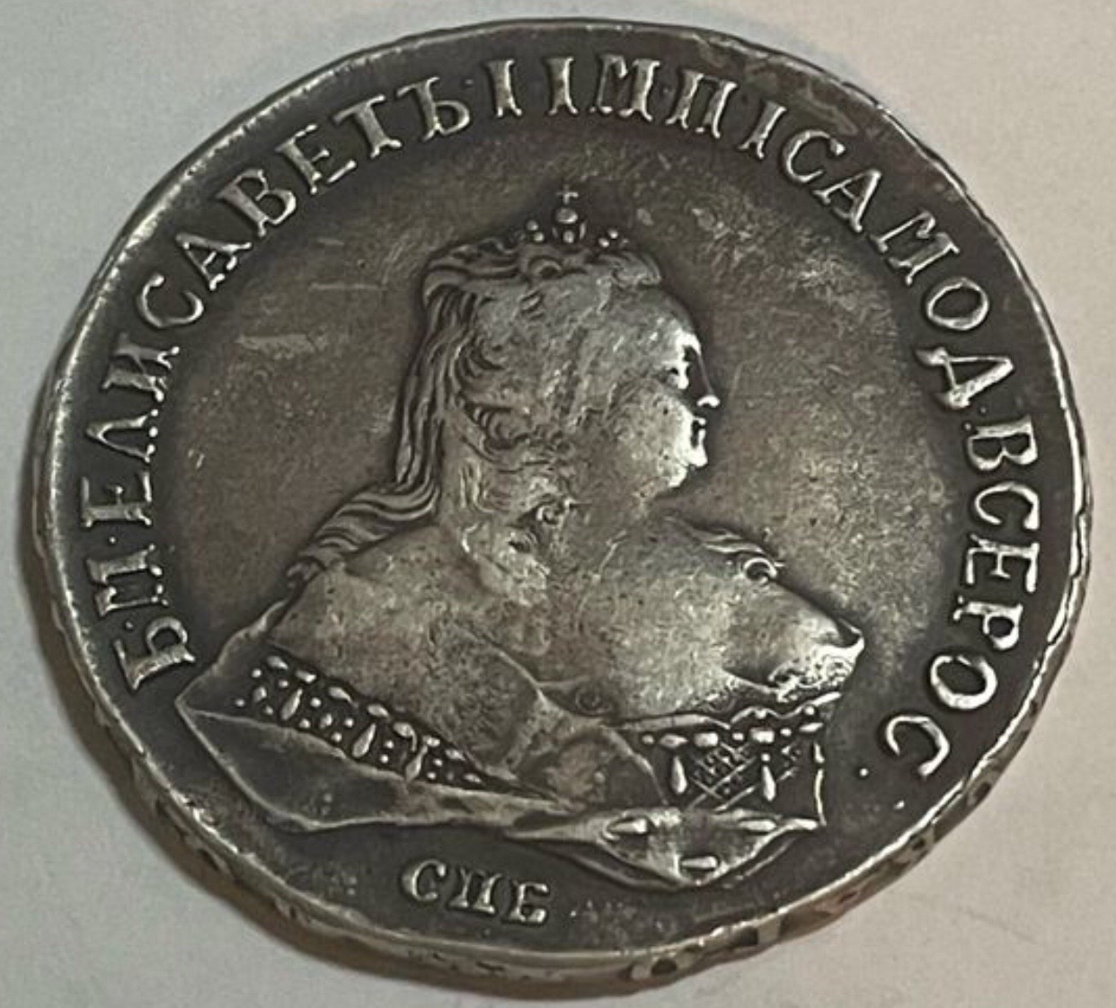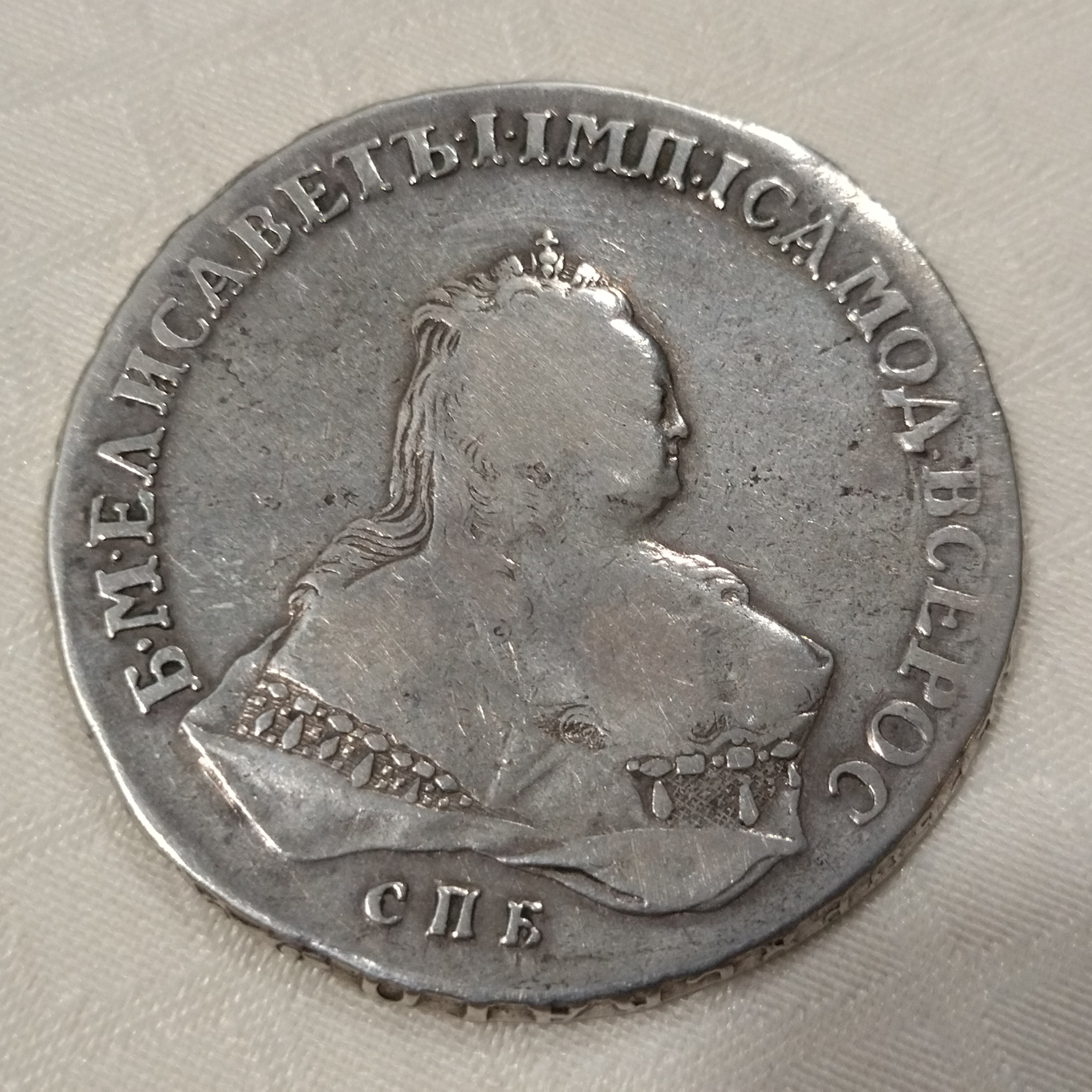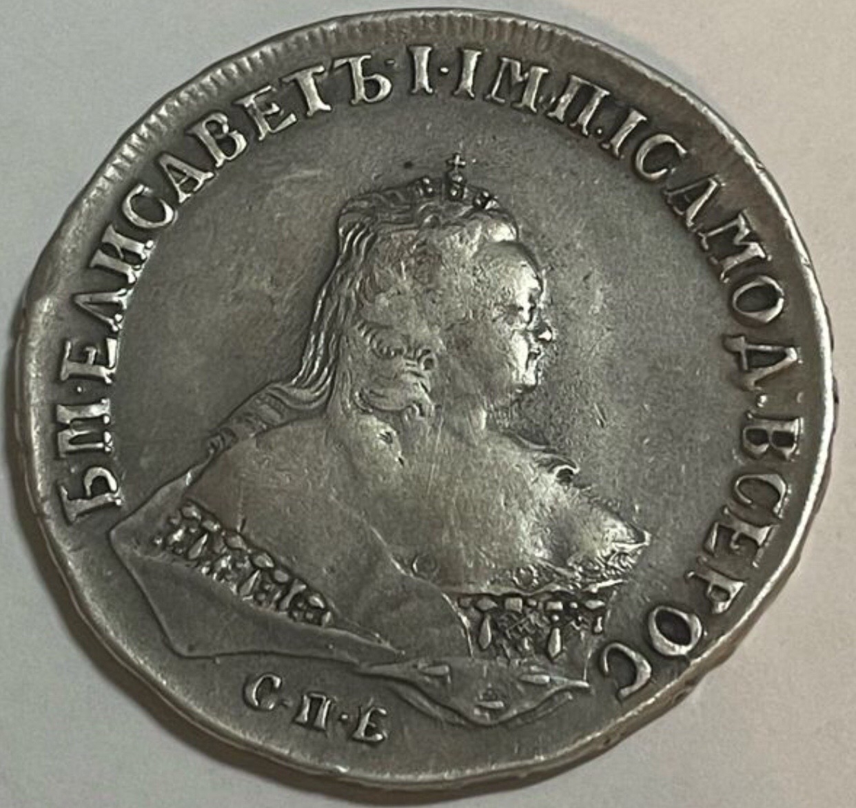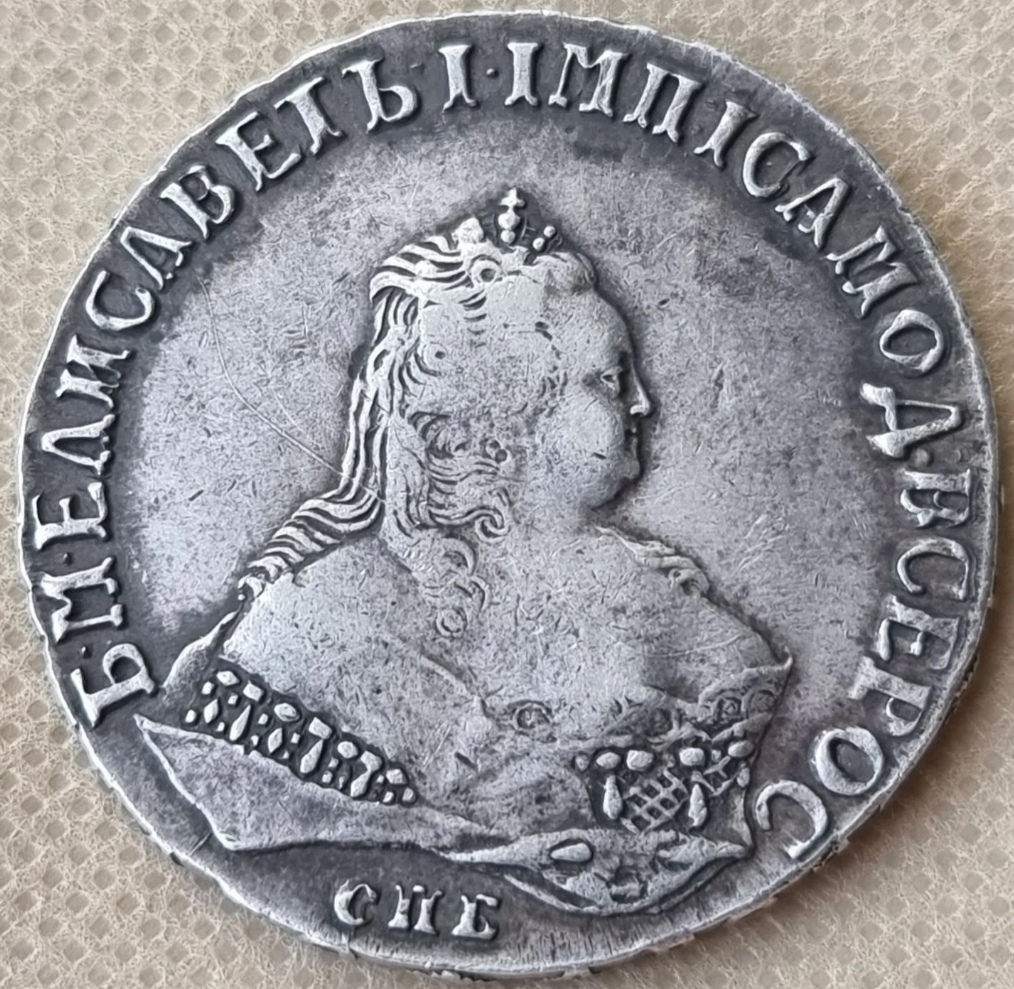 Монета представлена как серебряный рубль 1742 года с монограммой Санкт-Петербургского монетного двора (СПБ), отчеканенный в правление императрицы Елизаветы Петровны. Однако автор поста прямо указывает, что это подделка. Подлинные рубли этого года являются редкими и ценными, что делает их частой мишенью для фальсификаторов.