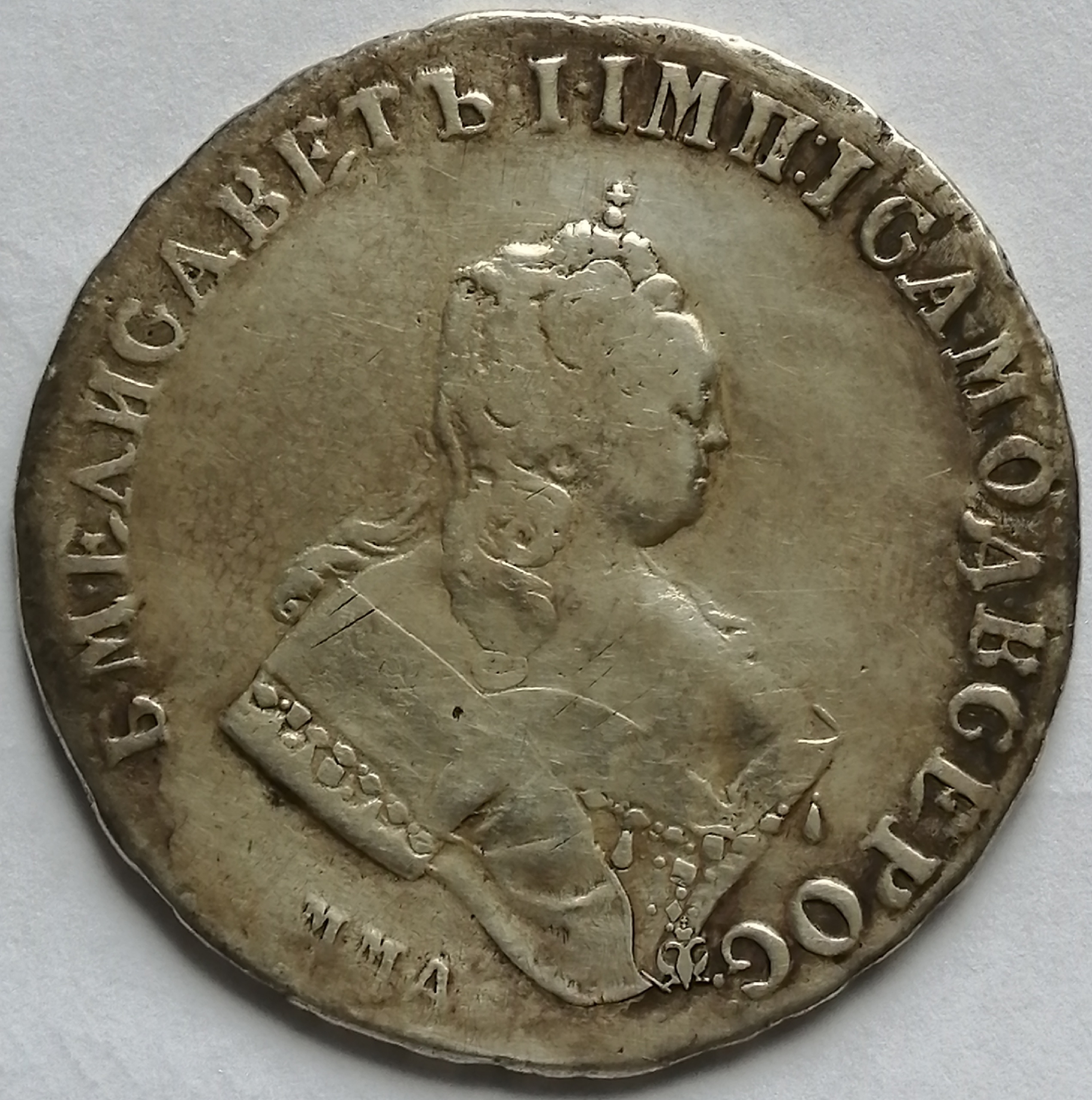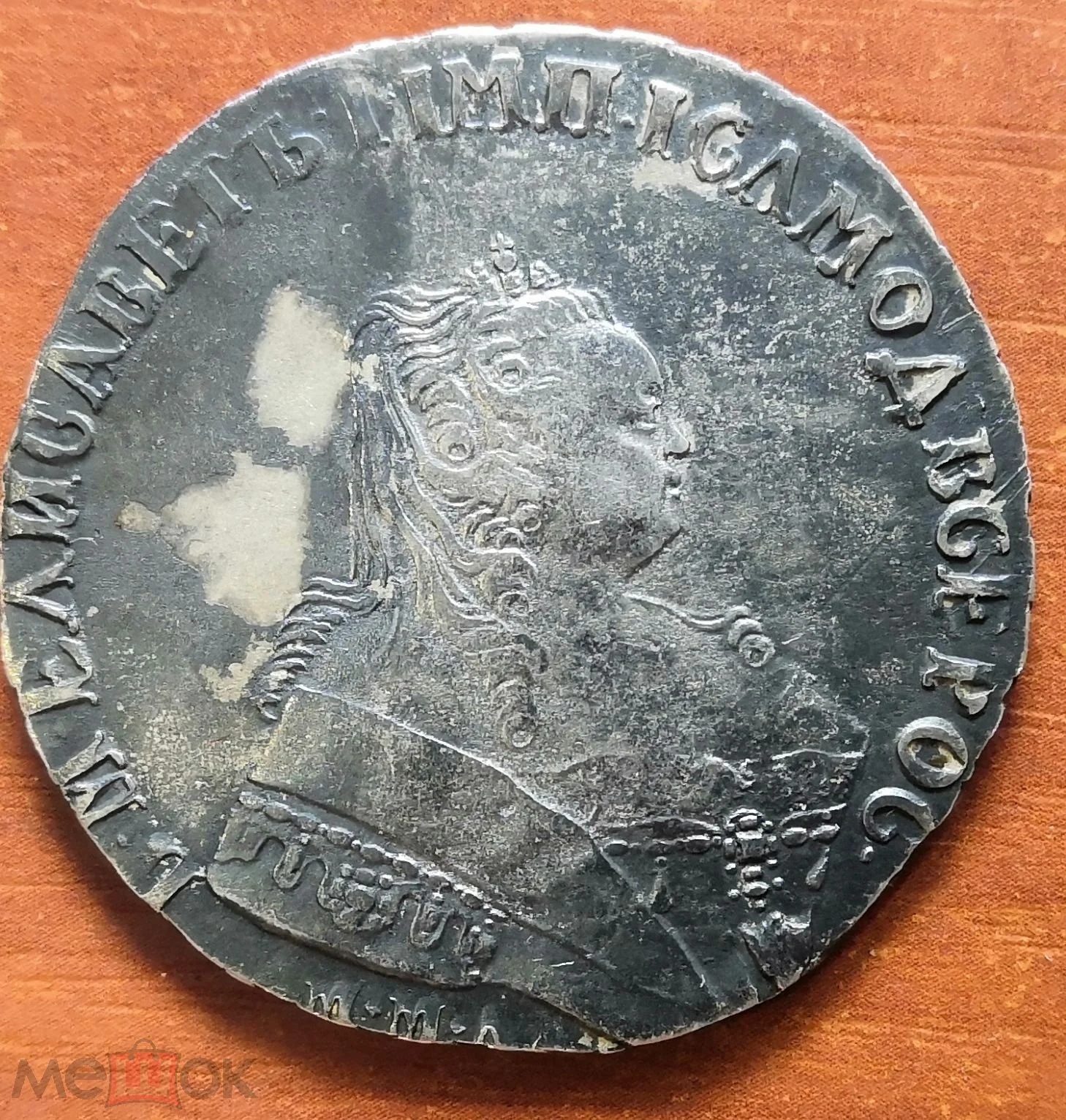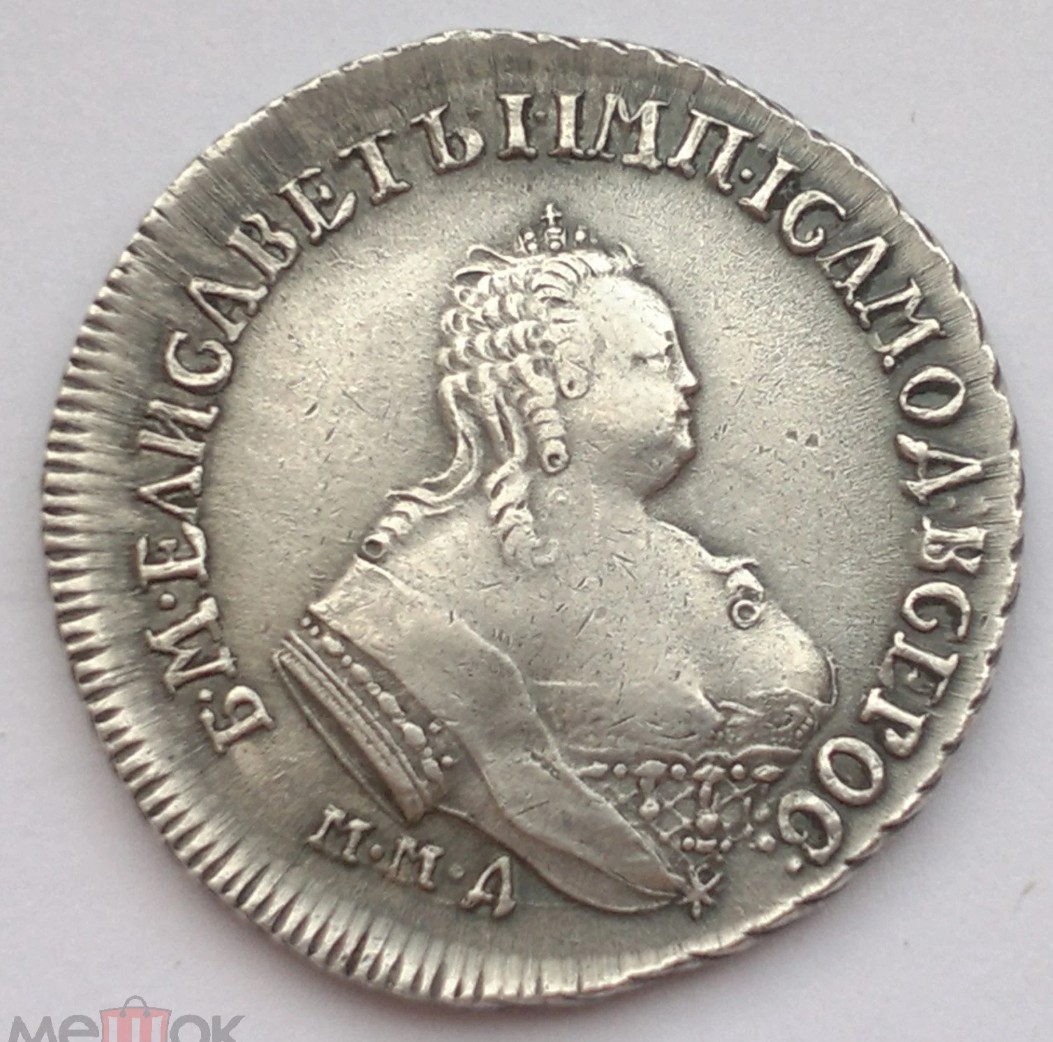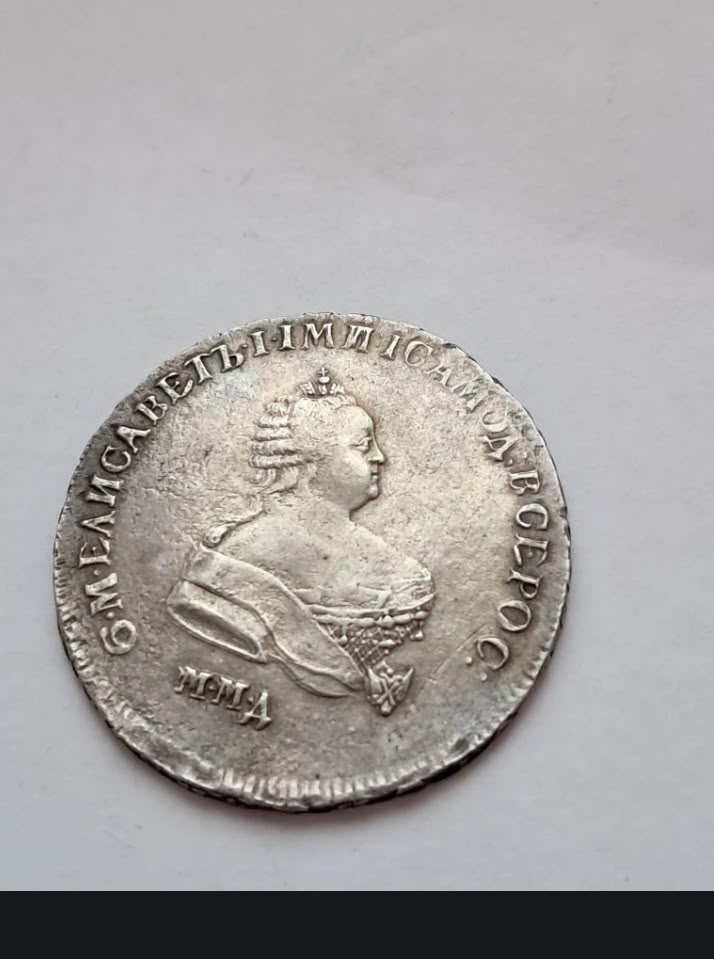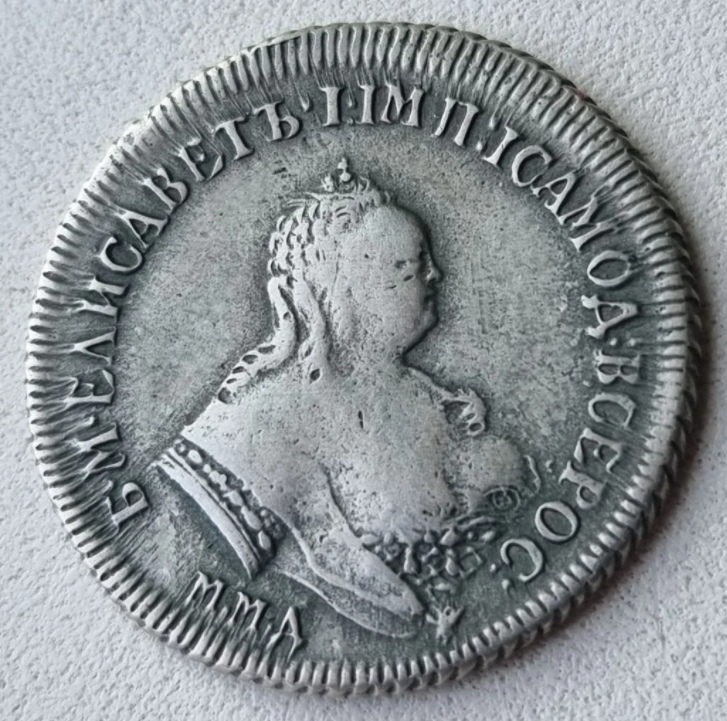 Монета представляет собой копию серебряного рубля 1744 года, отчеканенного при императрице Елизавете Петровне на Московском монетном дворе (ММД). Оригинальные монеты этого типа высоко ценятся коллекционерами. В данном случае, как указано в посте, это подделка, созданная для обмана нумизматов.