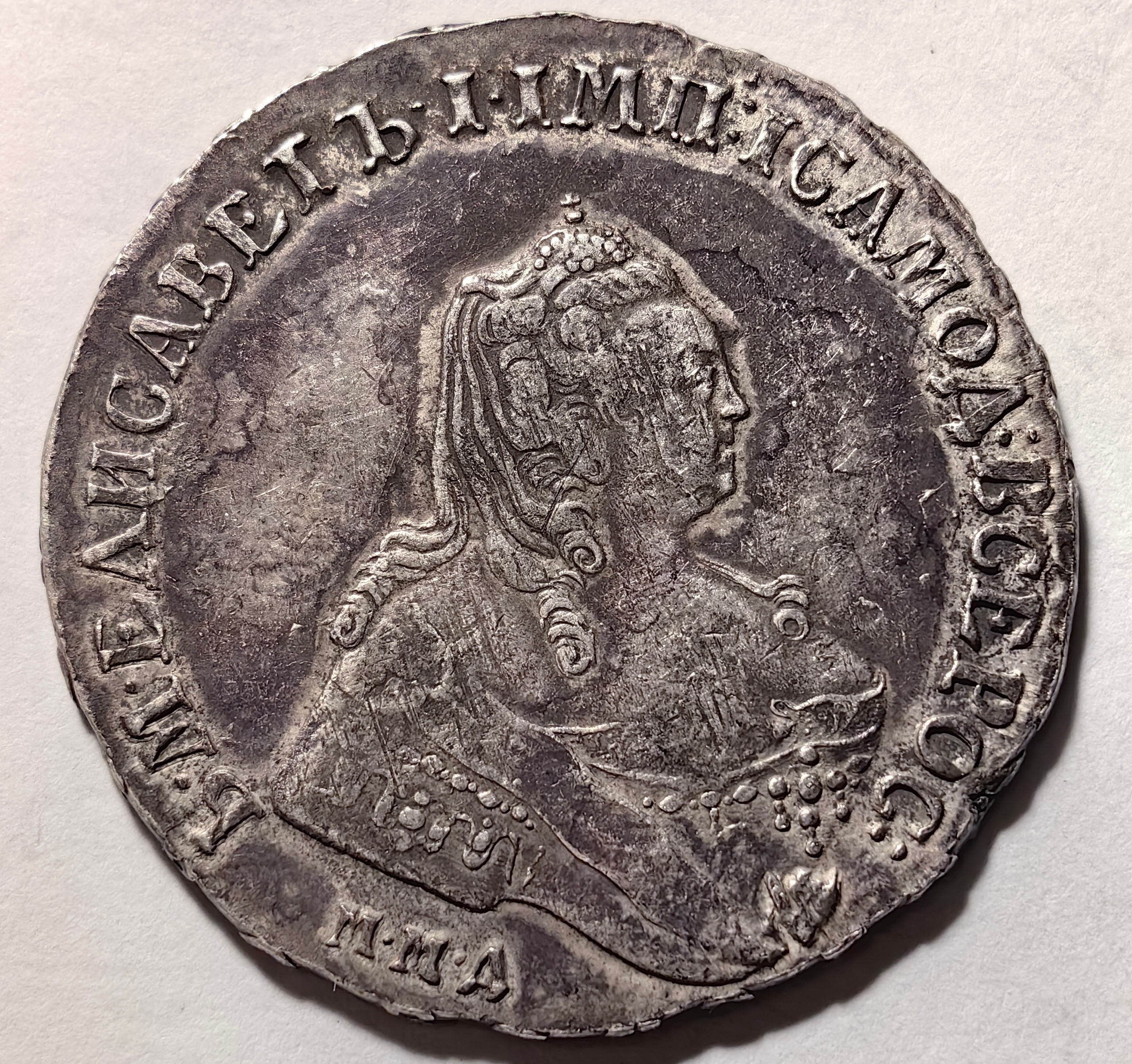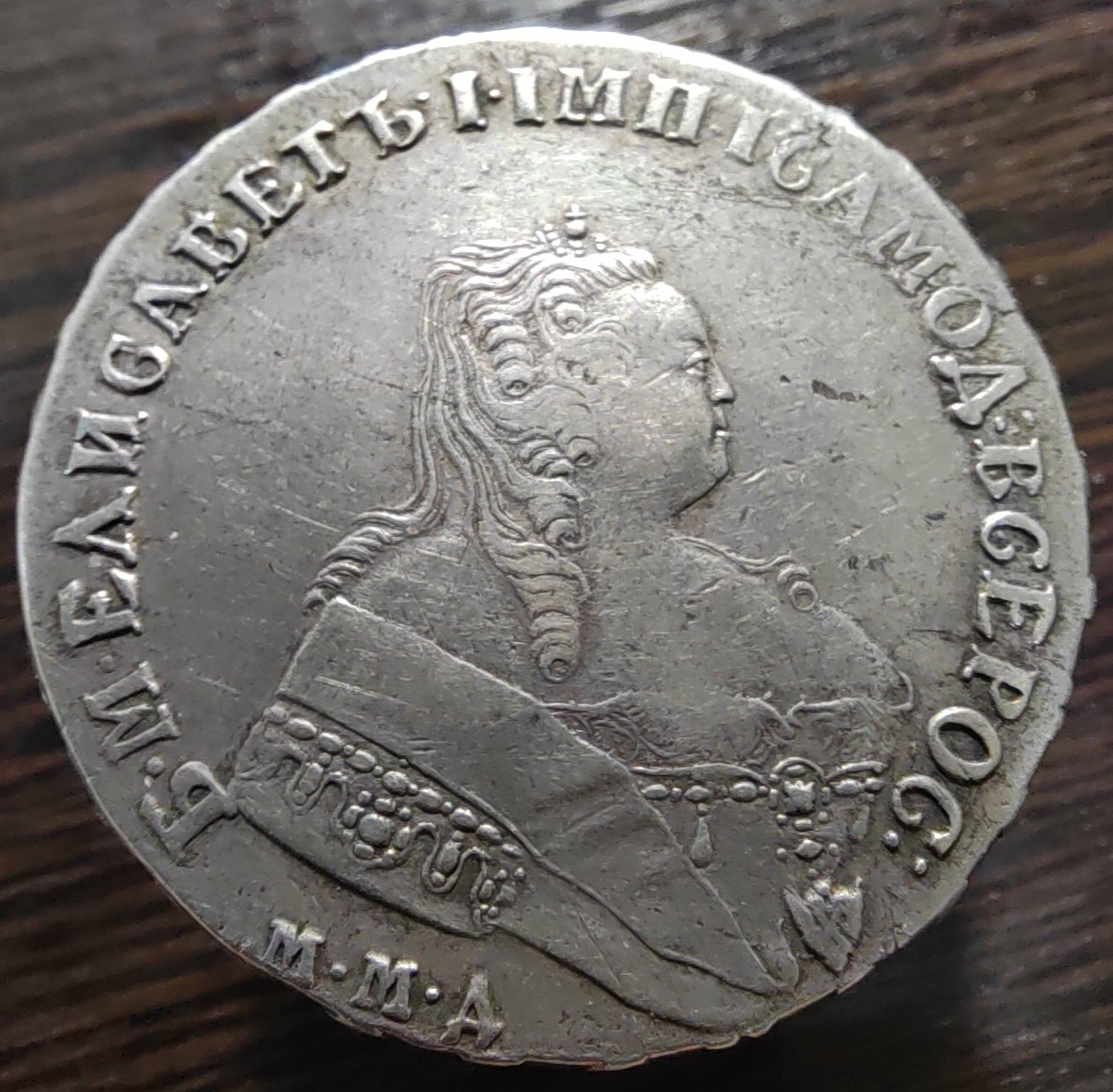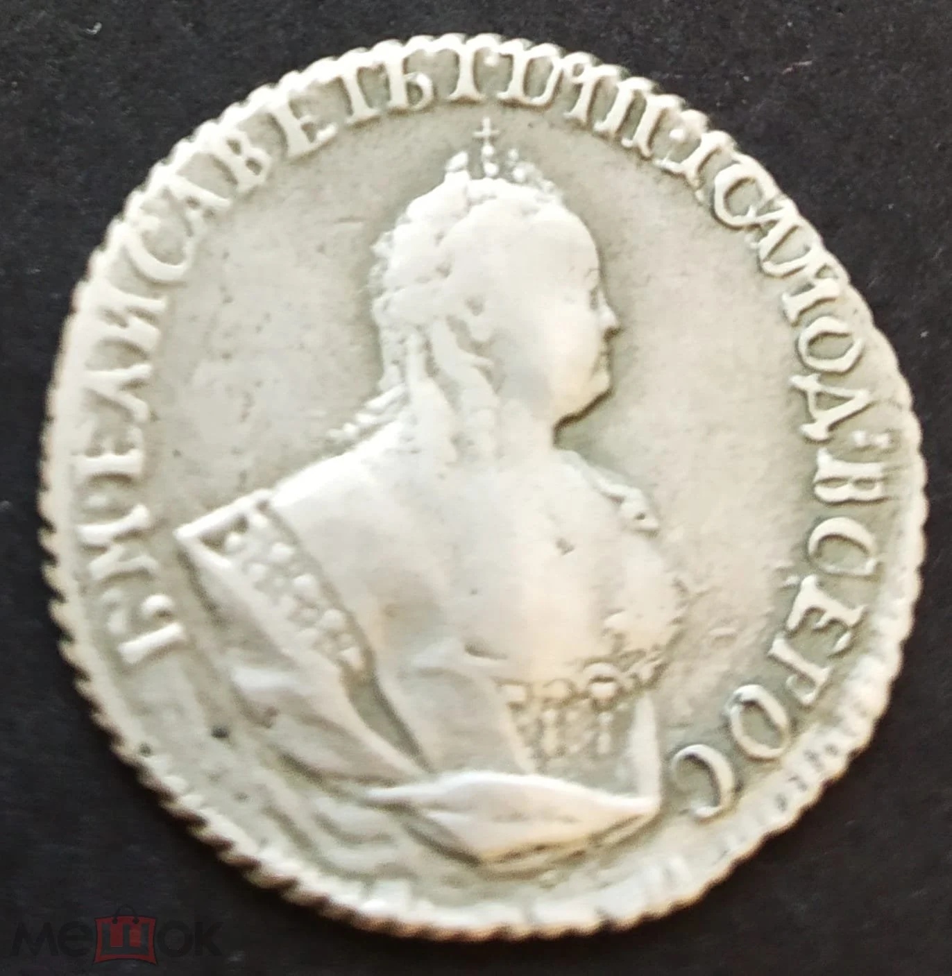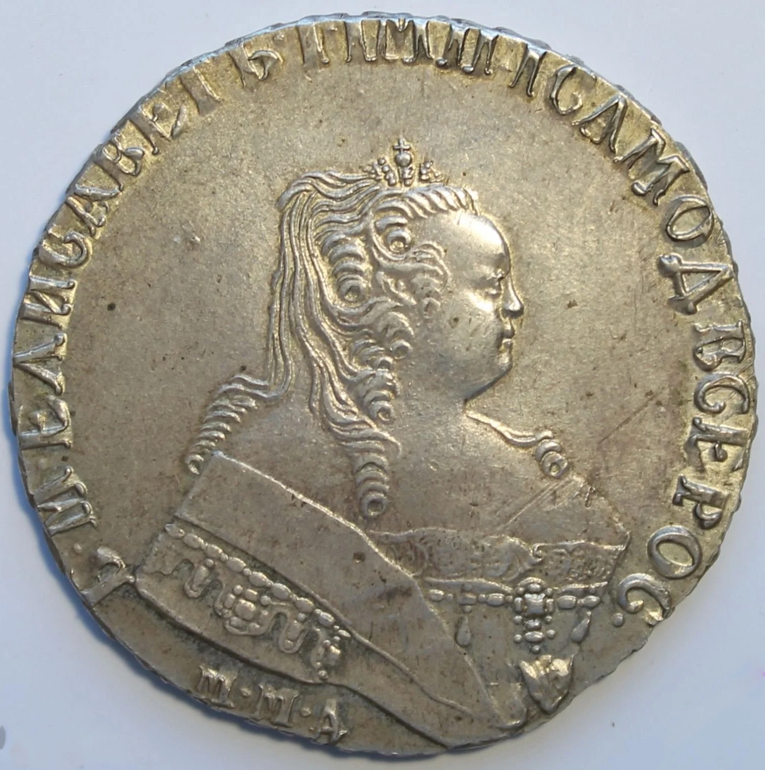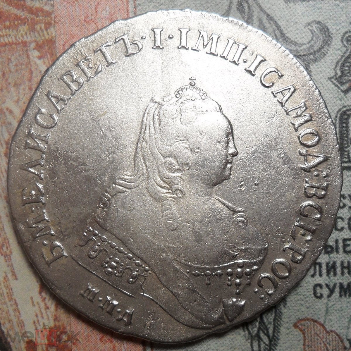 Монета представляет собой копию серебряного рубля 1744 года, отчеканенного при императрице Елизавете Петровне на Московском монетном дворе (ММД). Оригинальные монеты этого типа высоко ценятся коллекционерами. В данном случае, как указано в посте, это подделка, созданная для обмана нумизматов.