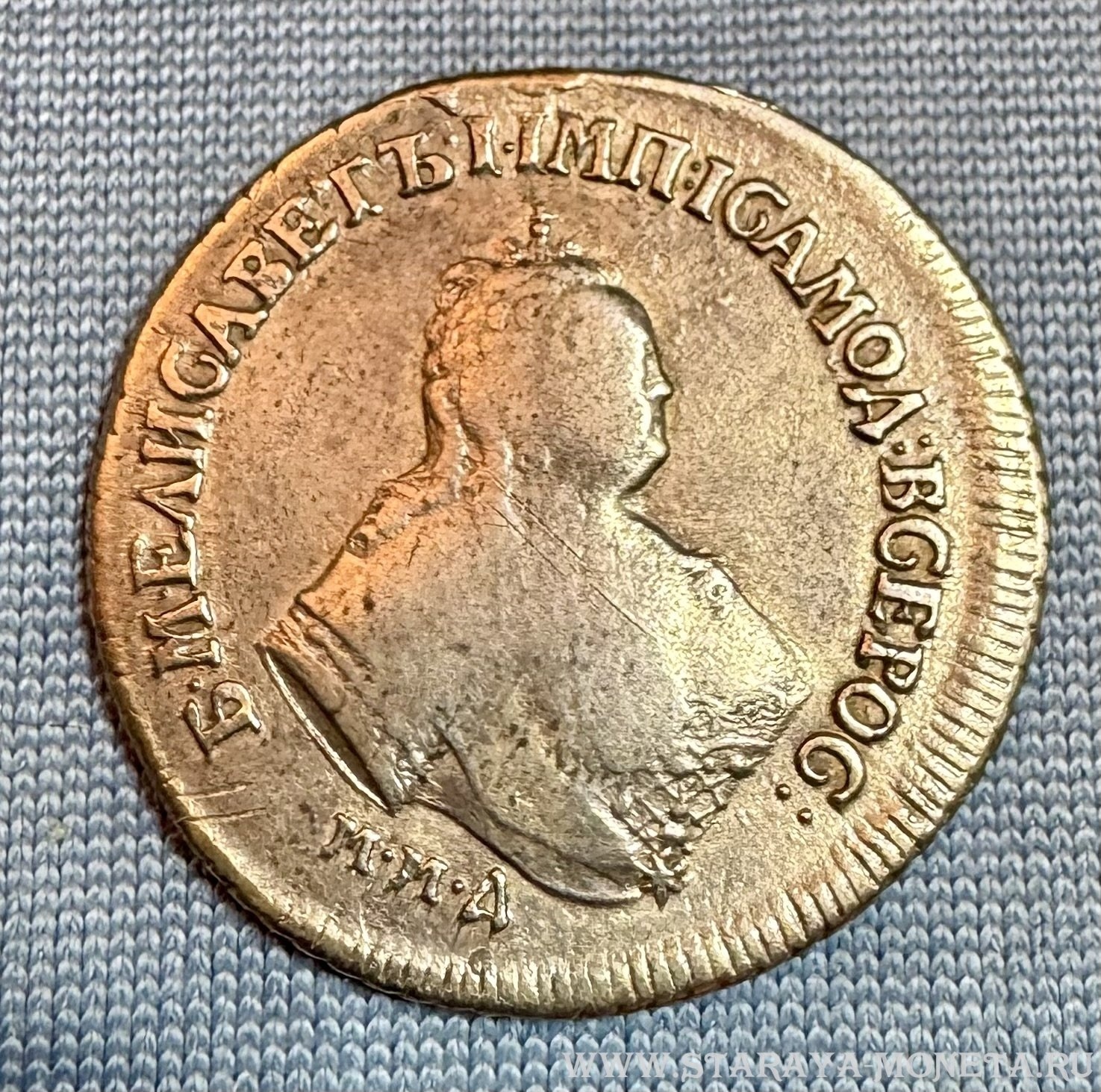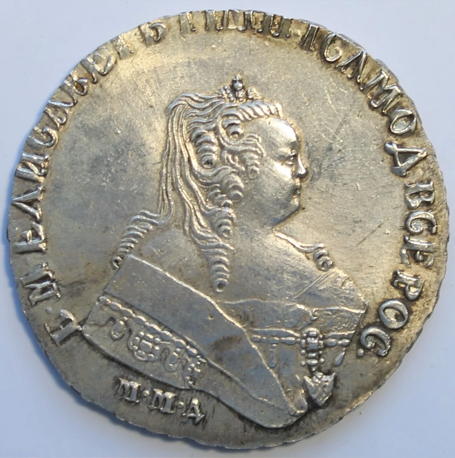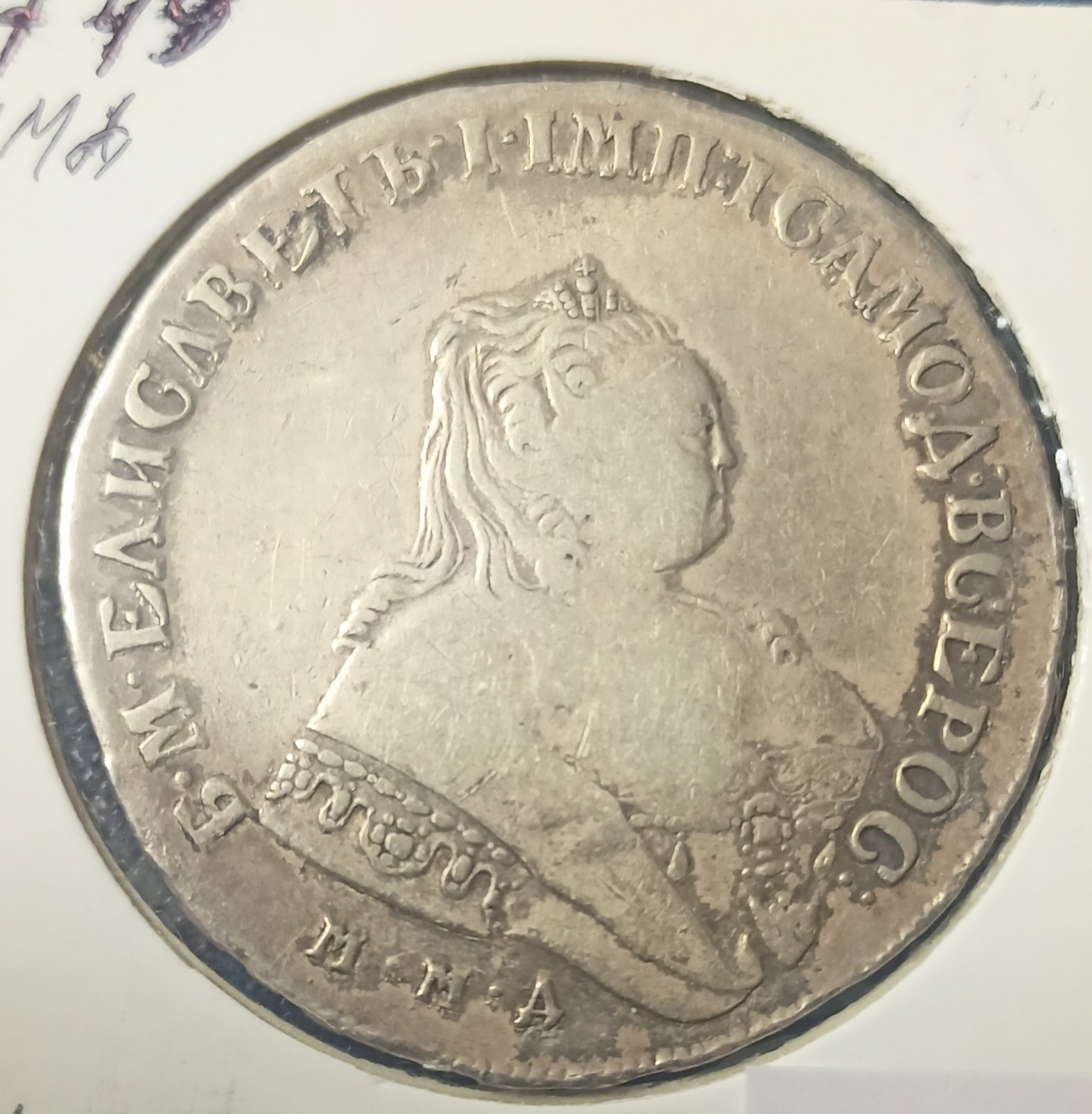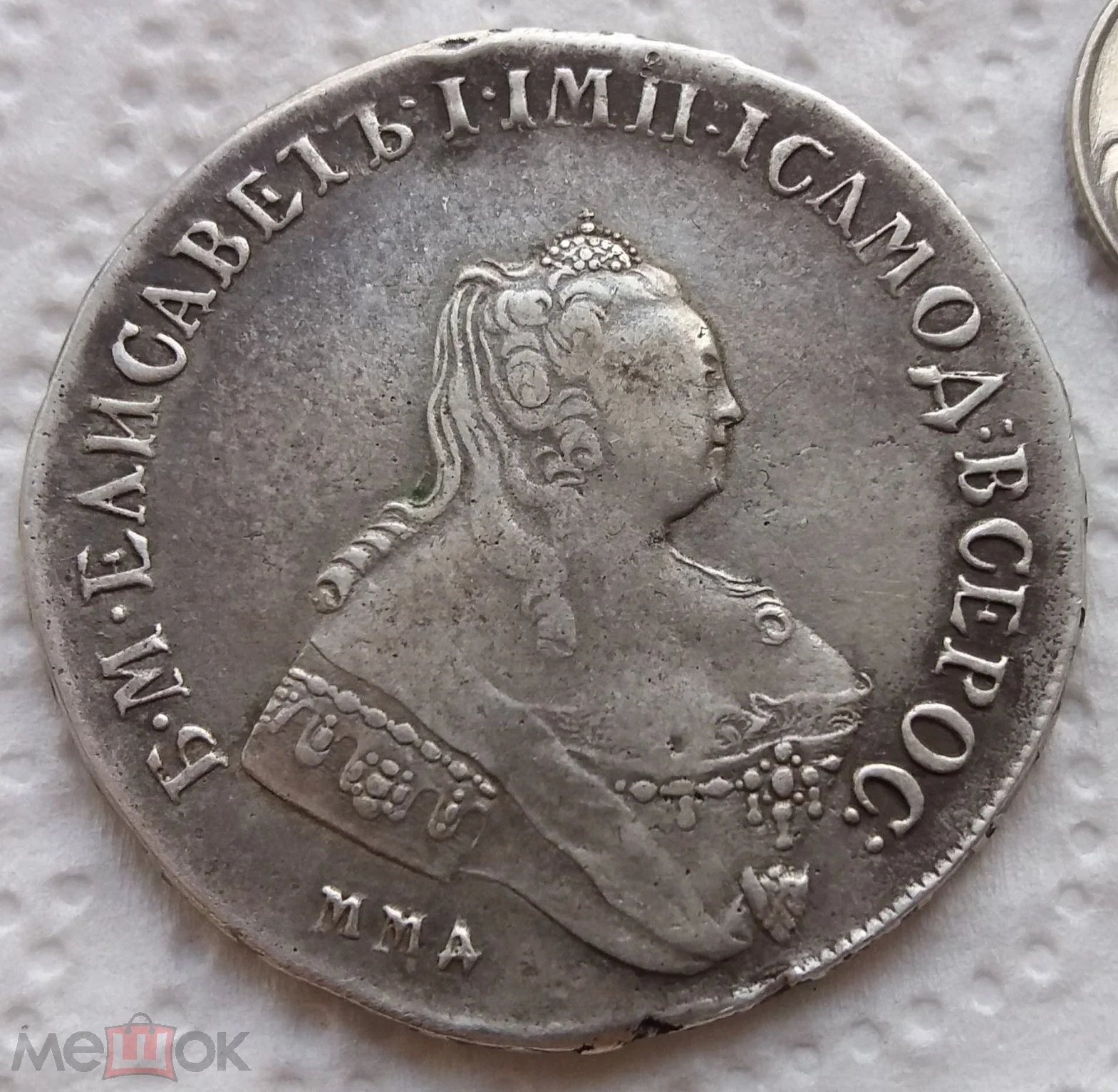 Монета представляет собой копию серебряного рубля 1744 года, отчеканенного при императрице Елизавете Петровне на Московском монетном дворе (ММД). Оригинальные монеты этого типа высоко ценятся коллекционерами. В данном случае, как указано в посте, это подделка, созданная для обмана нумизматов.