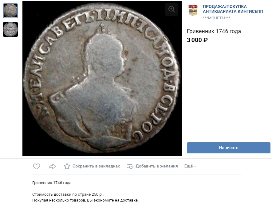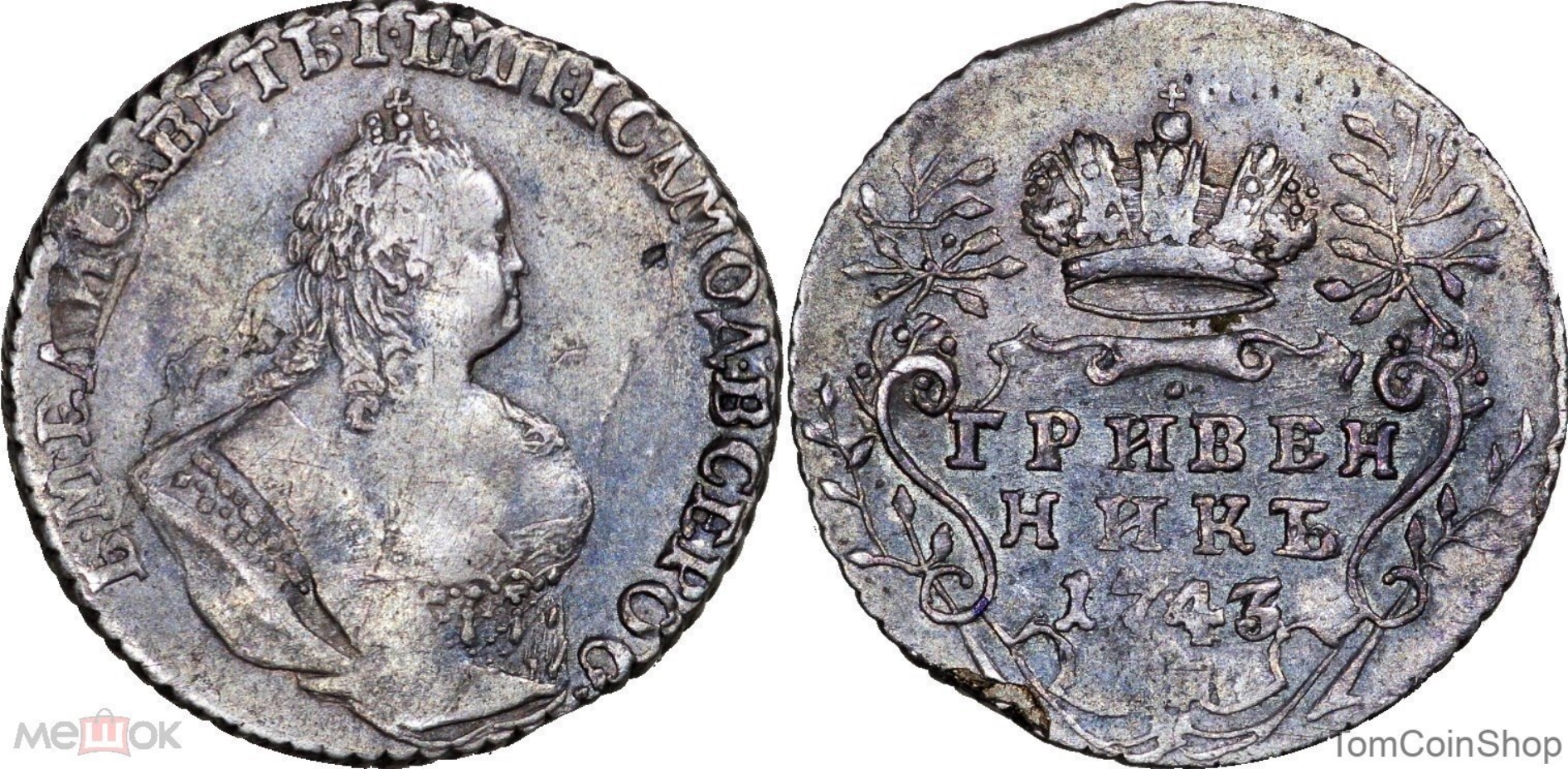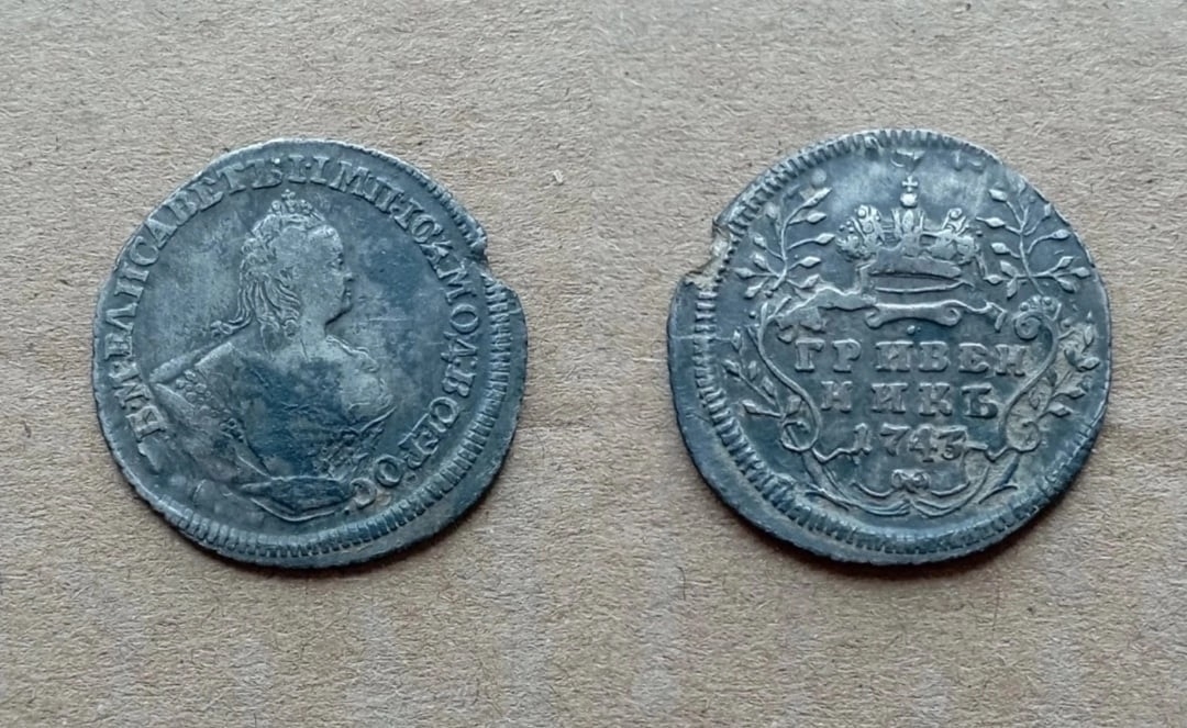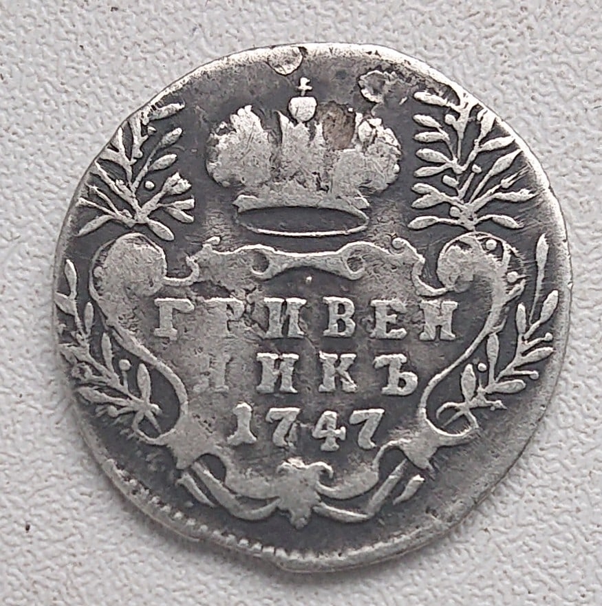 Монета представляет собой копию серебряного гривенника (10 копеек) Российской Империи 1743 года, отчеканенного в правление императрицы Елизаветы Петровны. Оригинальные монеты этого типа имеют высокую коллекционную ценность. Представленный экземпляр является современной литой подделкой, что отмечено как в описании поста, так и в комментариях сообщества.