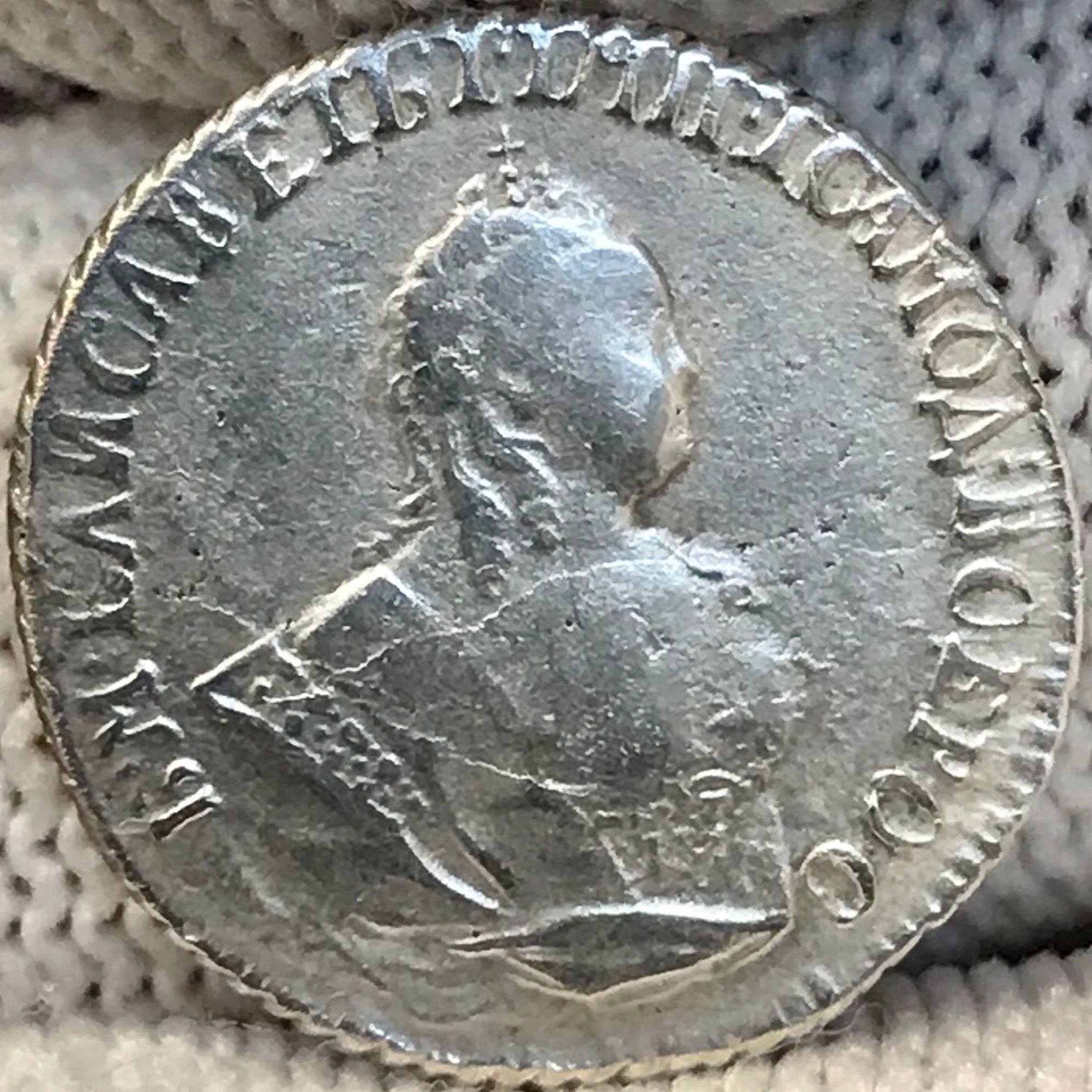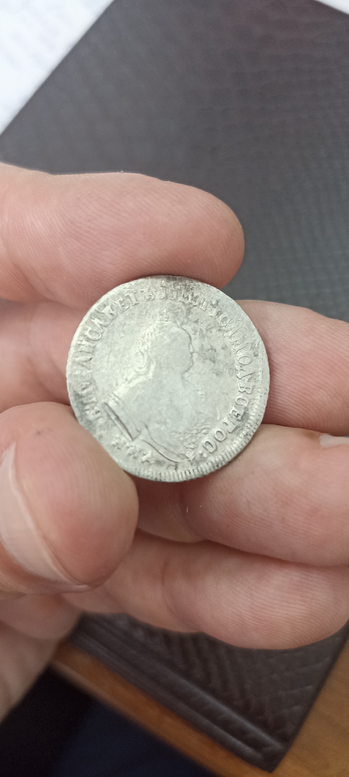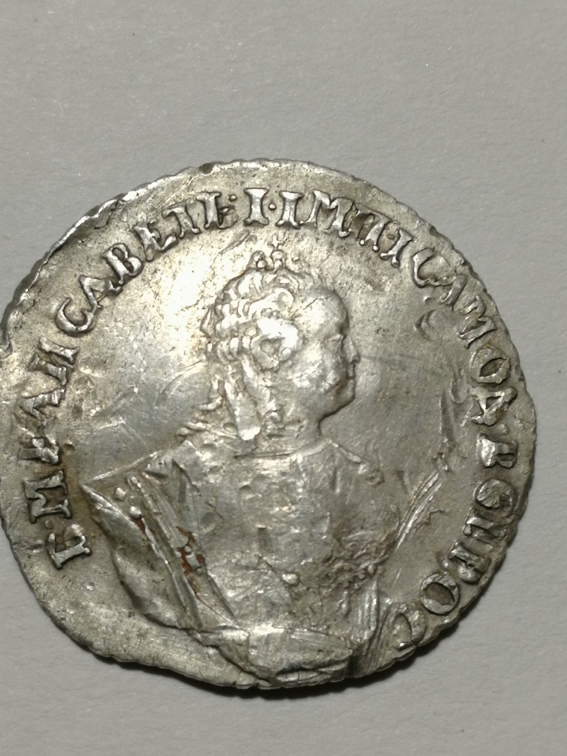 Монета представляет собой копию серебряного гривенника (10 копеек) Российской Империи 1743 года, отчеканенного в правление императрицы Елизаветы Петровны. Оригинальные монеты этого типа имеют высокую коллекционную ценность. Представленный экземпляр является современной литой подделкой, что отмечено как в описании поста, так и в комментариях сообщества.