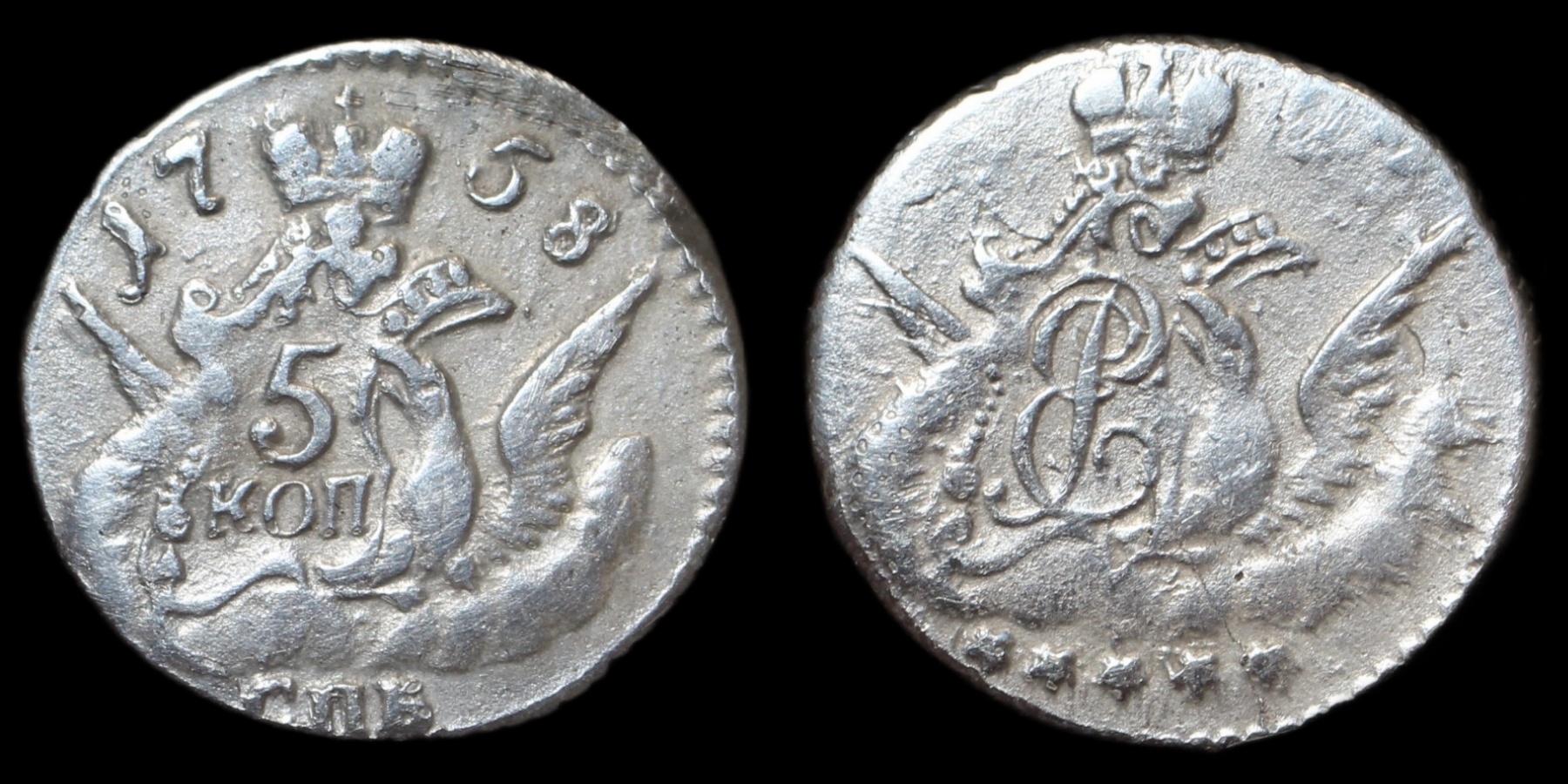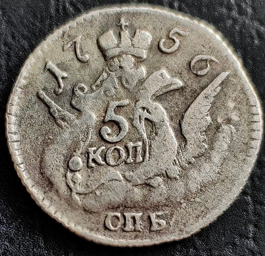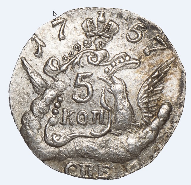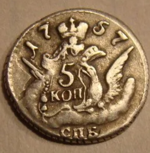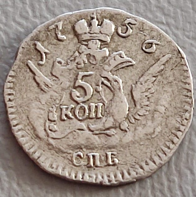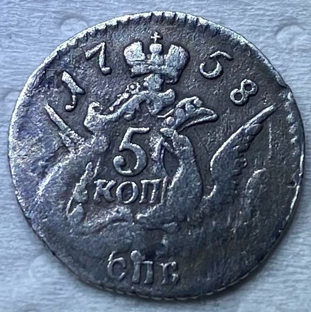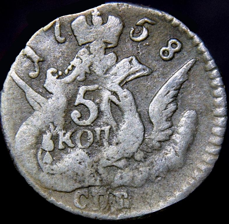 5 копеек 1758 года СПБ — поддельная монета Елизаветы Петровны