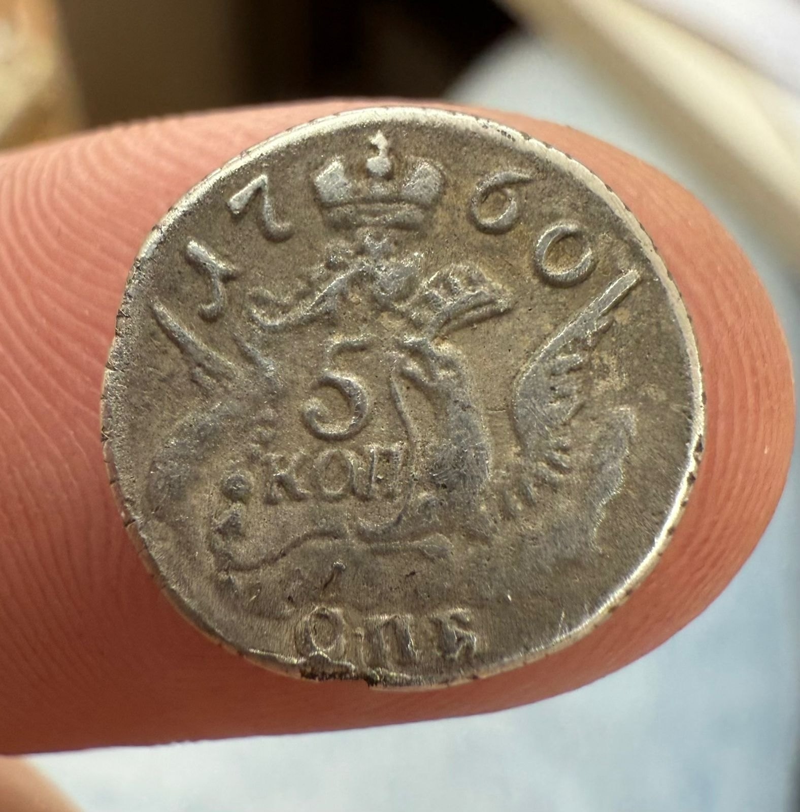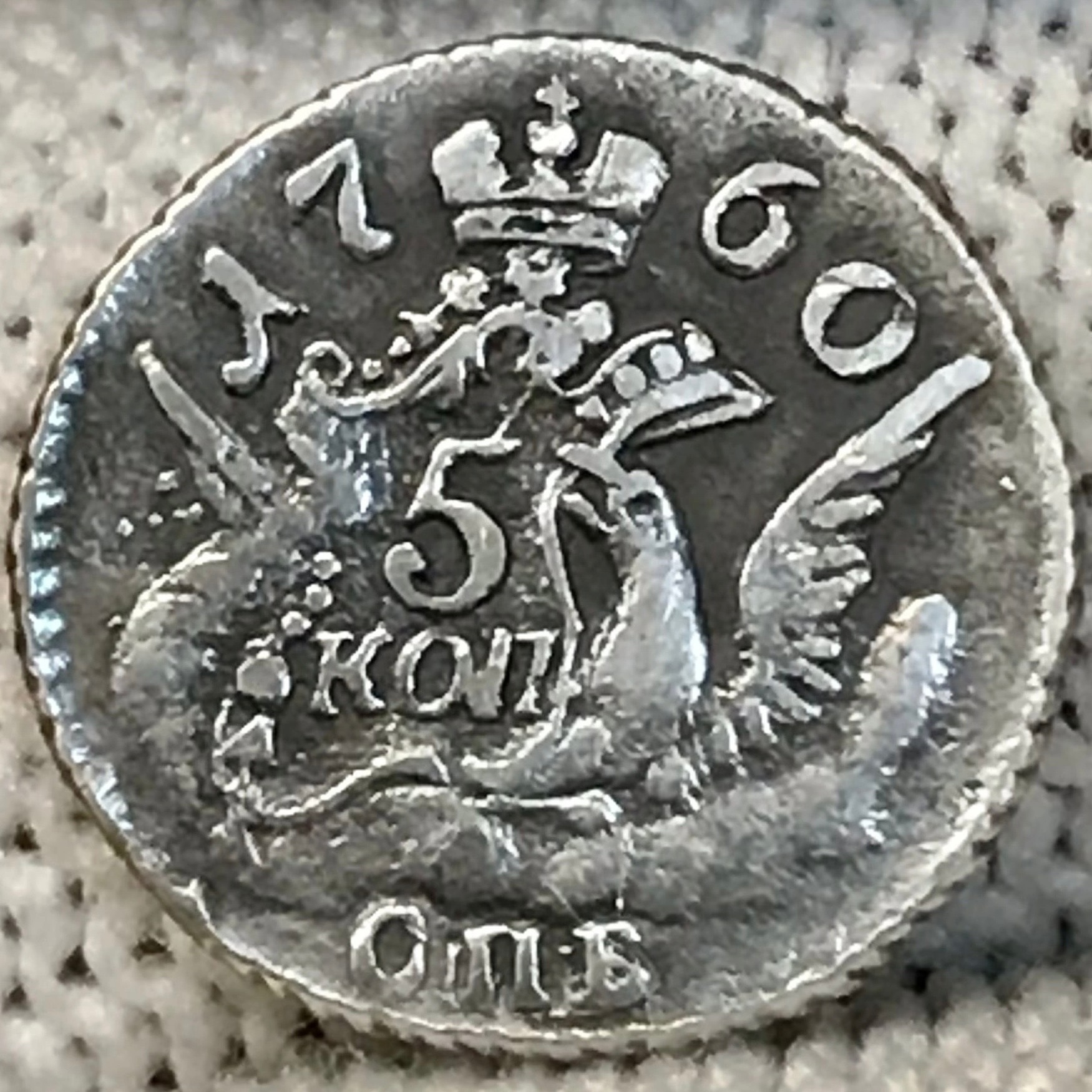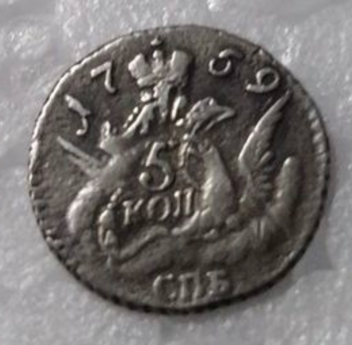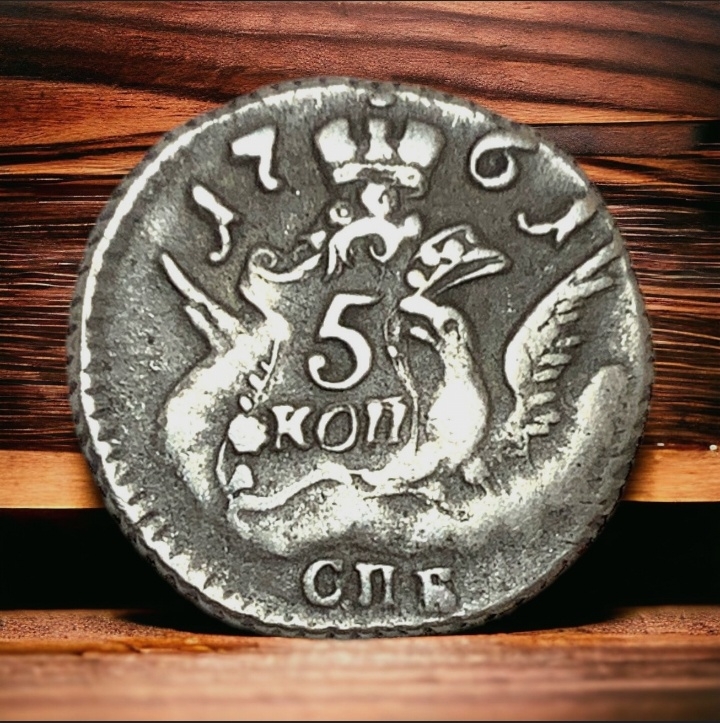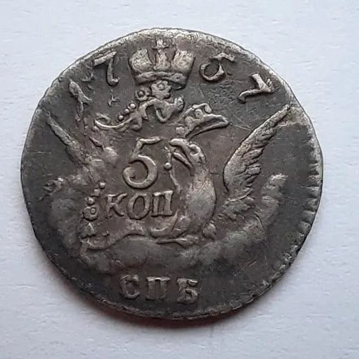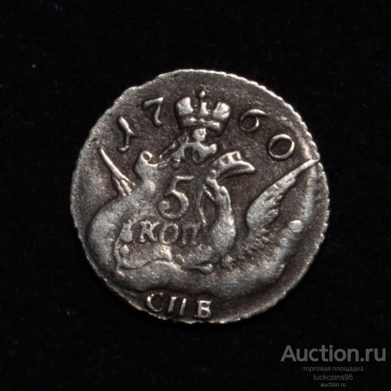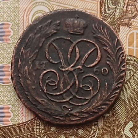 Монета номиналом 5 копеек 1760 года, отчеканенная при императрице Елизавете Петровне на Санкт-Петербургском монетном дворе (обозначение «СПБ»). В оригинале это крупная медная монета, выпускавшаяся в период с 1757 по 1762 год. Представленный экземпляр является копией, о чём прямо указано в описании поста.