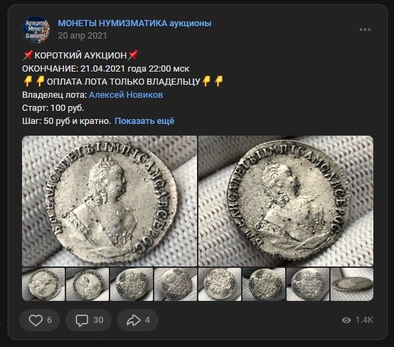 Монета представляет собой копию серебряного рубля 1741 года, выпущенного в начале правления императрицы Елизаветы Петровны. Оригинальные экземпляры этого года чеканки редки и высоко ценятся коллекционерами. В посте прямо указано, что это копия, что делает её непригодной для серьёзной коллекции подлинников.