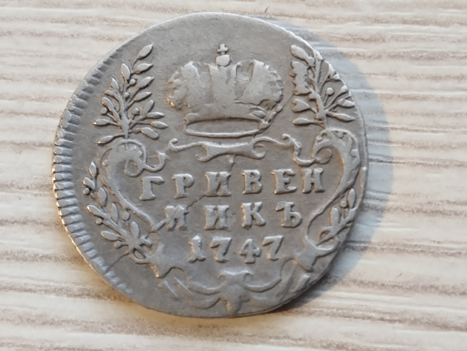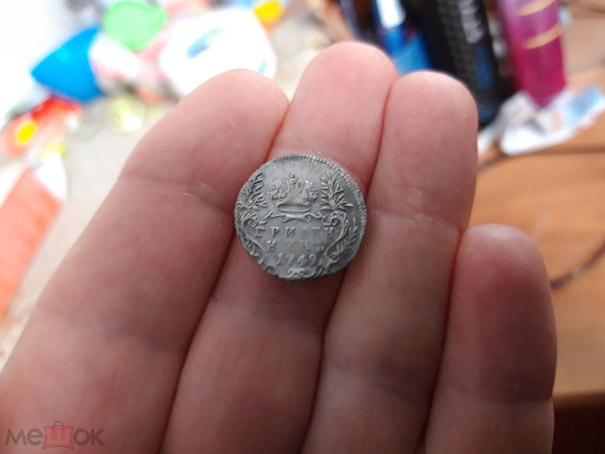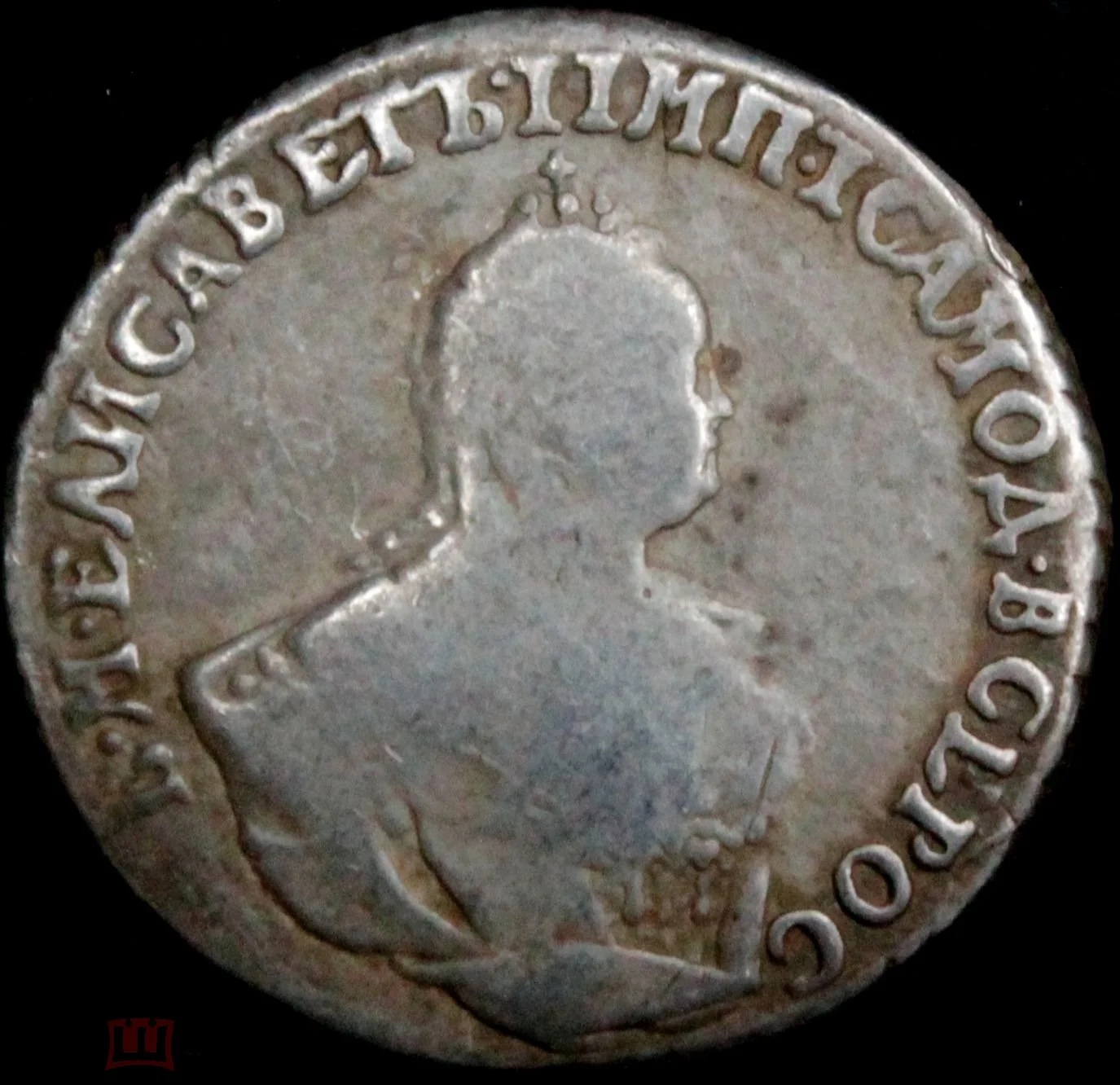 Гривенник 1744 года Елизаветы Петровны — подлинная, но потёртая монета