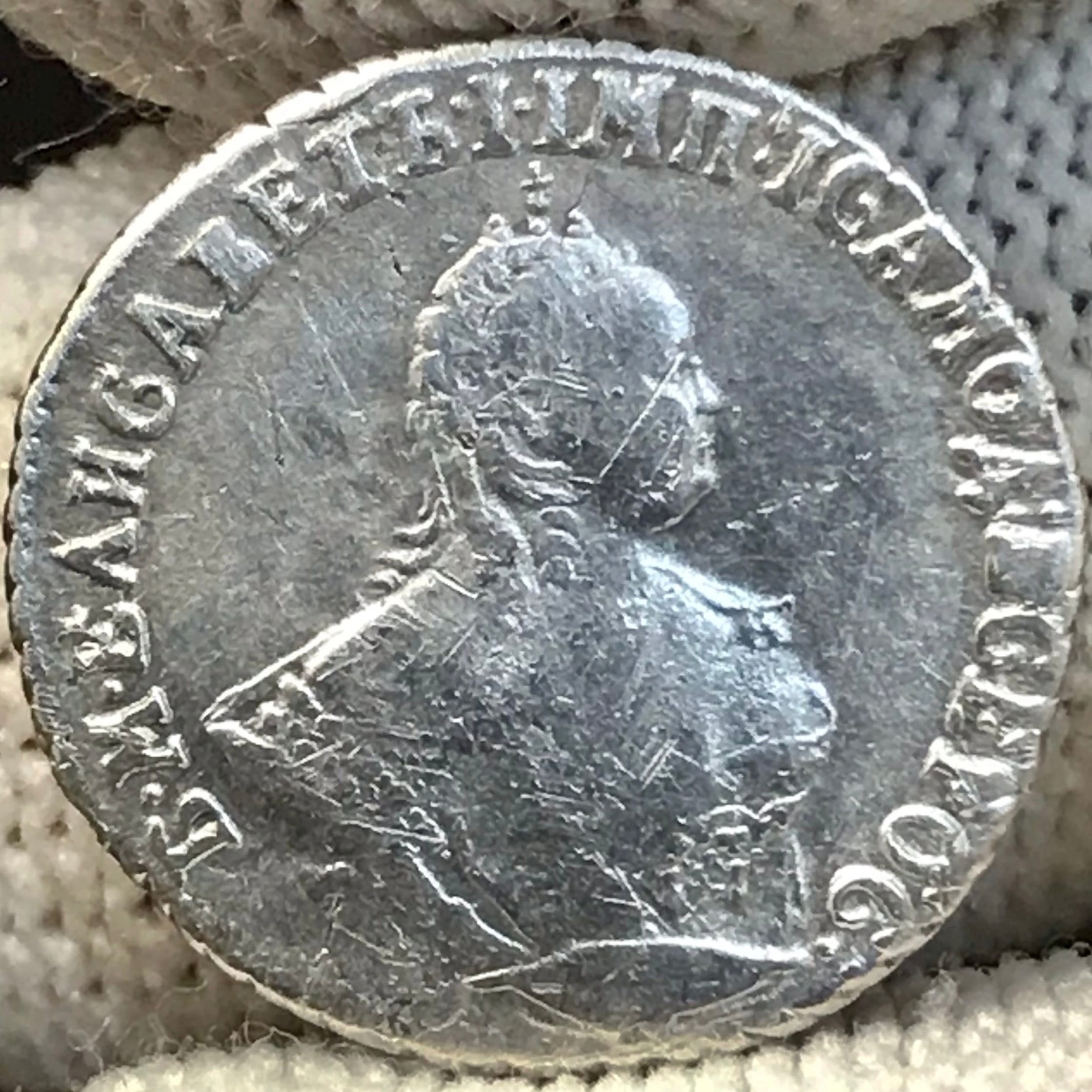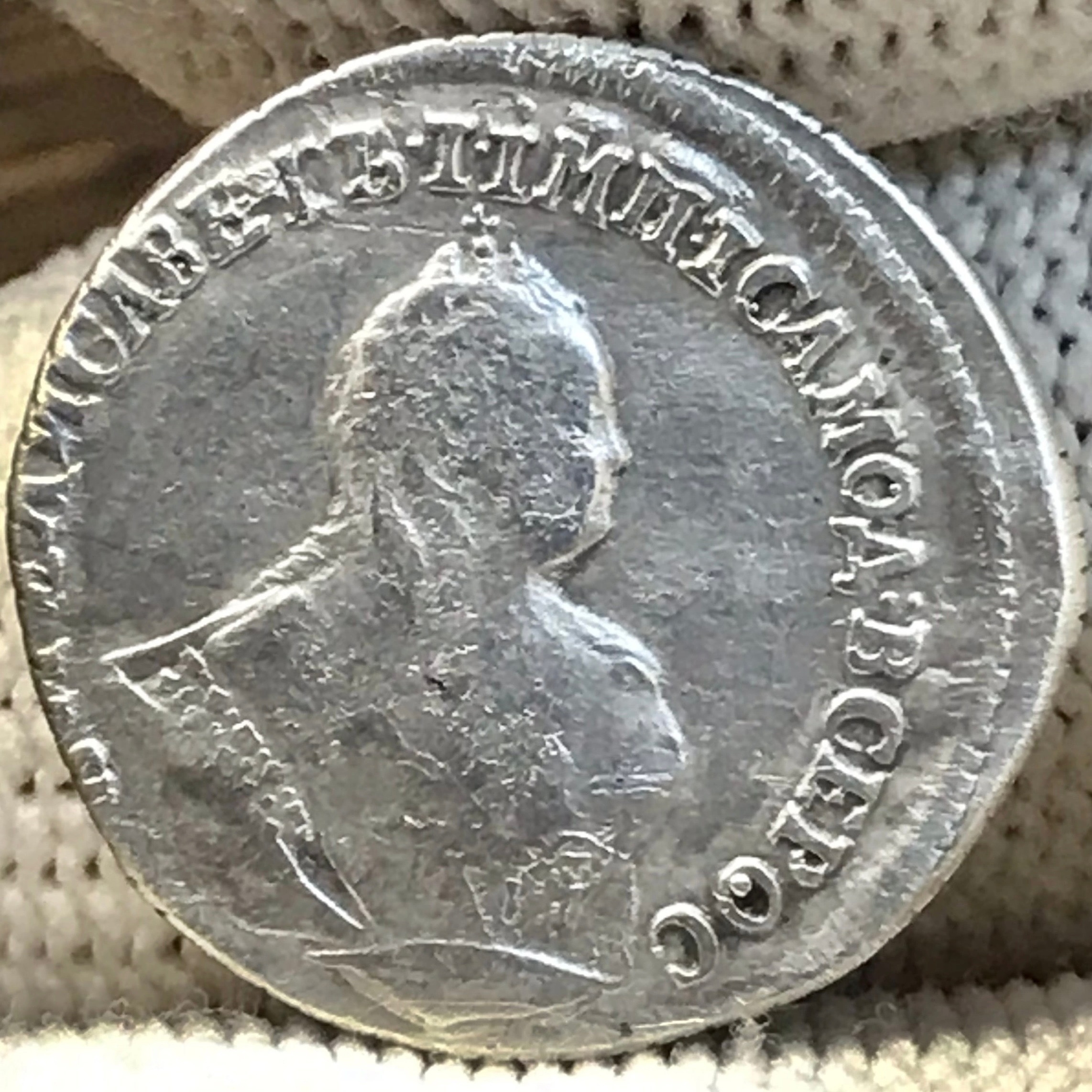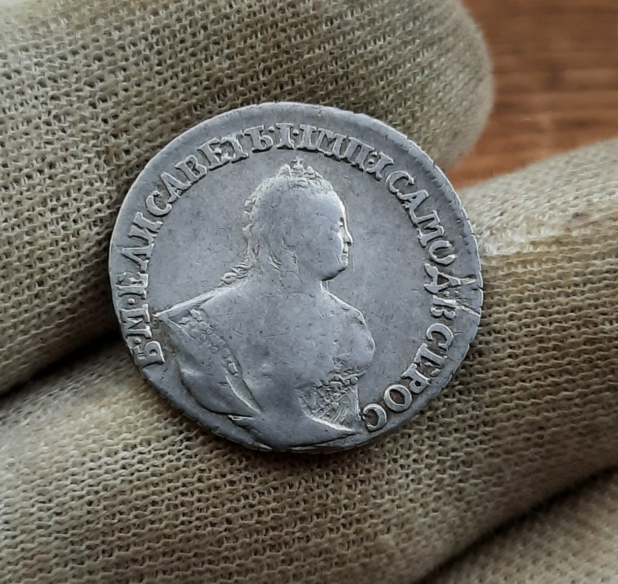 Гривенник 1744 года Елизаветы Петровны — подлинная, но потёртая монета