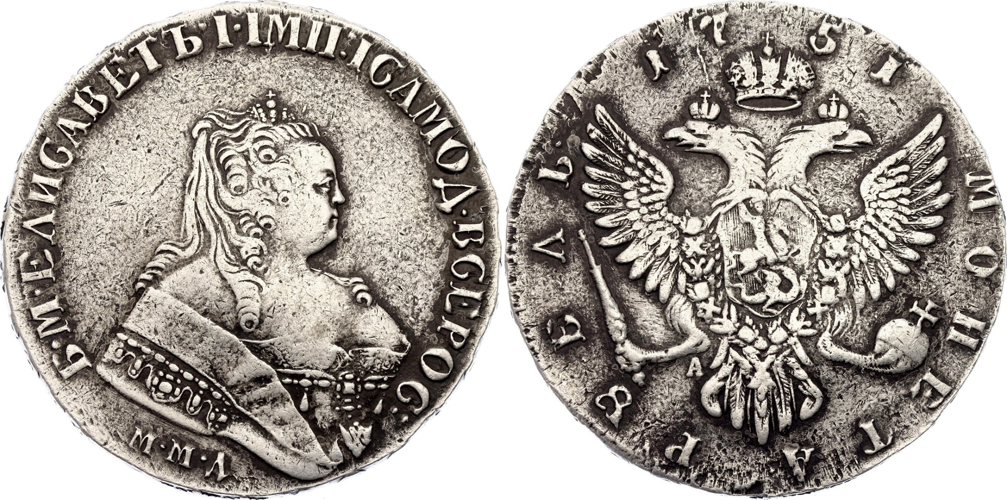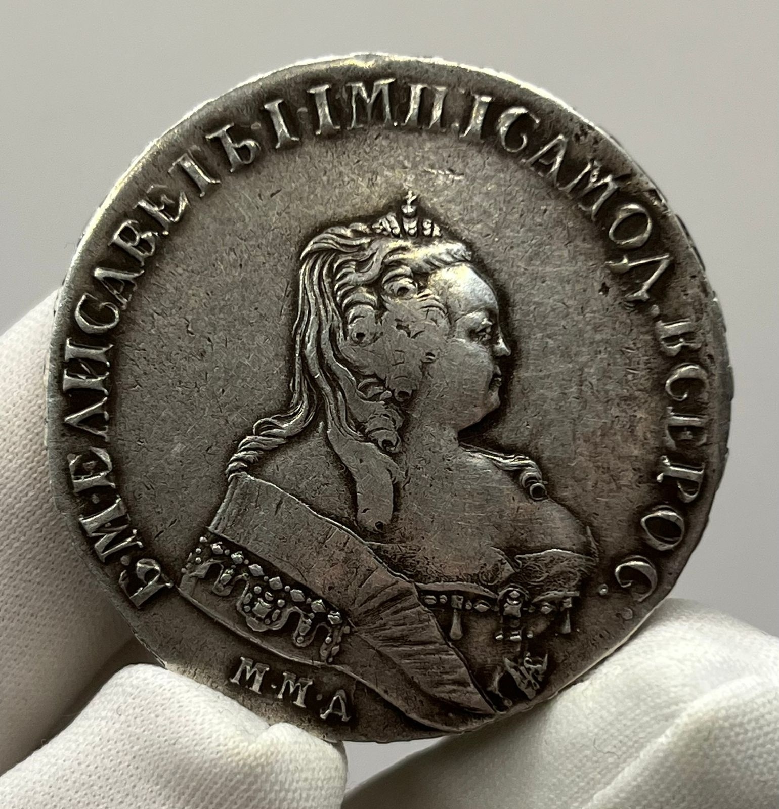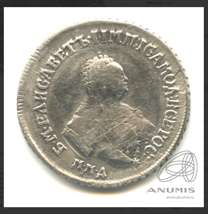 Представленная монета — рубль 1741 года с обозначением монетного двора ММД (Московская монета). Это фантазийная подделка, так как в 1741 году Московский монетный двор не чеканил серебряные рубли. Подлинные рубли этого периода чеканились исключительно на Санкт-Петербургском дворе. Монета является современной копией низкого качества.