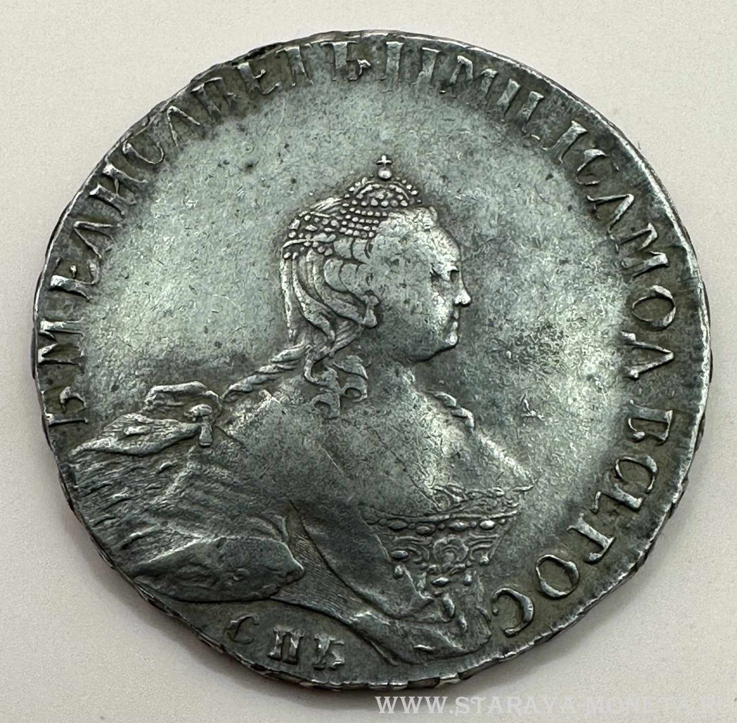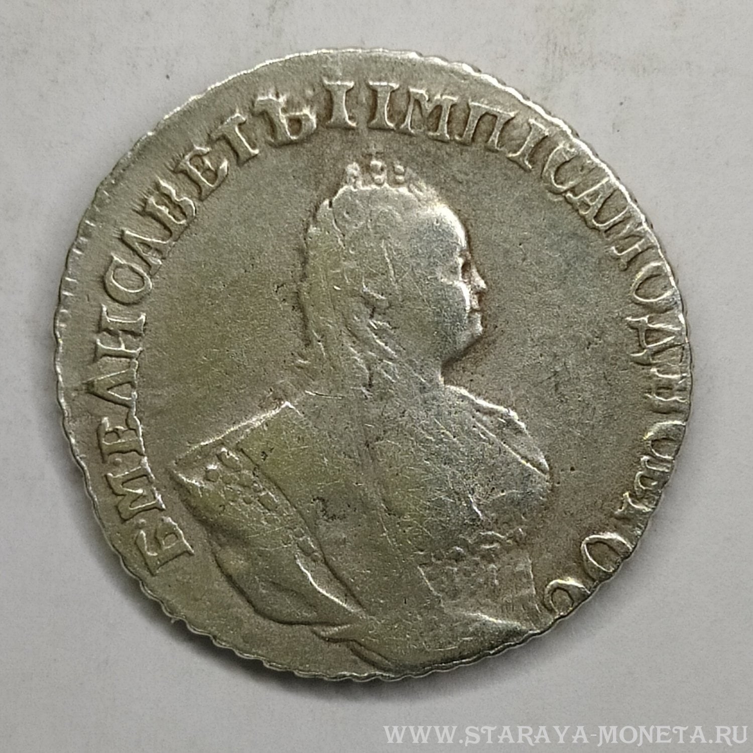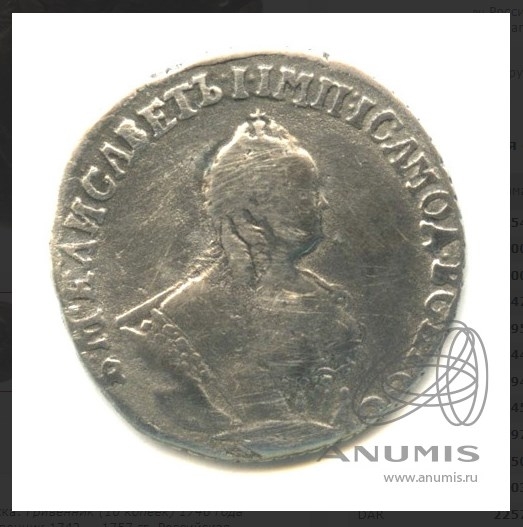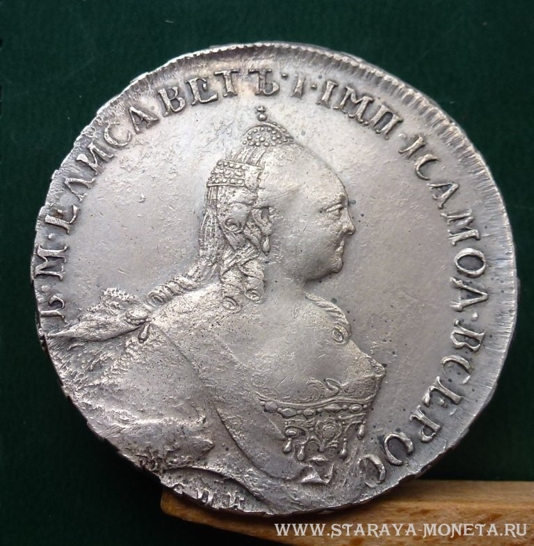 Монета представляет собой копию серебряного рубля 1759 года периода правления императрицы Елизаветы Петровны. Оригинальные рубли этого периода чеканились на Санкт-Петербургском монетном дворе и имеют высокую коллекционную ценность. В данном случае, как указано в посте, это подделка, не имеющая нумизматической ценности.