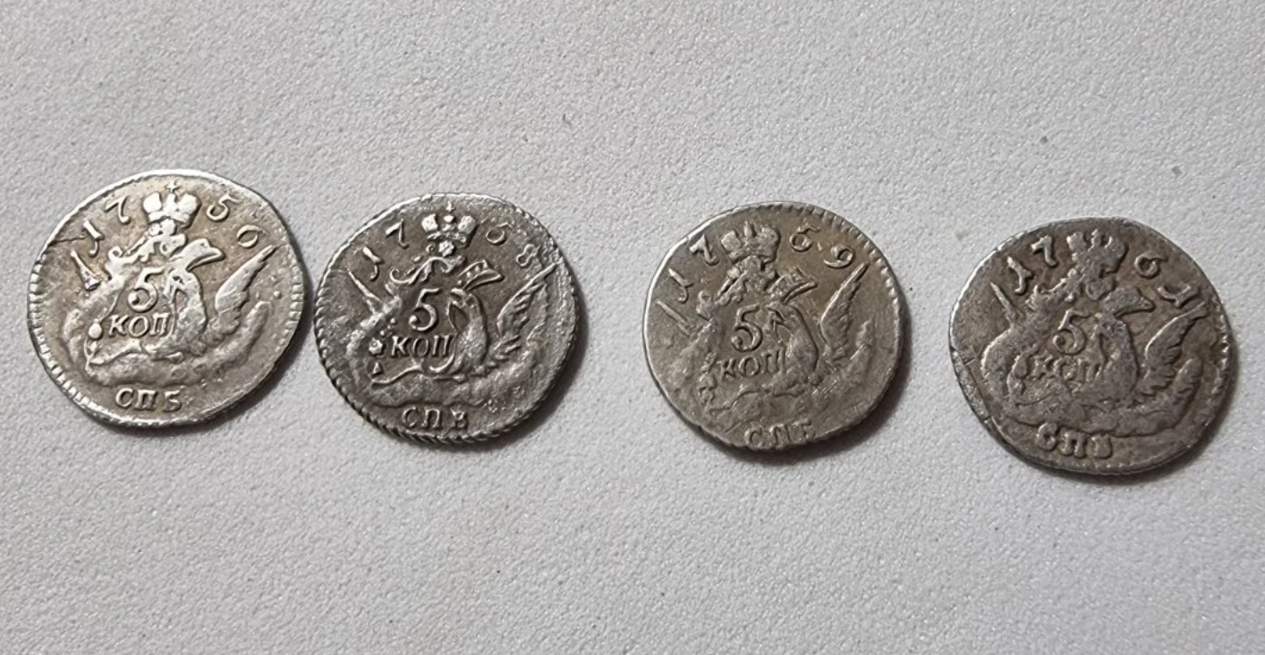 Монеты номиналом 5 копеек периода правления Елизаветы Петровны, известные среди коллекционеров как «облачники» (из-за характерного оформления облаков на реверсе). В посте представлены экземпляры 1756, 1758, 1759 и 1761 годов, которые являются современными подделками. Они не соответствуют оригинальным штемпелям по ключевым деталям, таким как расположение звёзд.