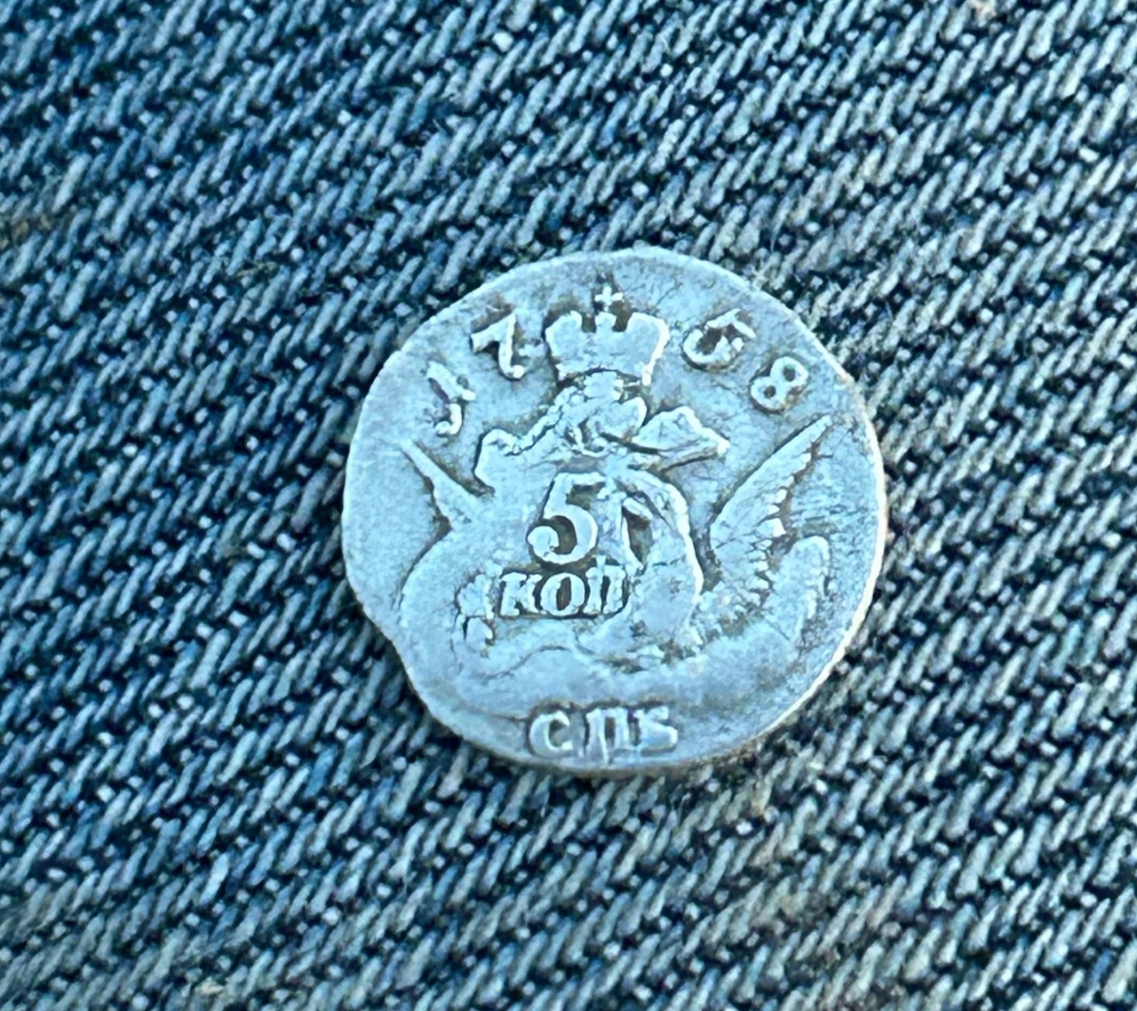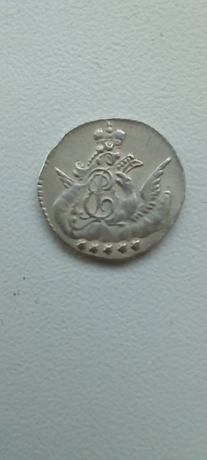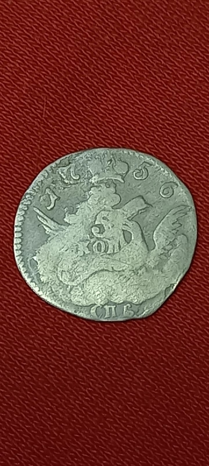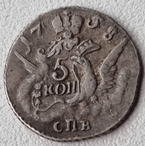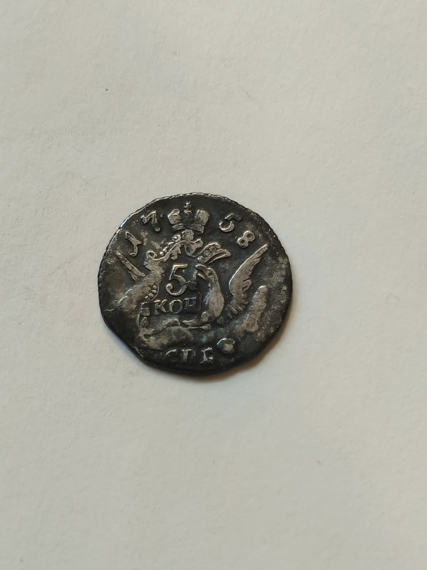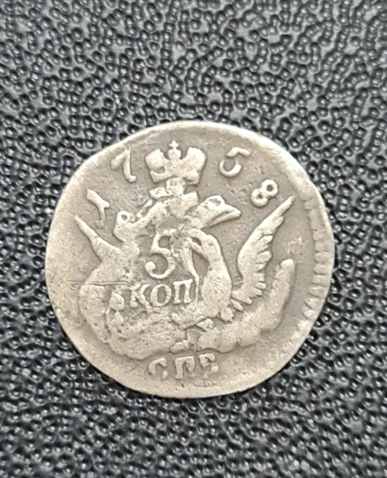 Монета номиналом 5 копеек 1758 года чеканки, отчеканенная в период правления императрицы Елизаветы Петровны. Оригинальные монеты этого типа чеканились из меди на Санкт-Петербургском монетном дворе. В данном случае монета является подделкой, о чём прямо указано в описании поста.
