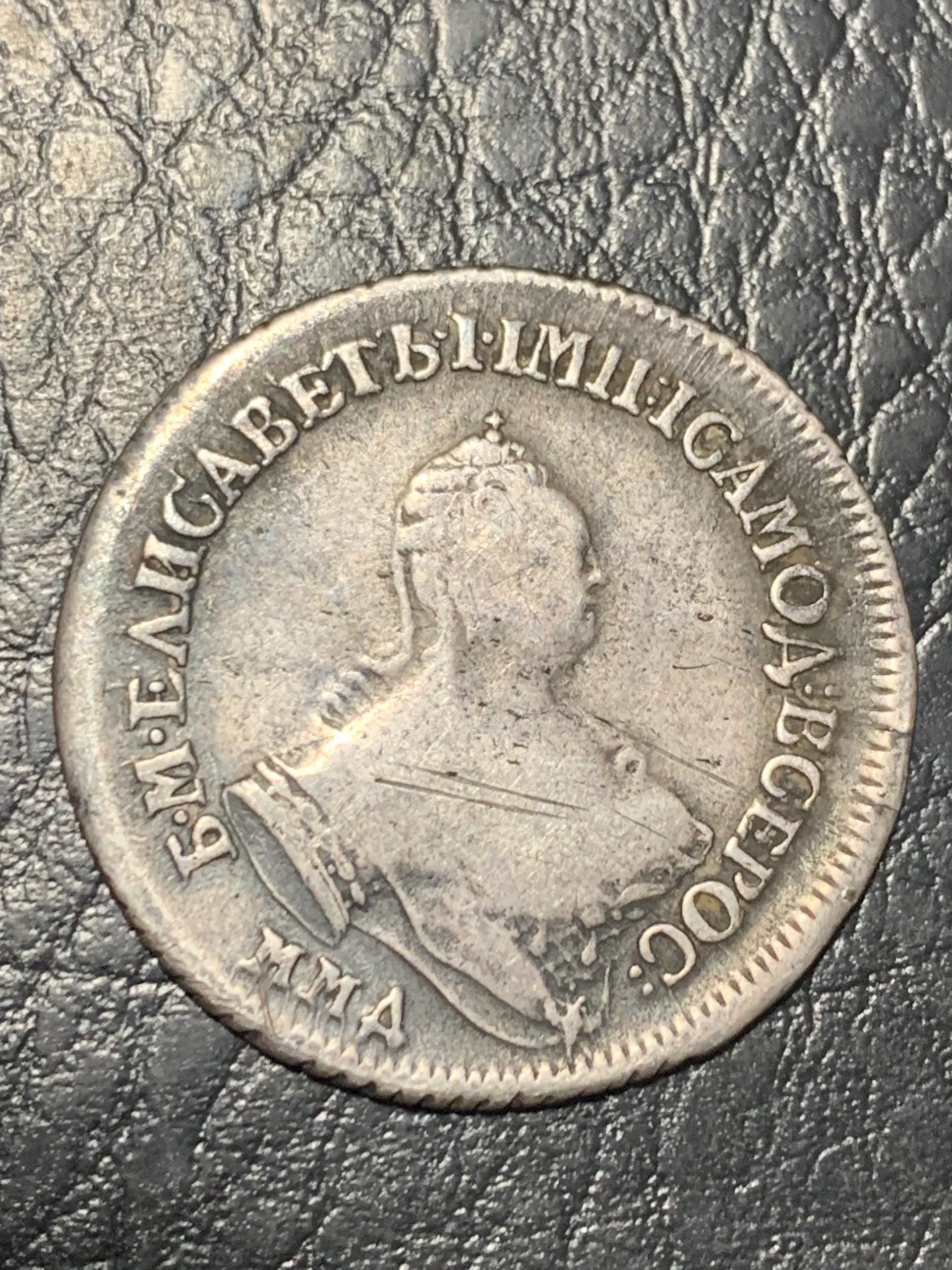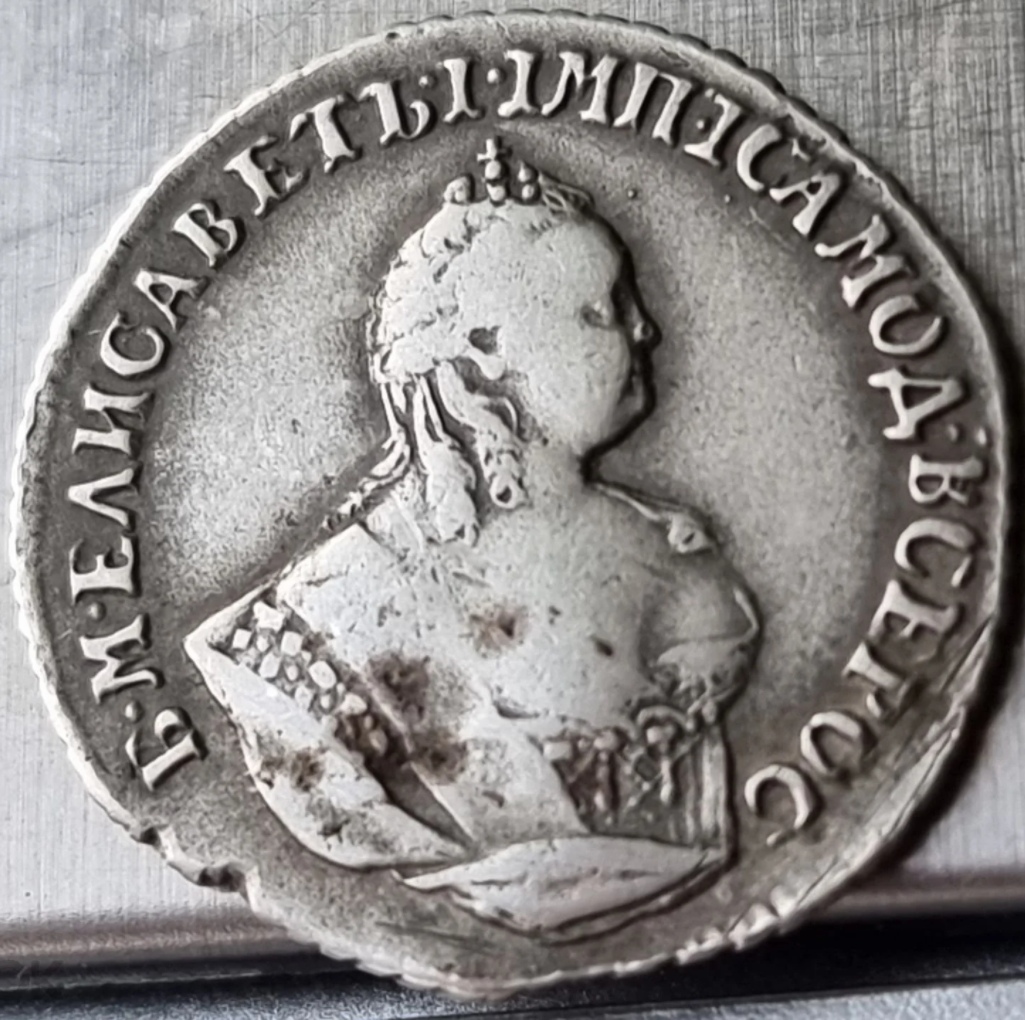 Монета представляет собой гривенник (10 копеек) времён правления императрицы Елизаветы Петровны, отчеканенный в 1744 году. Оригинальные монеты этого типа изготавливались из серебра. Представленный экземпляр является откровенной подделкой, о чём прямо указано в посте и подтверждено единодушным мнением сообщества.