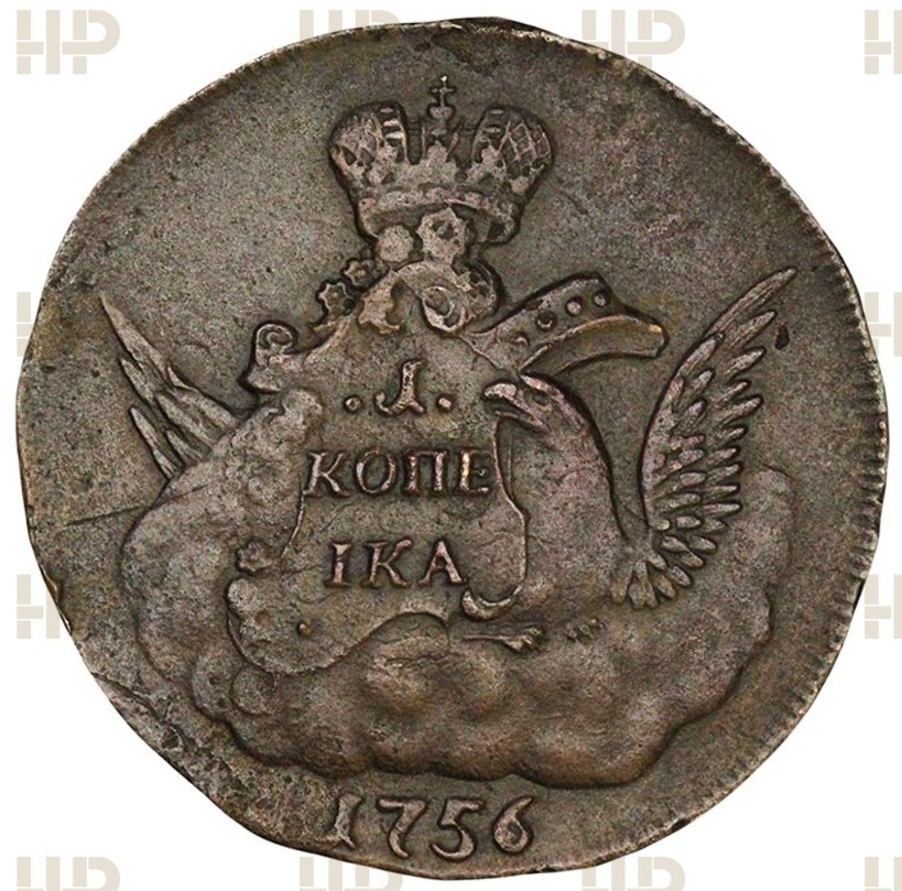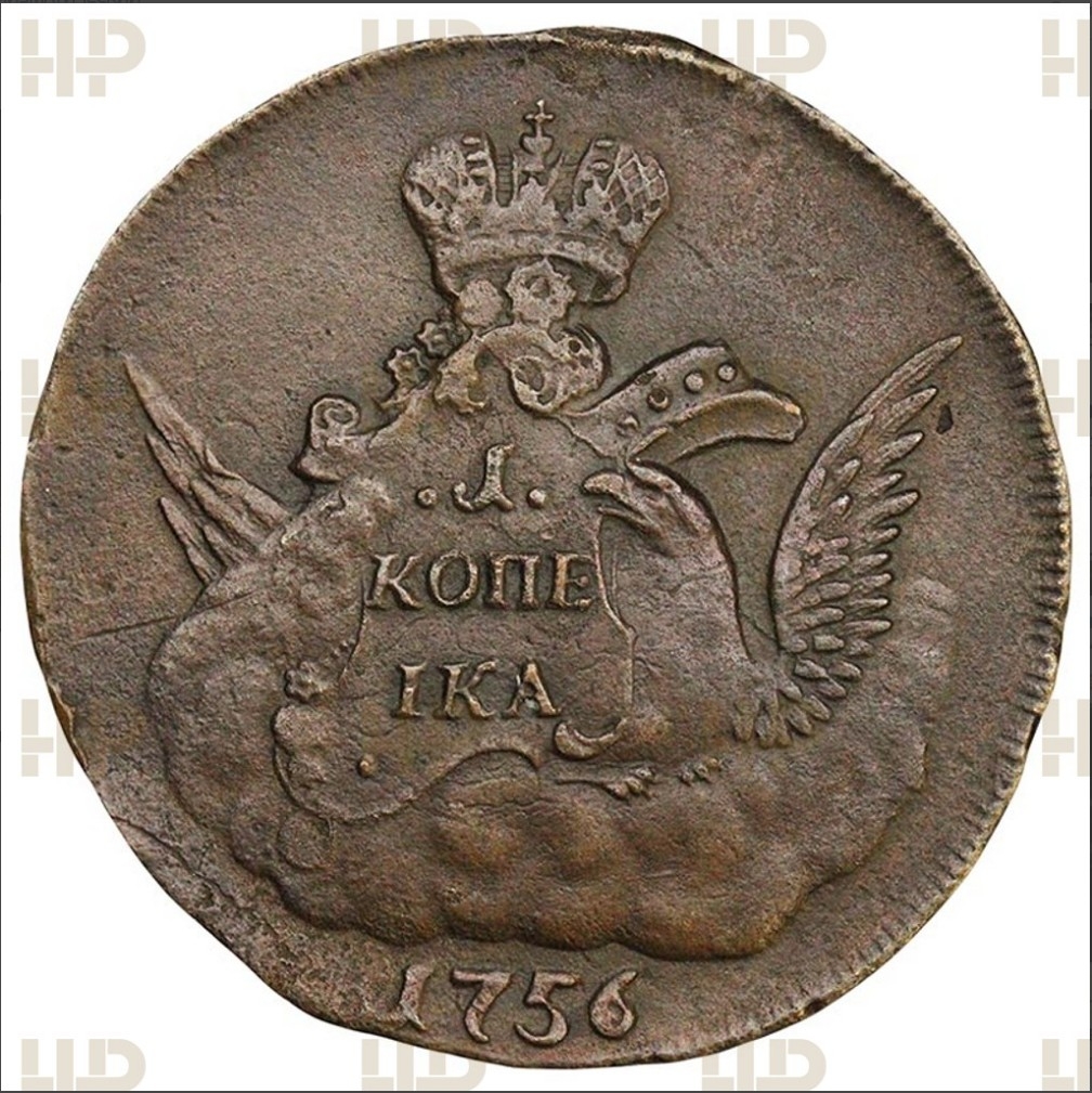 Медная копейка периода правления императрицы Елизаветы Петровны, отчеканенная в 1755-1757 годах. Монета представляет собой классический перечекан («облачник»), выполненный на заготовке от более ранней монеты («крестовой»). Большинство экспертов в комментариях признают её подлинной, отмечая характерные следы перечекана как признак оригинала, а не подделки.