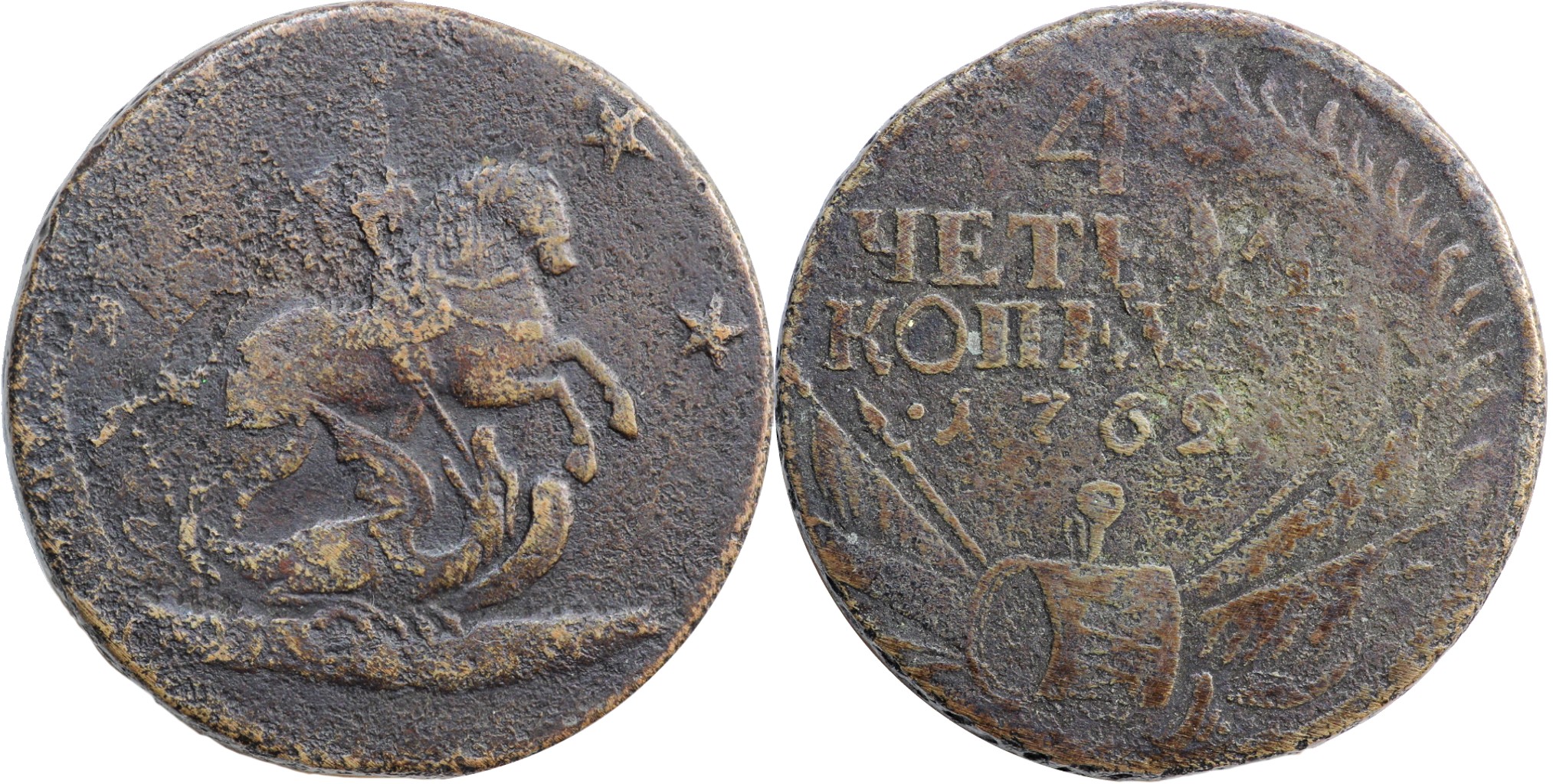 Монета номиналом 4 копейки 1762 года, отчеканенная в правление императрицы Елизаветы Петровны. Данный экземпляр является современной подделкой, изготовленной методом литья. Подлинные медные монеты этого периода имеют характерные особенности чеканки и гурта, которые отсутствуют у данной копии.