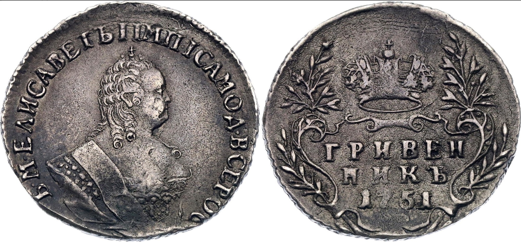 Монеты периода правления императрицы Елизаветы Петровны: серебряный полуполтинник 1751 года и гривенник 1746 года. Несмотря на высокий уровень современных подделок, представленные экземпляры признаны оригинальными по совокупности признаков, включая характерные "слойки" металла и детали гурта.