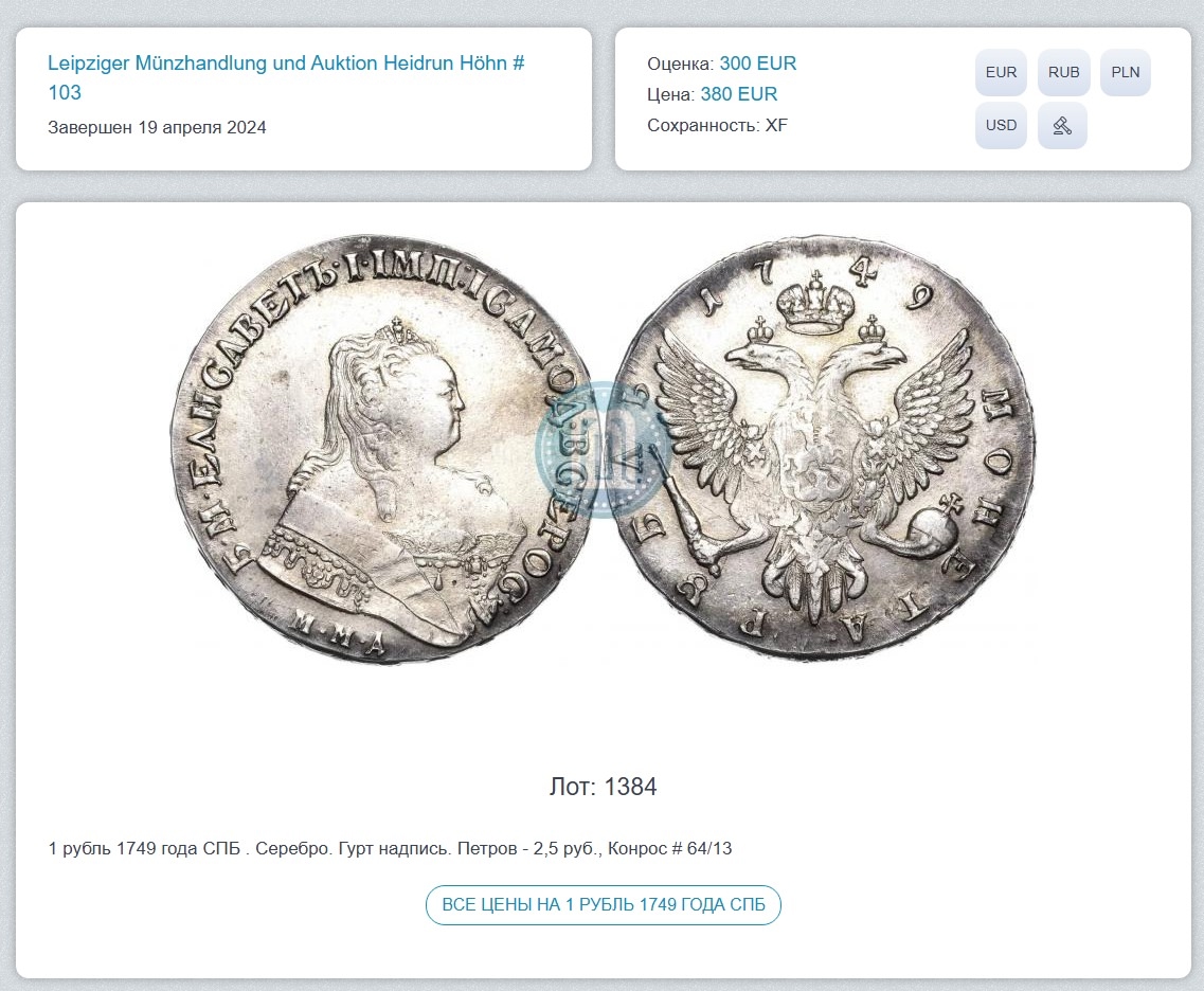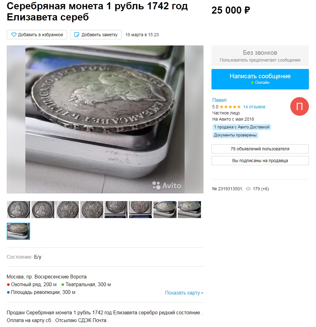Монета представляет собой копию серебряного рубля 1742 года, выпущенного в правление императрицы Елизаветы Петровны. Оригинальные рубли этого периода чеканились на Санкт-Петербургском монетном дворе и имеют высокую коллекционную ценность. Данный экземпляр является заведомой репликой, о чём прямо указано в описании поста.