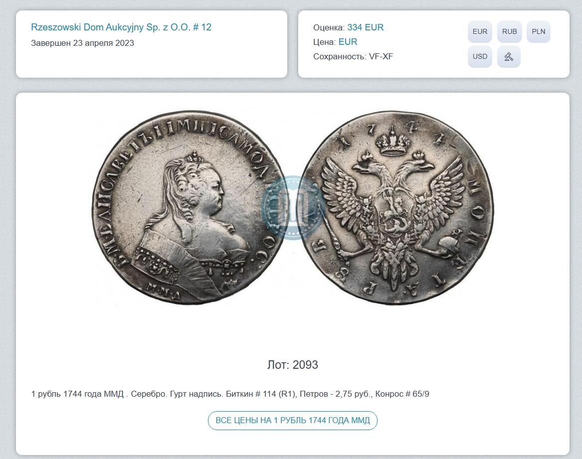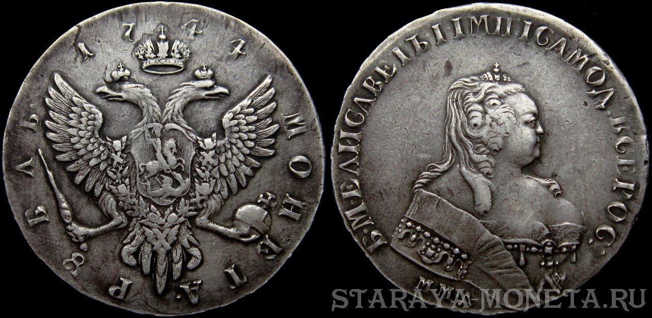 Монета номиналом 1 рубль 1744 года, отчеканенная в правление императрицы Елизаветы Петровны из серебра. Большинство экспертов в комментариях склоняется к тому, что это современная подделка, вероятно, литьё. Ключевым аргументом стала ошибка в гуртовой надписи: «монетнаго» вместо правильного «манетного».