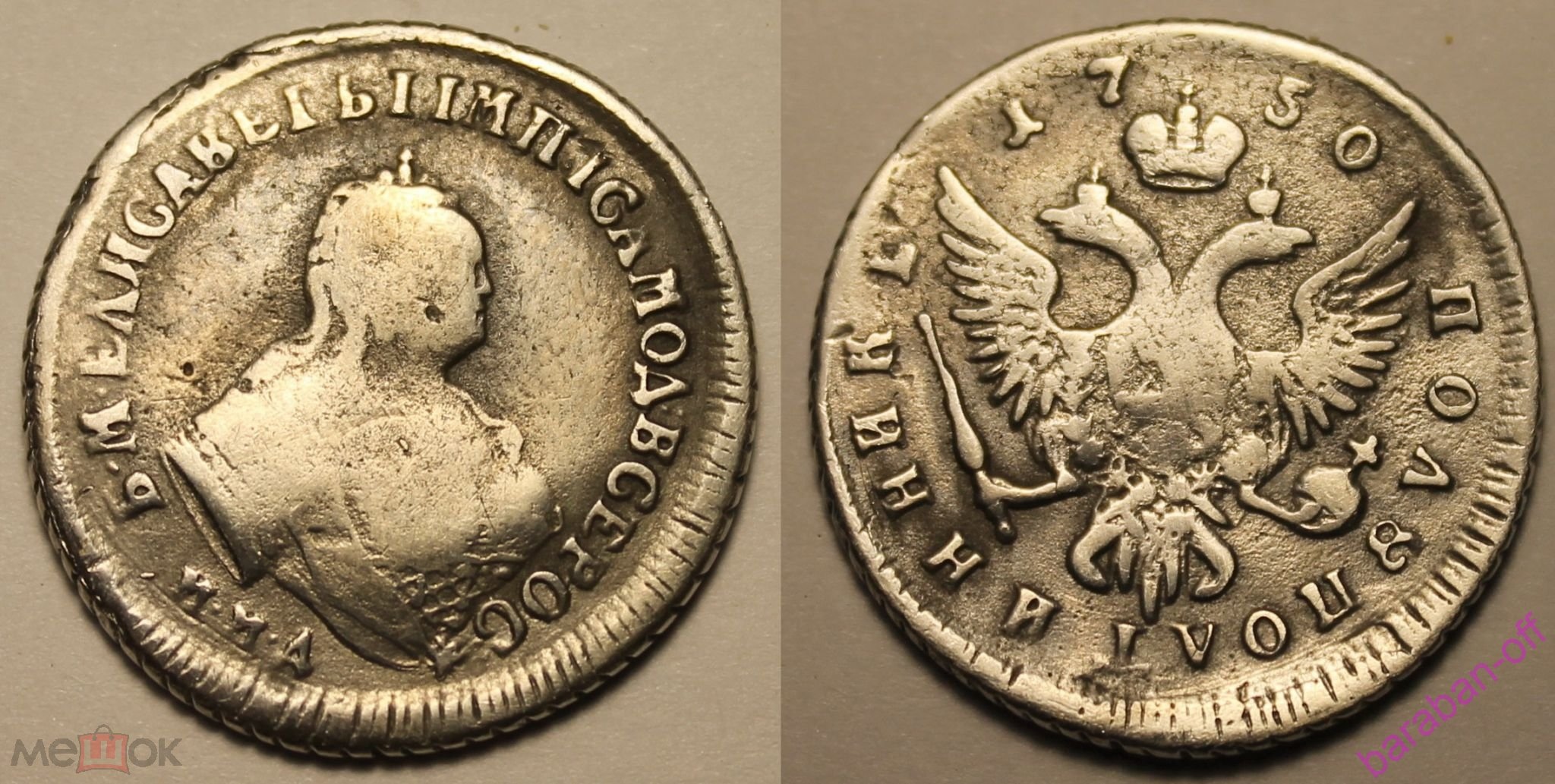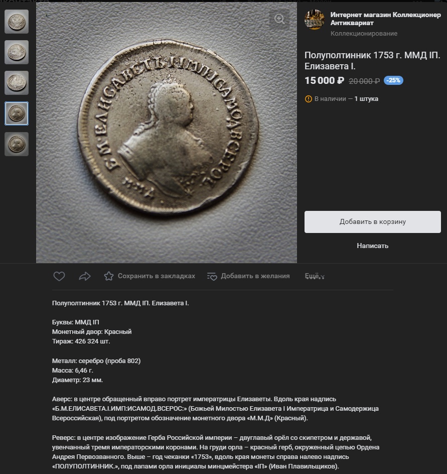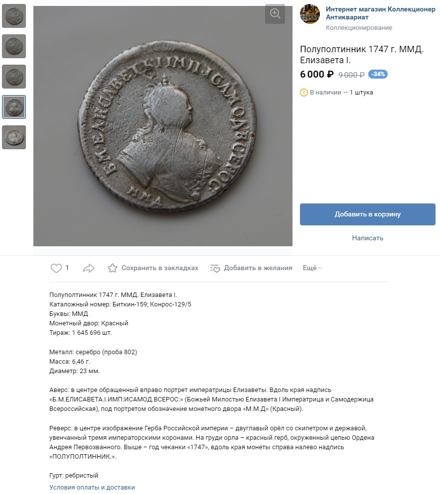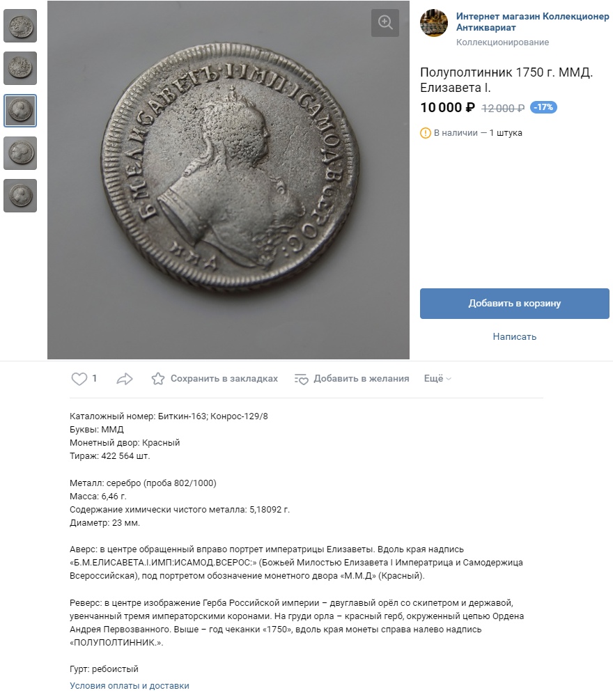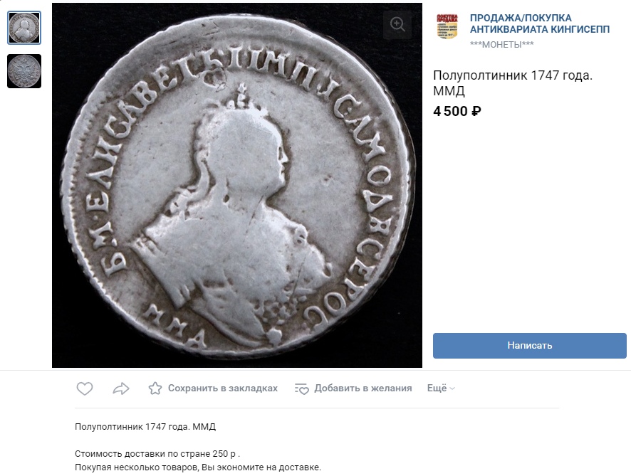 Монета номиналом полтина, отчеканенная в 1742 году в правление императрицы Елизаветы Петровны. В оригинале это серебряная монета, однако представленный экземпляр является подделкой. Автор поста прямо указывает на это, а комментарий, иронично отсылающий к продажам фальшивок, подтверждает вердикт.