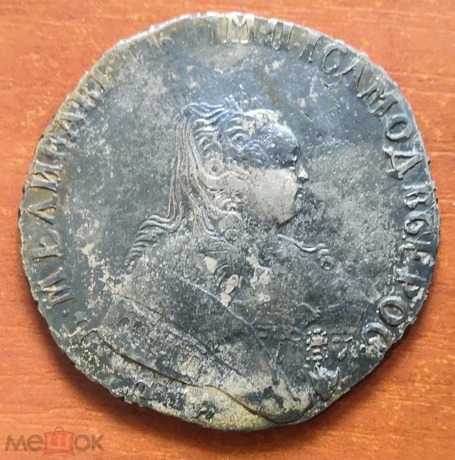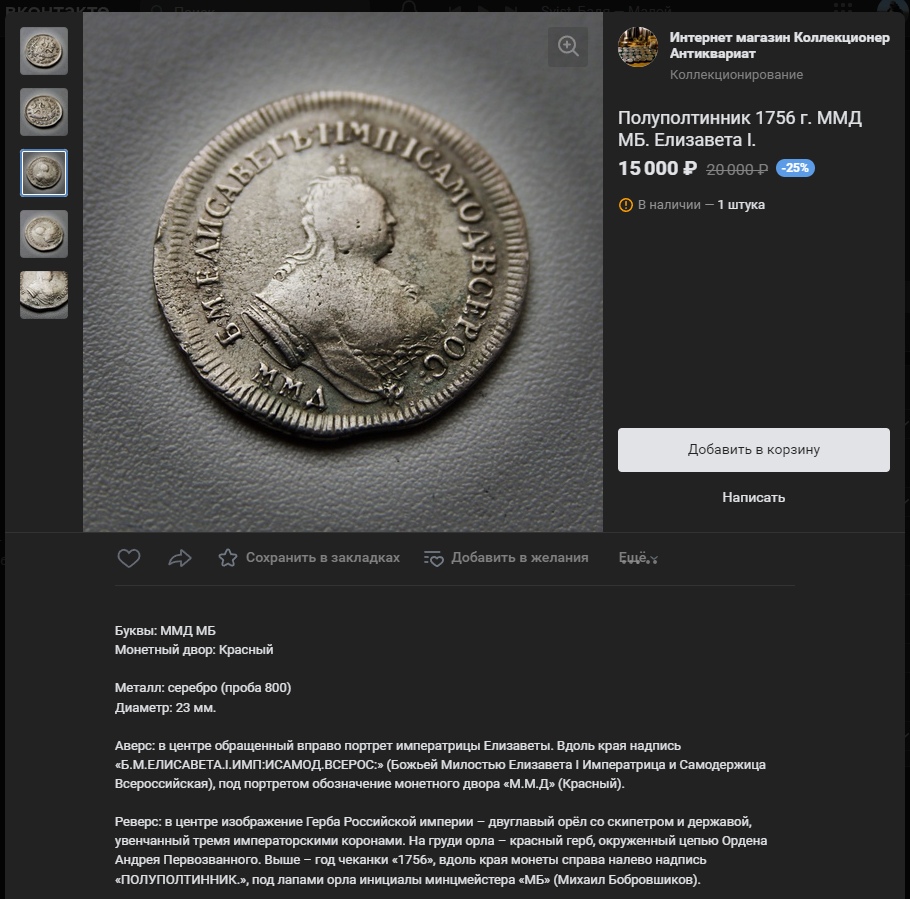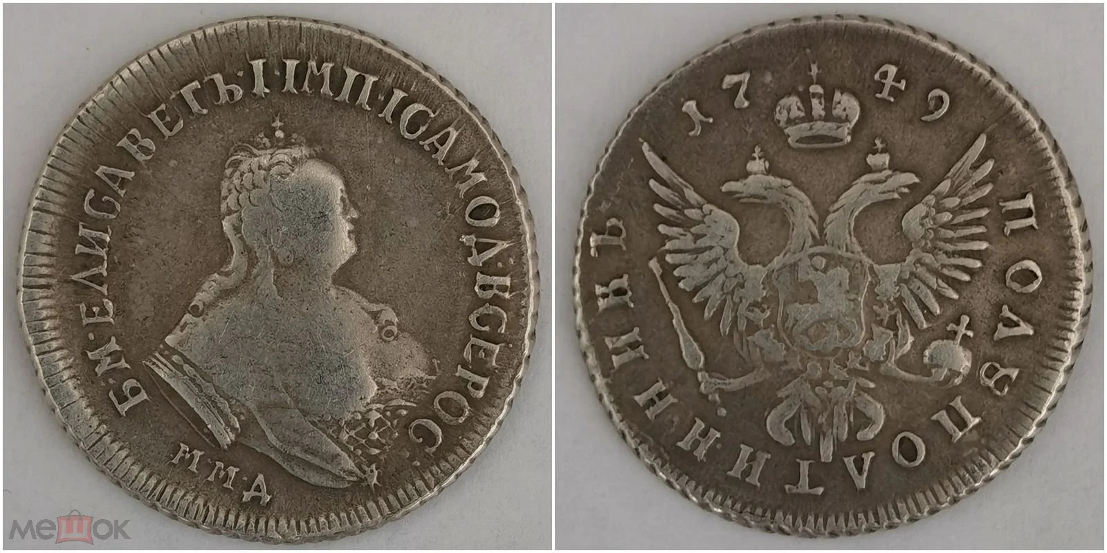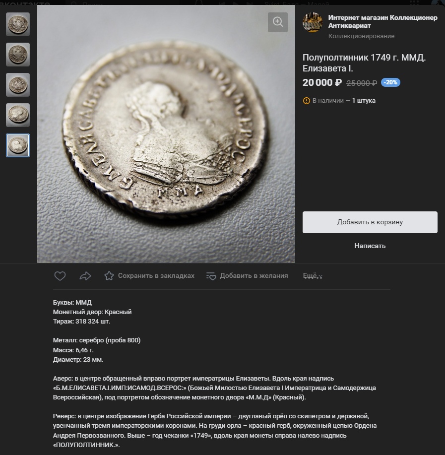 Монета номиналом полтина, отчеканенная в 1742 году в правление императрицы Елизаветы Петровны. В оригинале это серебряная монета, однако представленный экземпляр является подделкой. Автор поста прямо указывает на это, а комментарий, иронично отсылающий к продажам фальшивок, подтверждает вердикт.