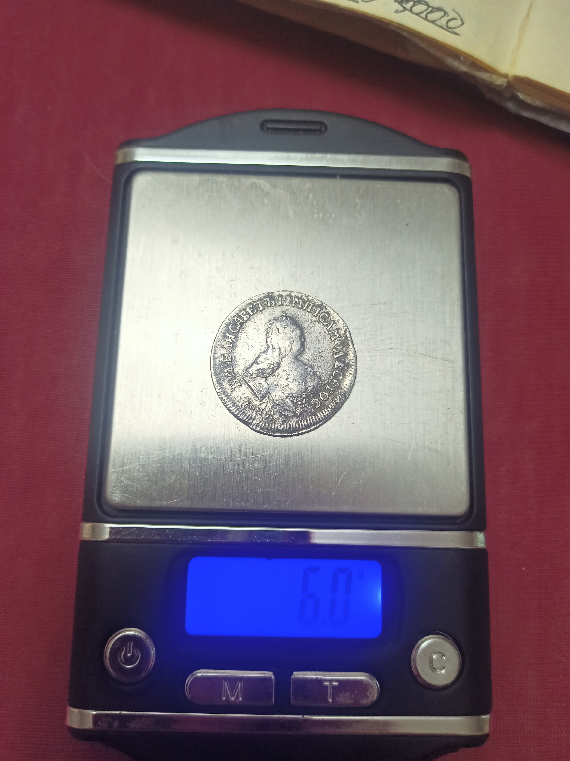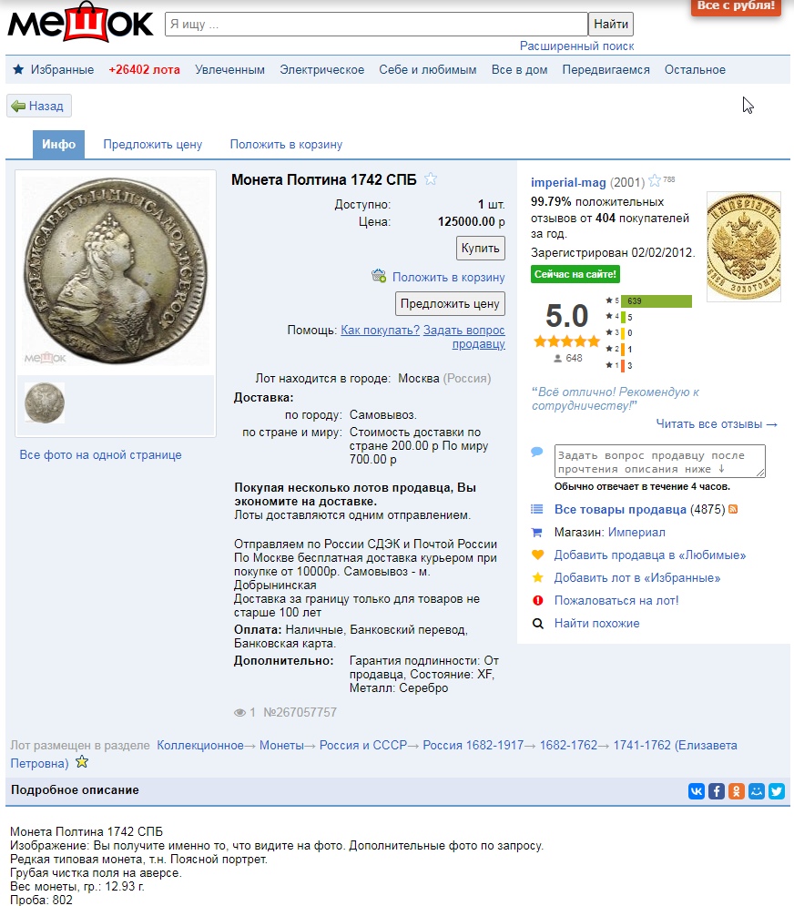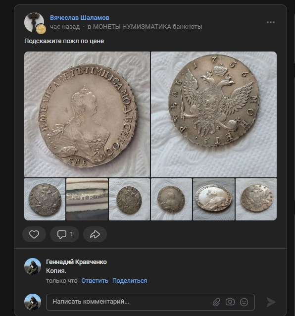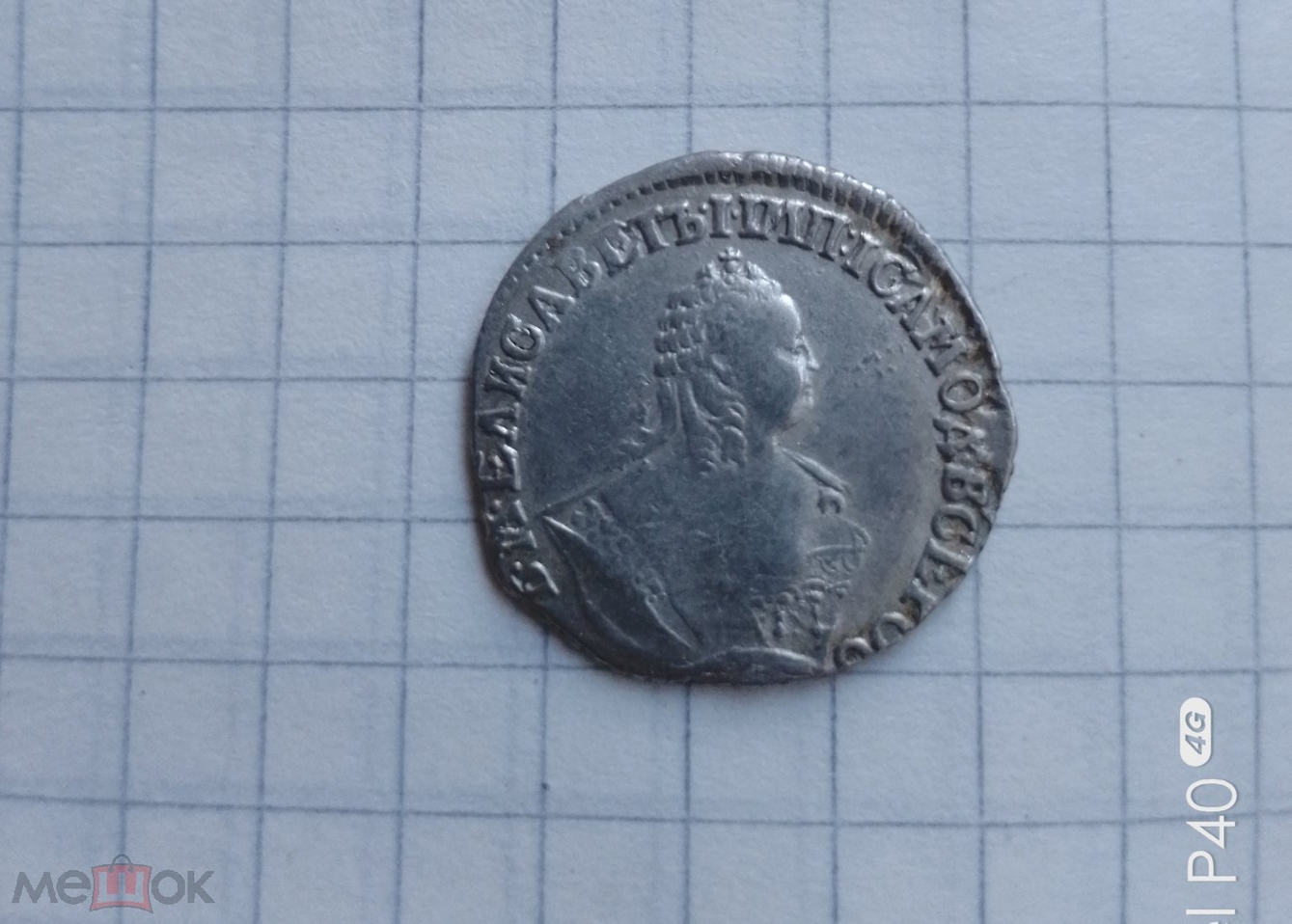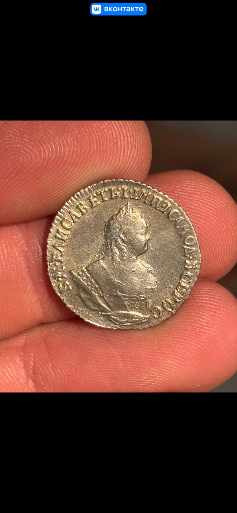 Монета номиналом полтина, отчеканенная в 1742 году в правление императрицы Елизаветы Петровны. В оригинале это серебряная монета, однако представленный экземпляр является подделкой. Автор поста прямо указывает на это, а комментарий, иронично отсылающий к продажам фальшивок, подтверждает вердикт.