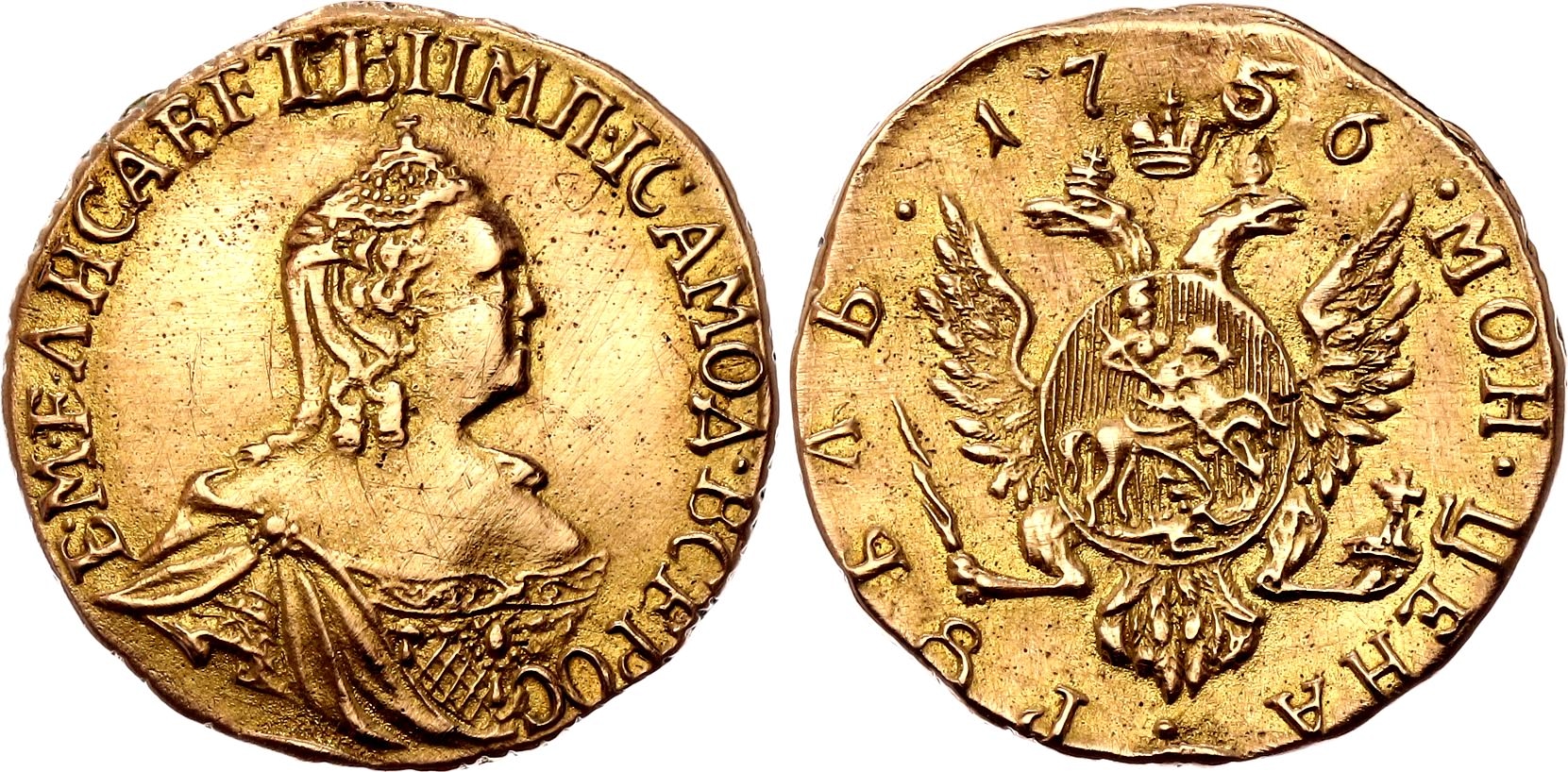 Представленная монета является подделкой золотого 5-рублёвика 1758 года, отчеканенного в правление императрицы Елизаветы Петровны. Оригинальные монеты этого типа имели стандартный вес около 6,54 г для золота 917-й пробы, в то время как данный экземпляр весит 8,28 г, что указывает на несоответствие стандартам. Монета зафиксирована в базе фальшивок как опасная копия, выполненная методом чеканки.