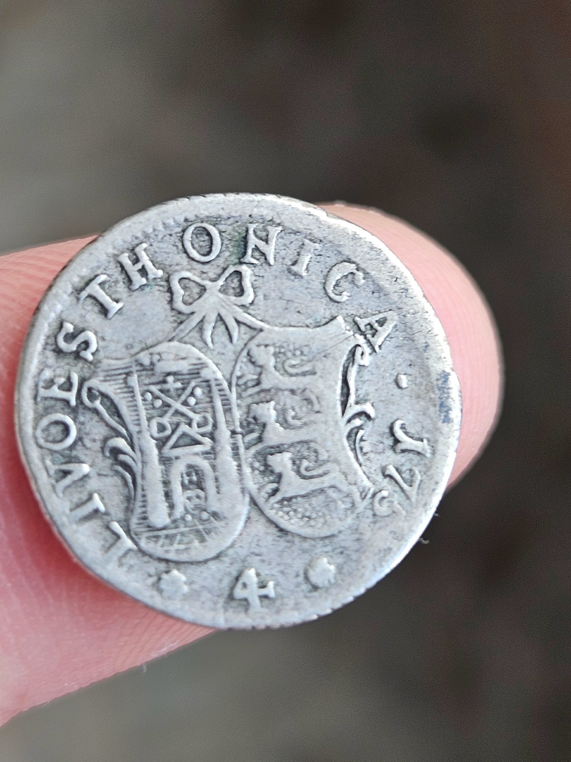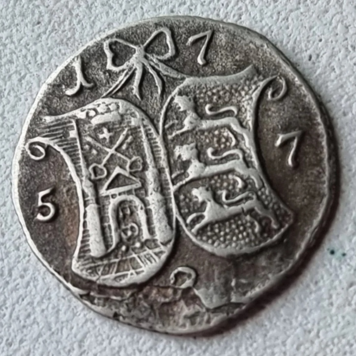 Представленная монета является современной подделкой, стилизованной под пробную монету Российской Империи времён Елизаветы Петровны — так называемый "ливонез". Оригинальные ливонезы 1756-1757 гг. чеканились номиналом в 96, 48, 24 и 2 копейки для Прибалтики. Данный экземпляр — фантазийная копия низкого качества, массово производившаяся в 1990-х годах.