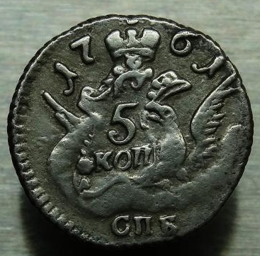 Монета 5 копеек 1761 года, отчеканенная при императрице Елизавете Петровне на Санкт-Петербургском монетном дворе (обозначение СПБ). В оригинале это крупная медная монета, чеканившаяся по 16-рублевой стопе. В данном случае автор поста прямо указывает, что представленный экземпляр является подделкой.