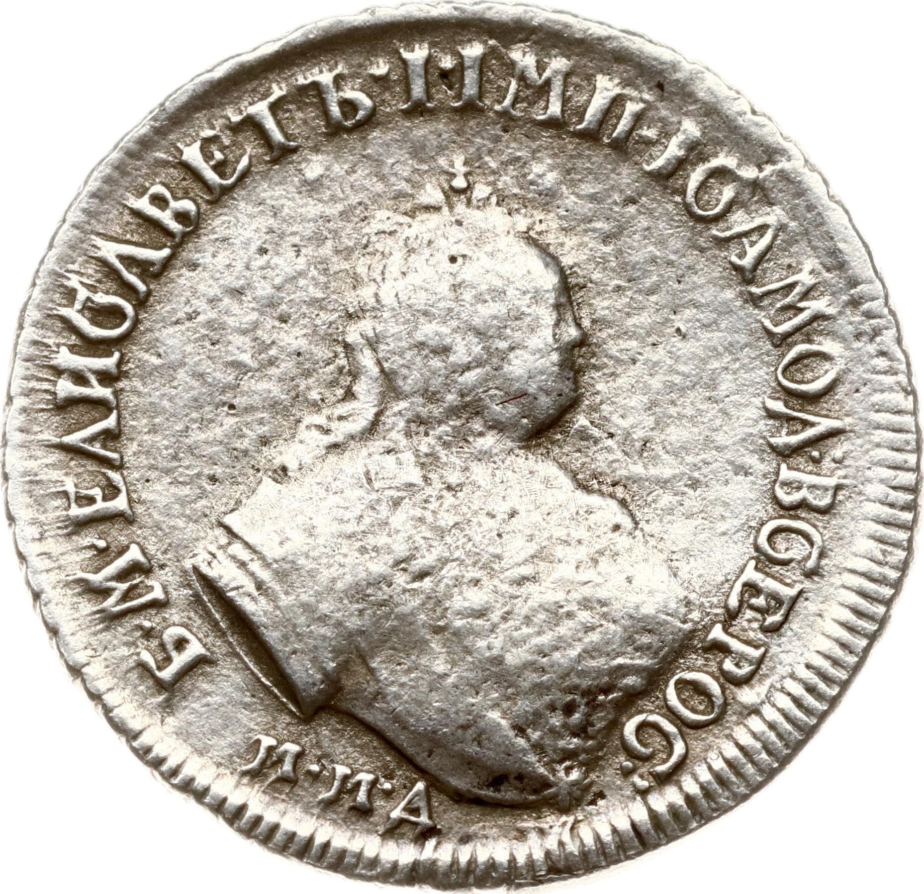 Монета номиналом 10 копеек (гривенник), отчеканенная в правление императрицы Елизаветы Петровны. Оригинальные гривенники этого периода имеют чёткий штемпельный рисунок и характерный стиль. Представленный экземпляр является грубой подделкой, о чём свидетельствуют несоответствия в деталях и общее низкое качество исполнения.