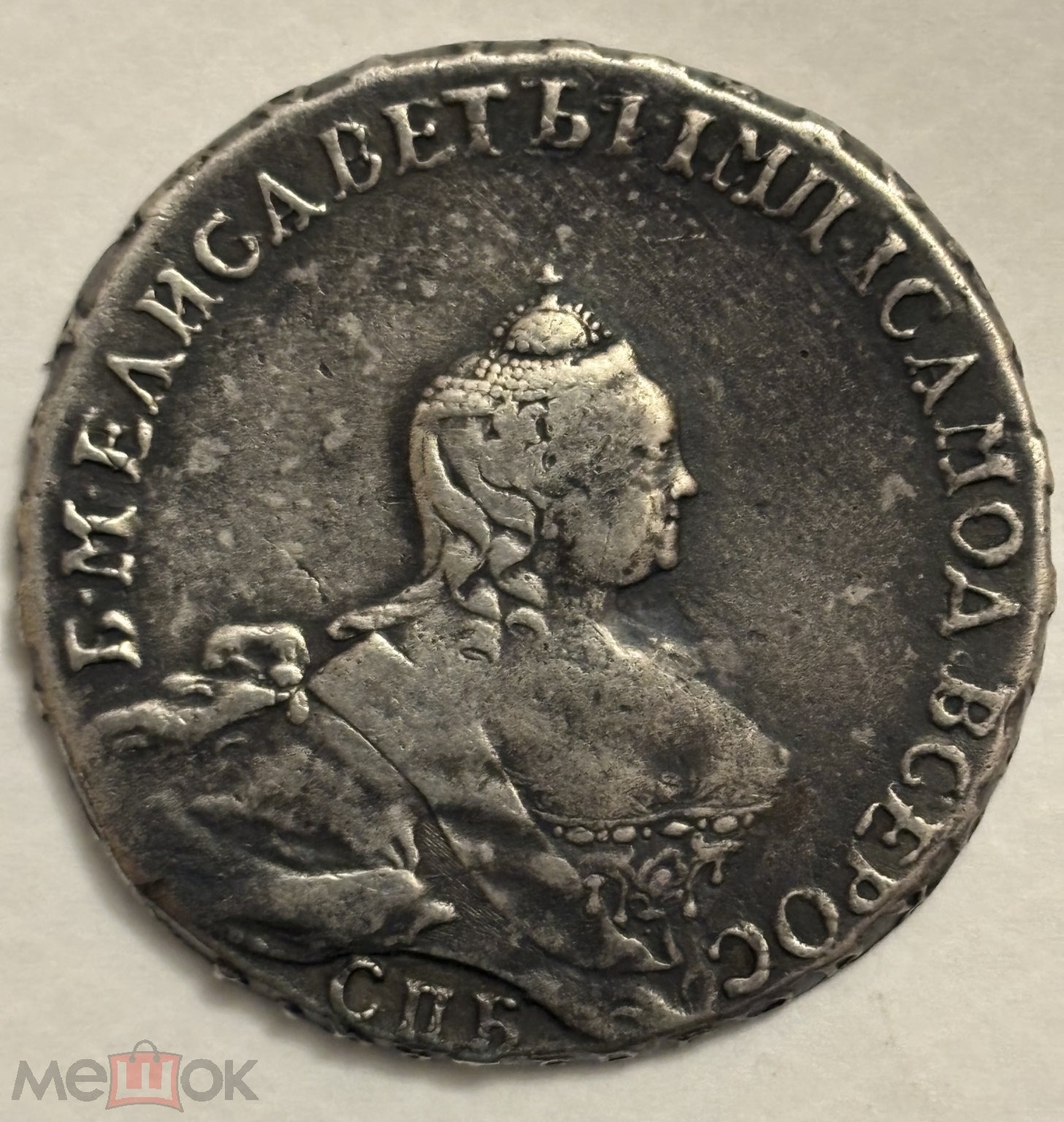 Монета представляет собой подделку серебряного рубля 1758 года, отчеканенного при императрице Елизавете Петровне на Санкт-Петербургском монетном дворе (обозначение «СПБ»). Оригинальные рубли этого периода имеют высокую коллекционную ценность, что делает их частой мишенью для фальсификаторов. Владелец поста прямо указал, что монета является подделкой.