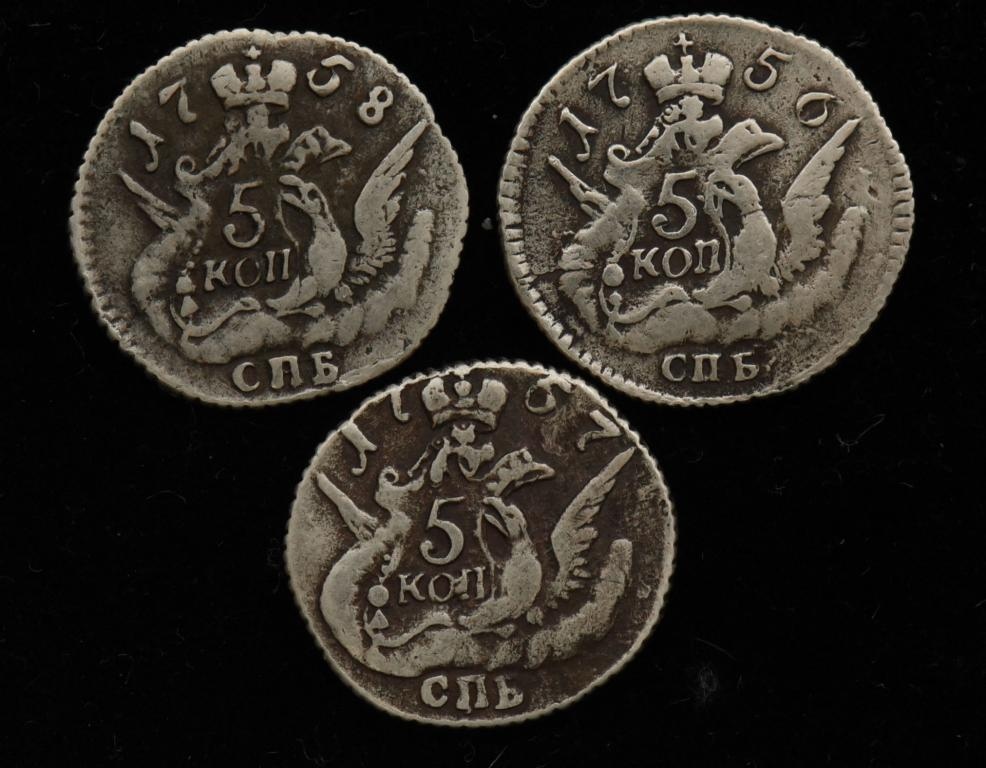 Представлены медные 5 копеек периода правления императрицы Елизаветы Петровны с датами 1756, 1757 и 1758 годов и знаком Санкт-Петербургского монетного двора (СПБ). Автор поста прямо указывает, что это подделки. Монеты данного типа и периода являются популярным объектом для копирования из-за высокого спроса среди коллекционеров.