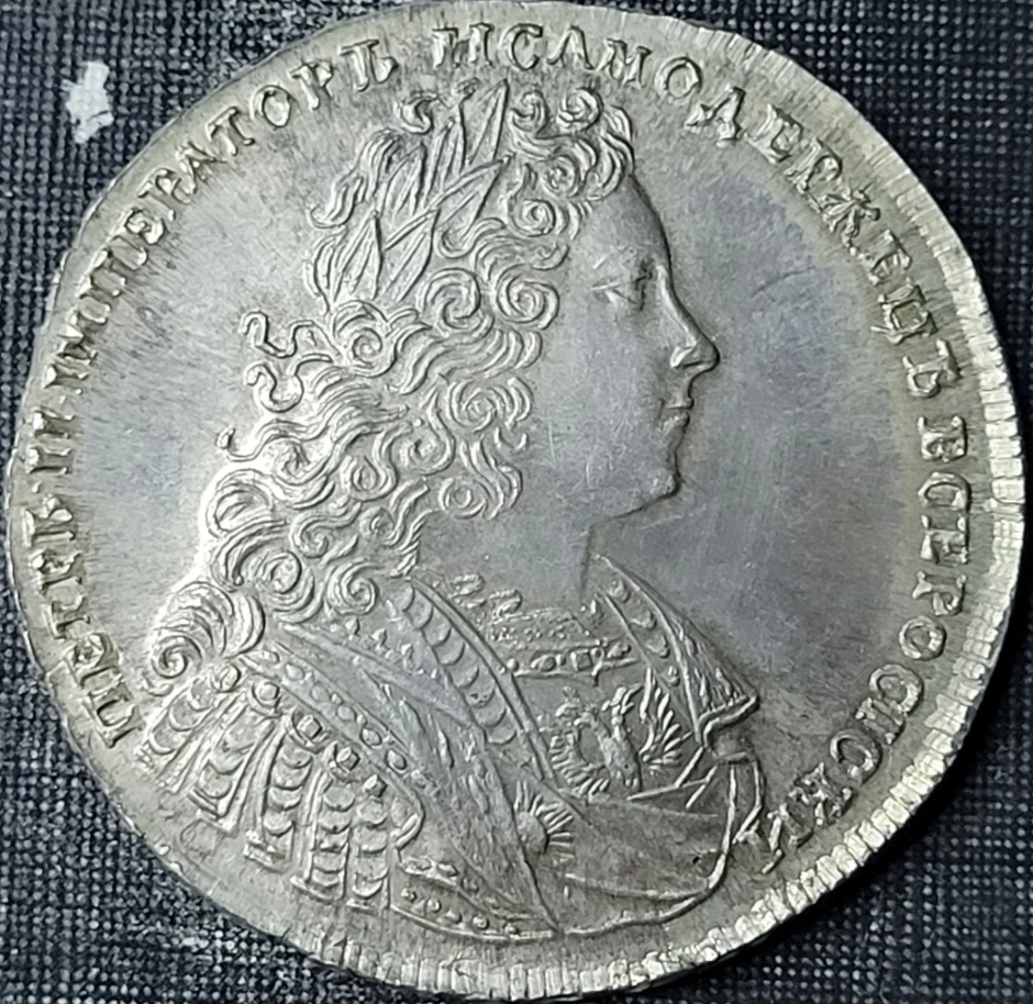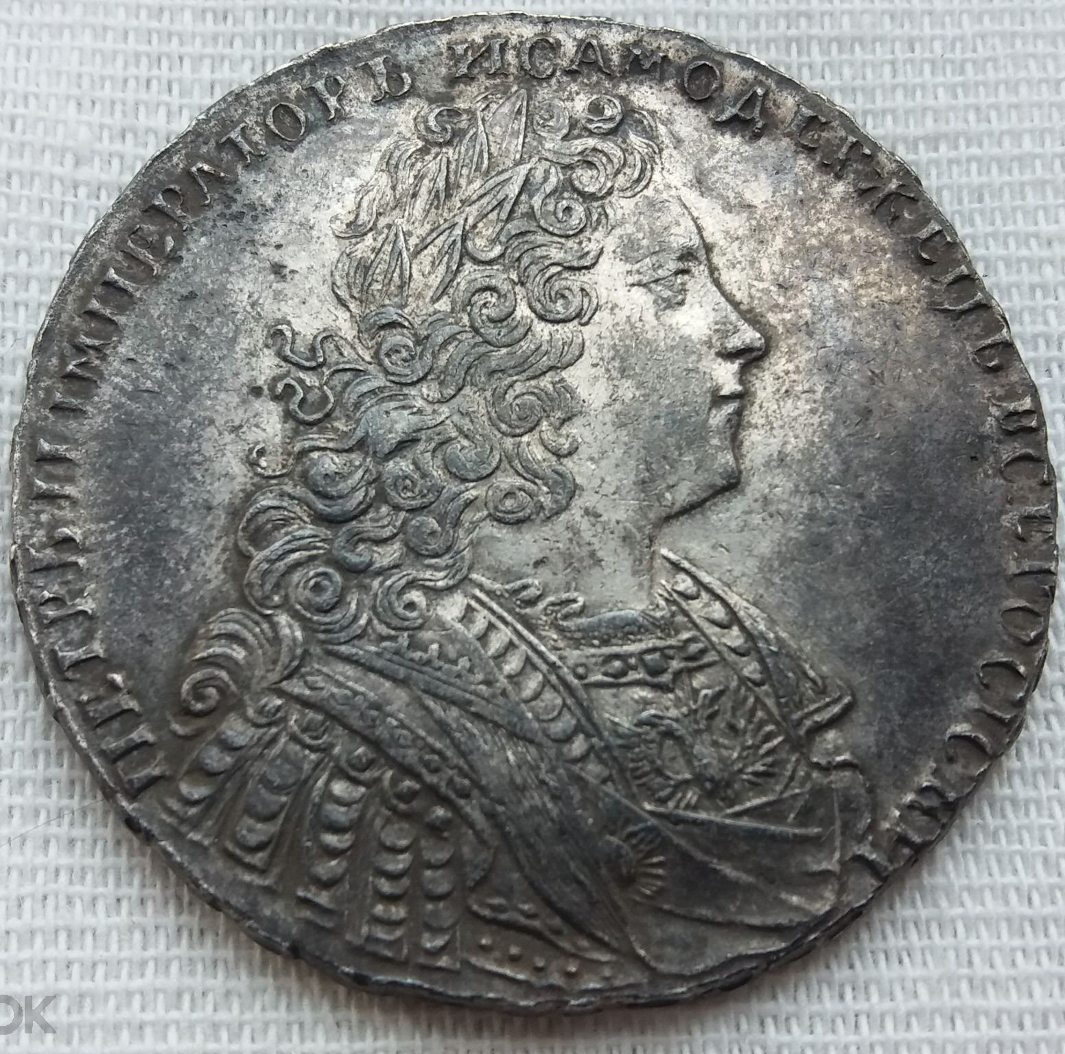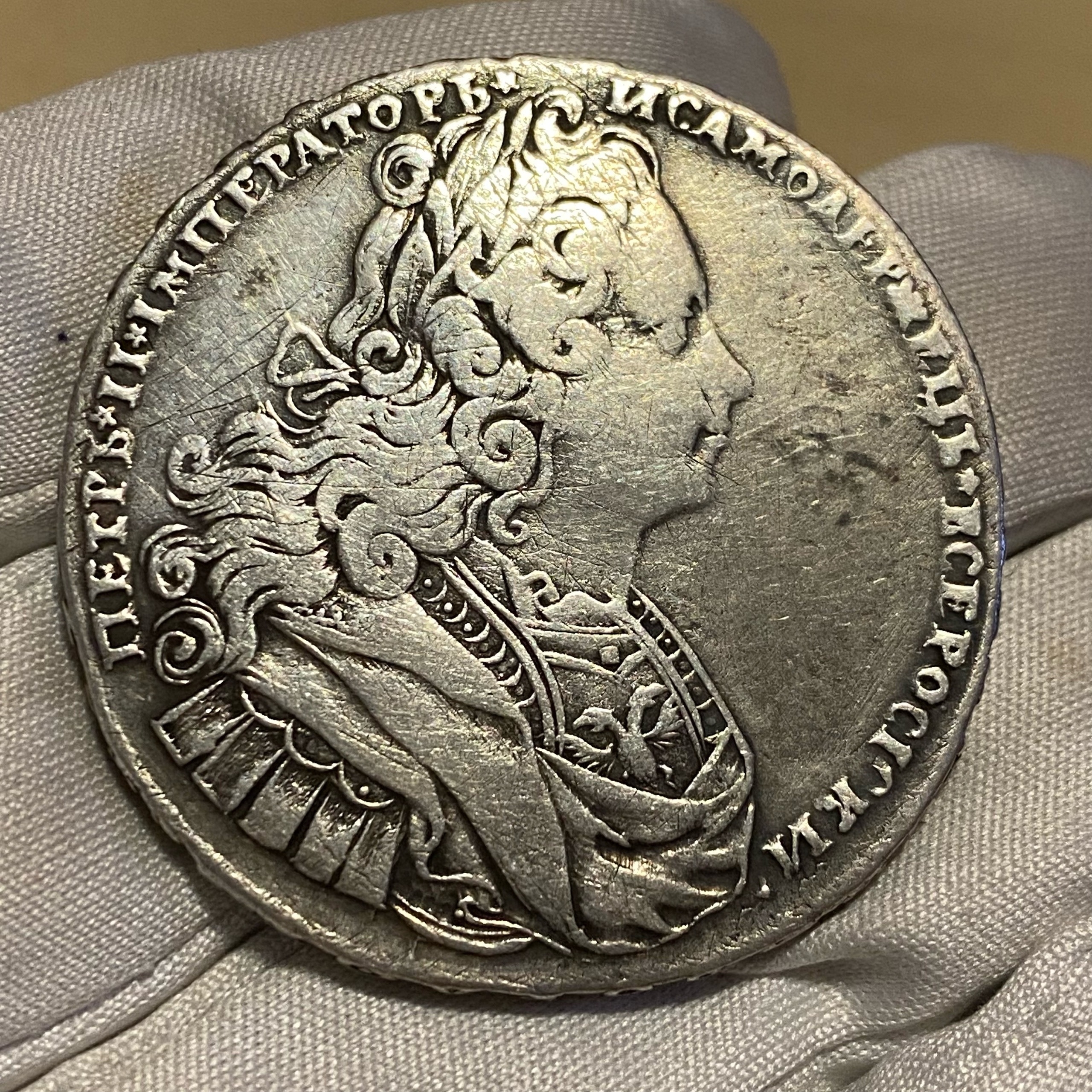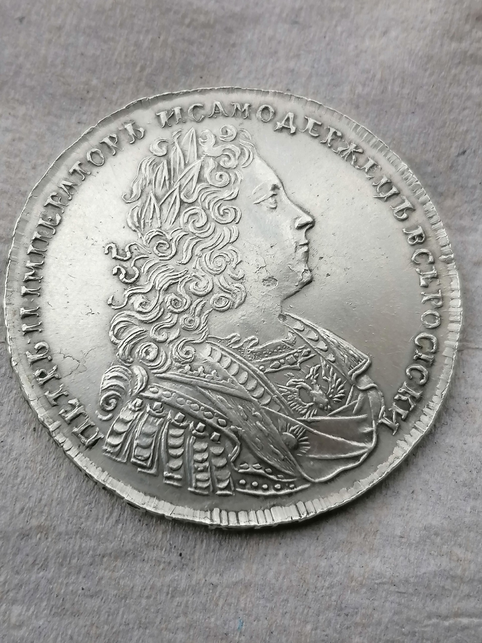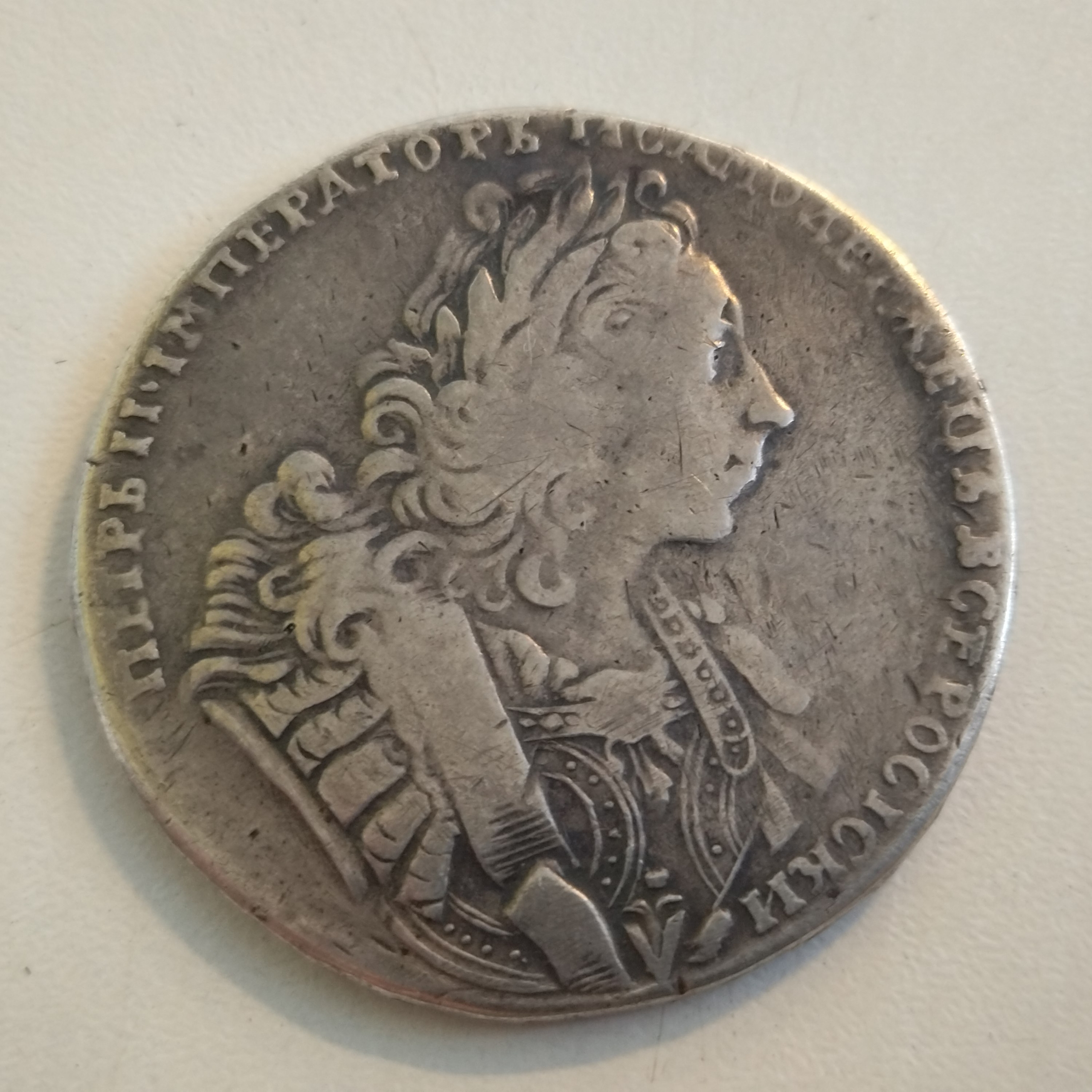 Монета номиналом 1 рубль 1728 года, отчеканенная в правление императора Петра II из серебра. Несмотря на внешнюю ровность, большинство экспертов в комментариях сходятся во мнении, что это современная копия (фуфло, шляпа). Подобные подделки часто встречаются на рынке.