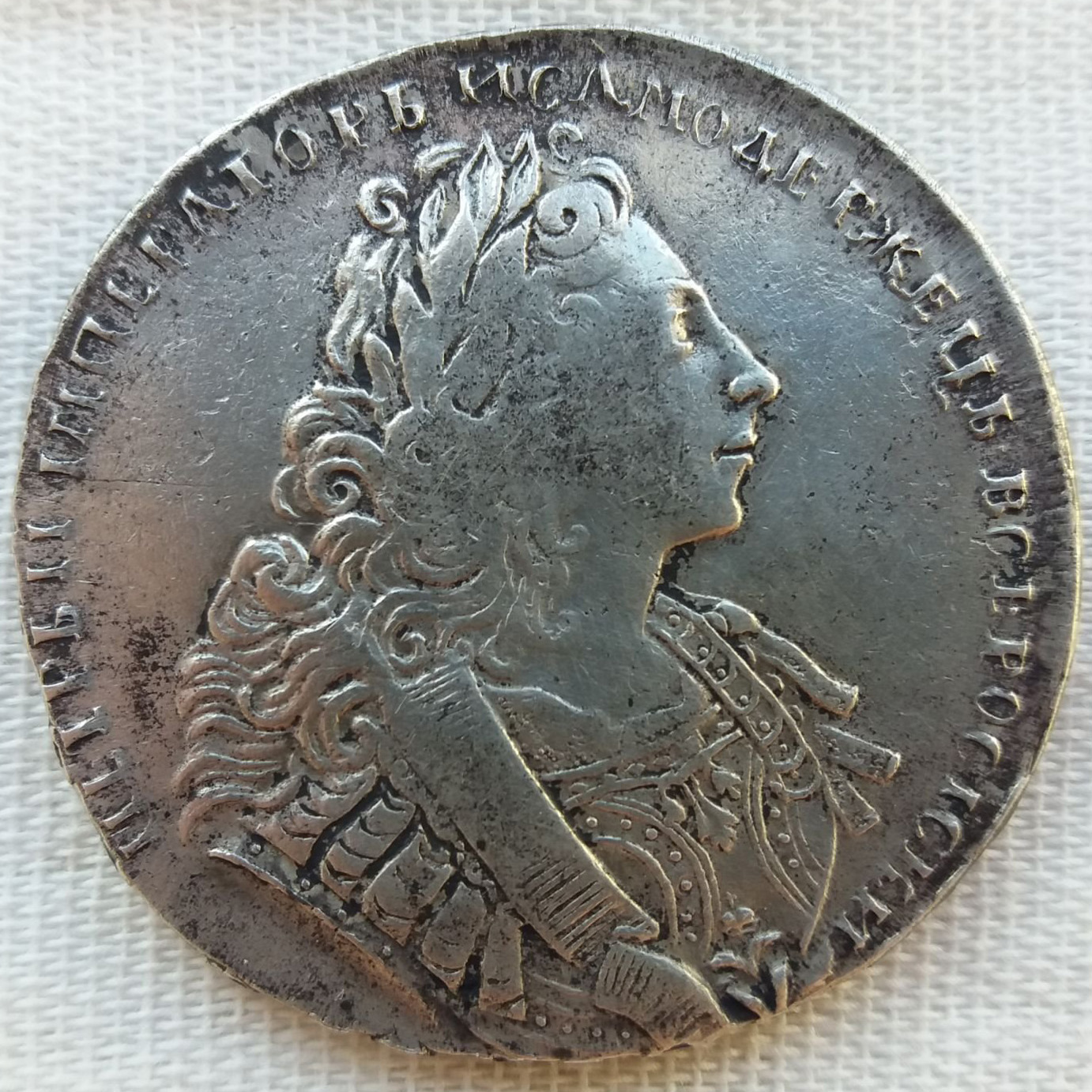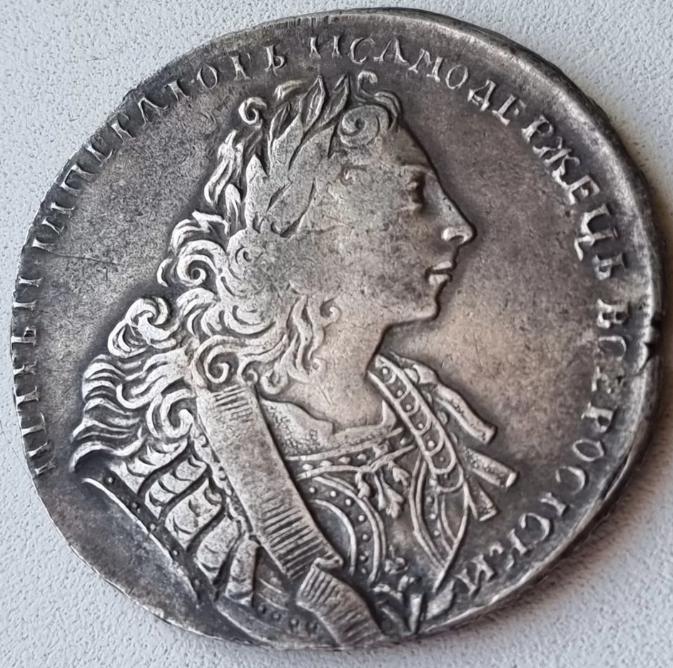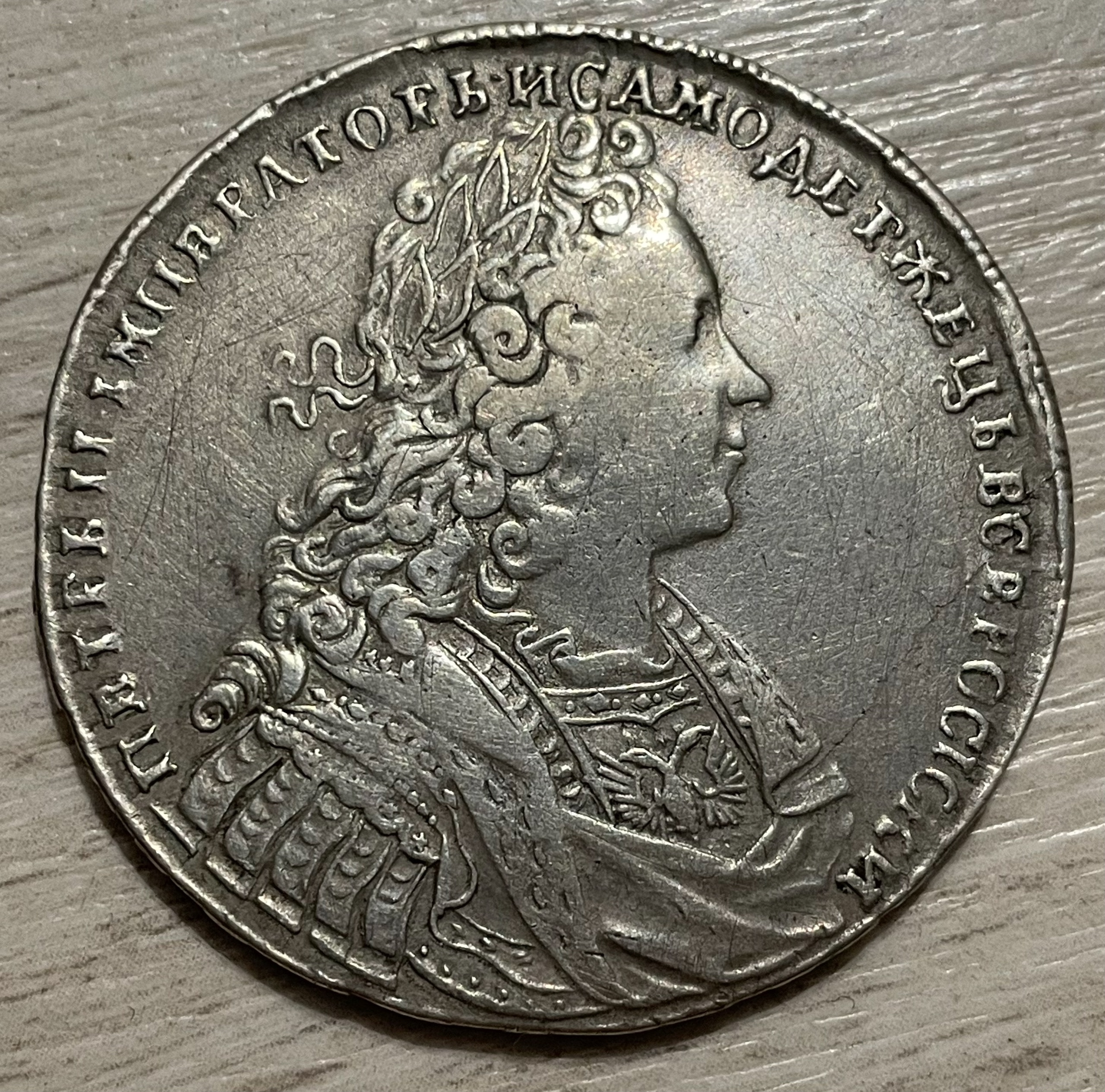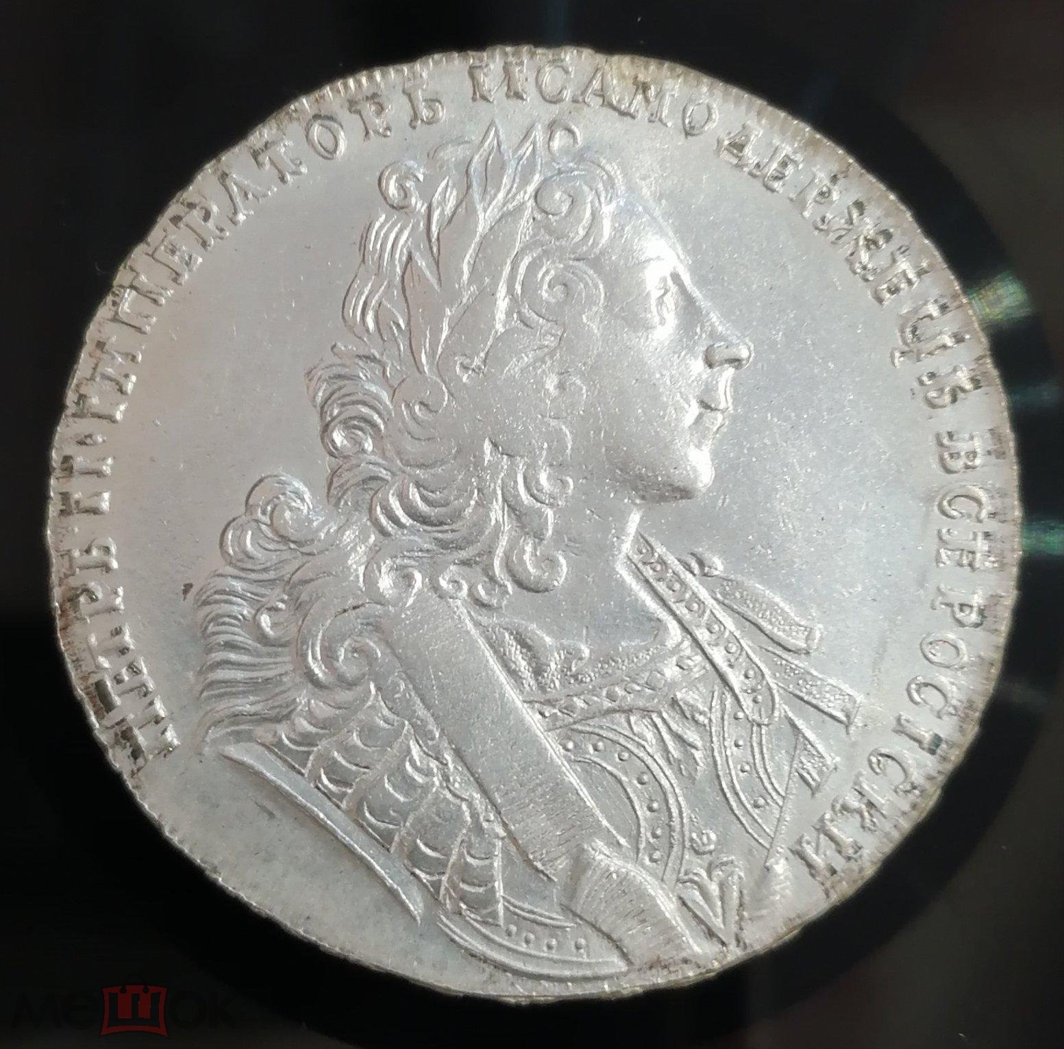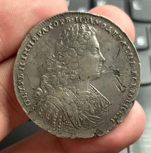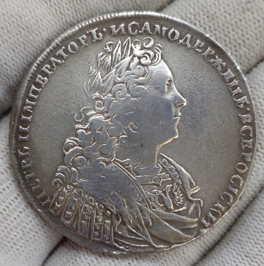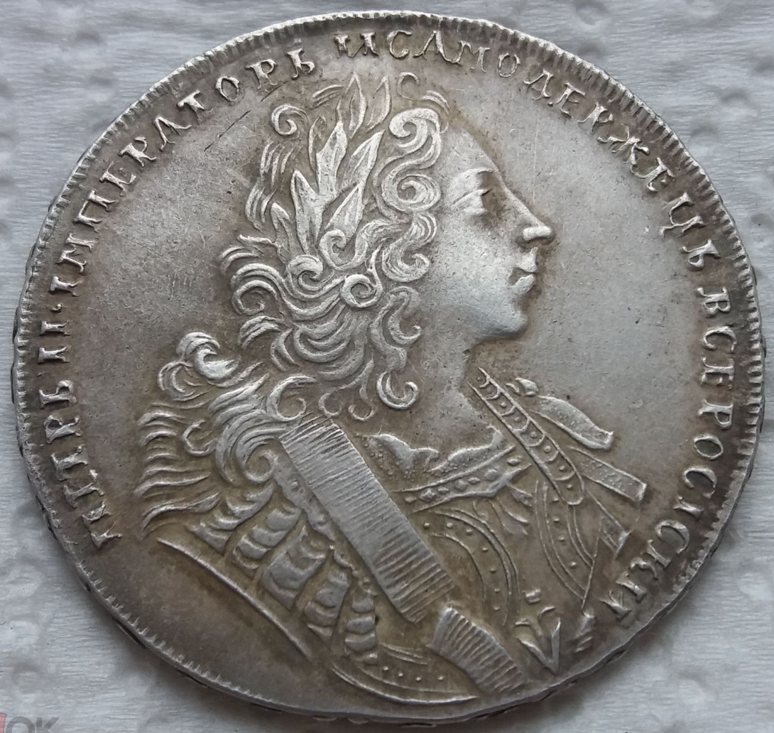 Монета номиналом 1 рубль 1728 года, отчеканенная в правление императора Петра II из серебра. Несмотря на внешнюю ровность, большинство экспертов в комментариях сходятся во мнении, что это современная копия (фуфло, шляпа). Подобные подделки часто встречаются на рынке.