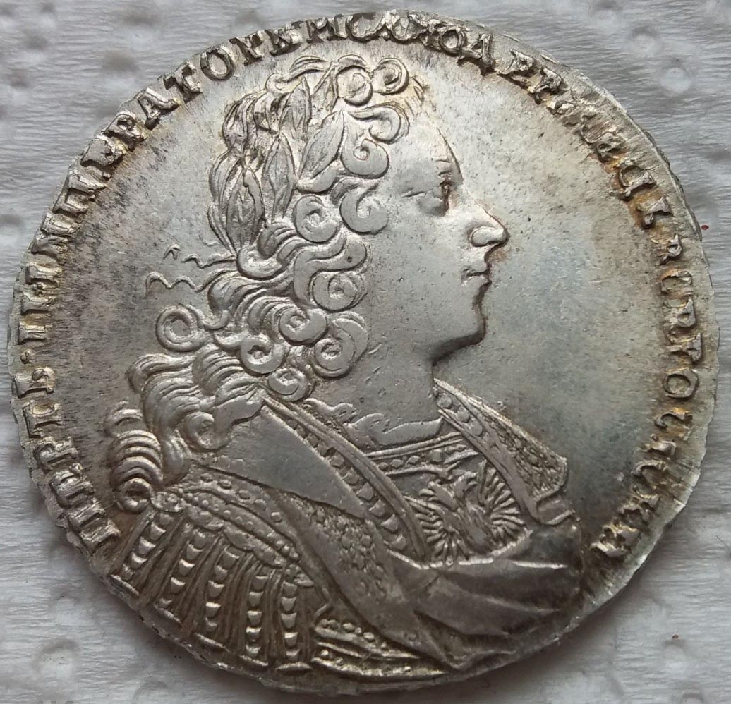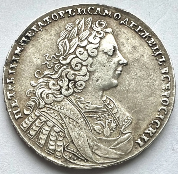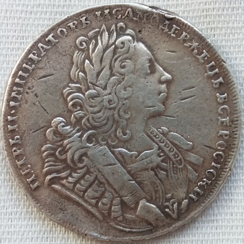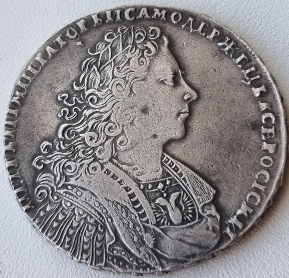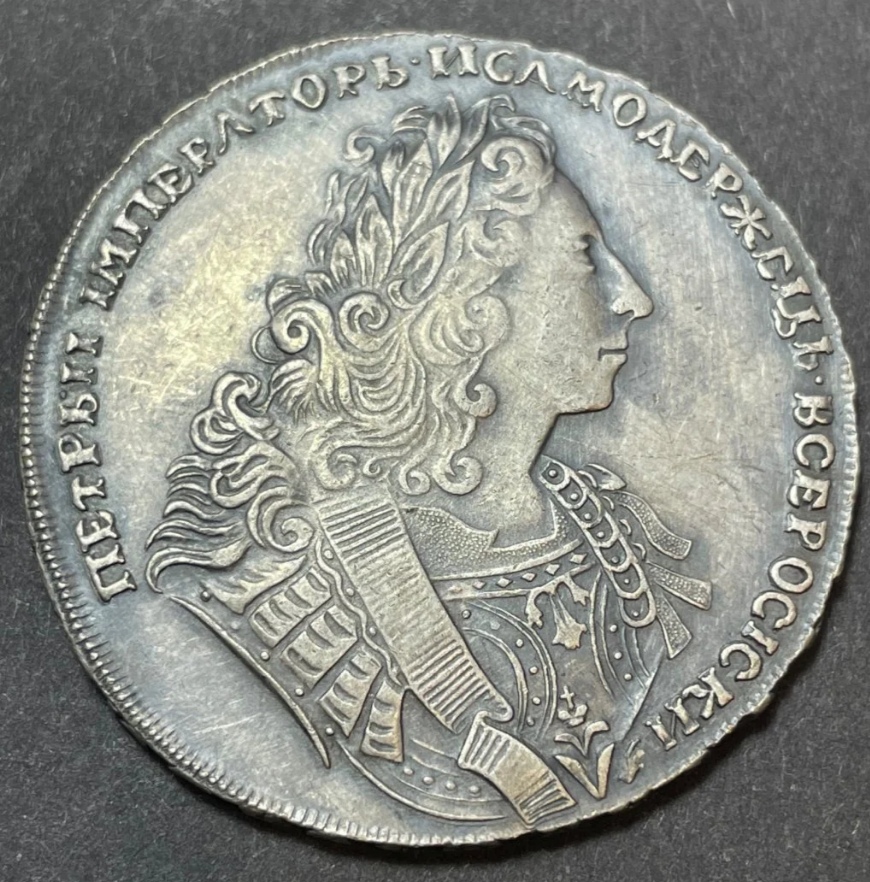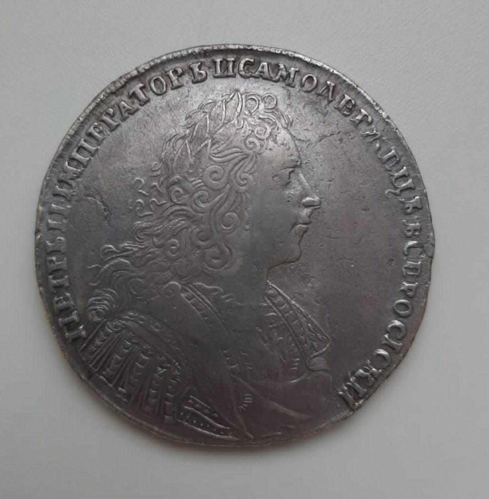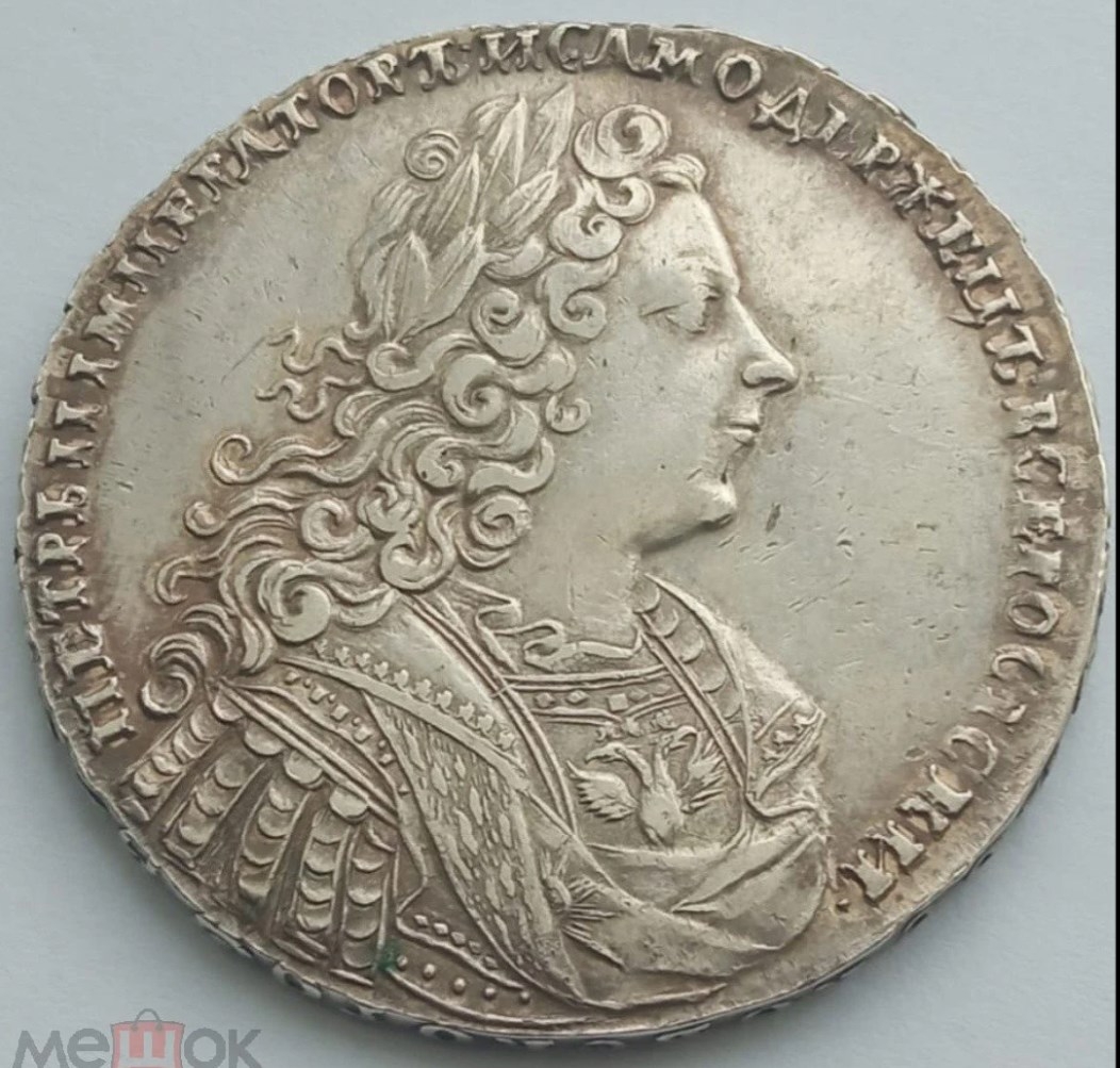Монета номиналом 1 рубль 1728 года, отчеканенная в правление императора Петра II из серебра. Несмотря на внешнюю ровность, большинство экспертов в комментариях сходятся во мнении, что это современная копия (фуфло, шляпа). Подобные подделки часто встречаются на рынке.
