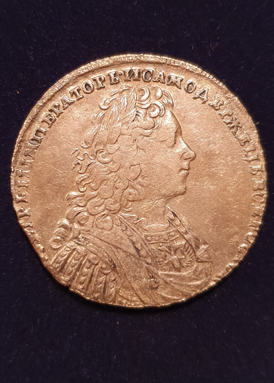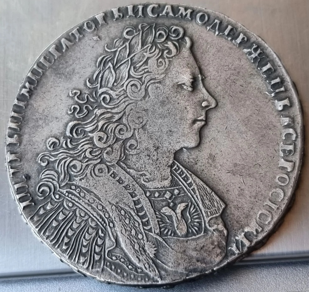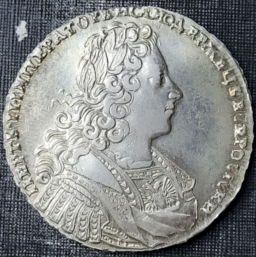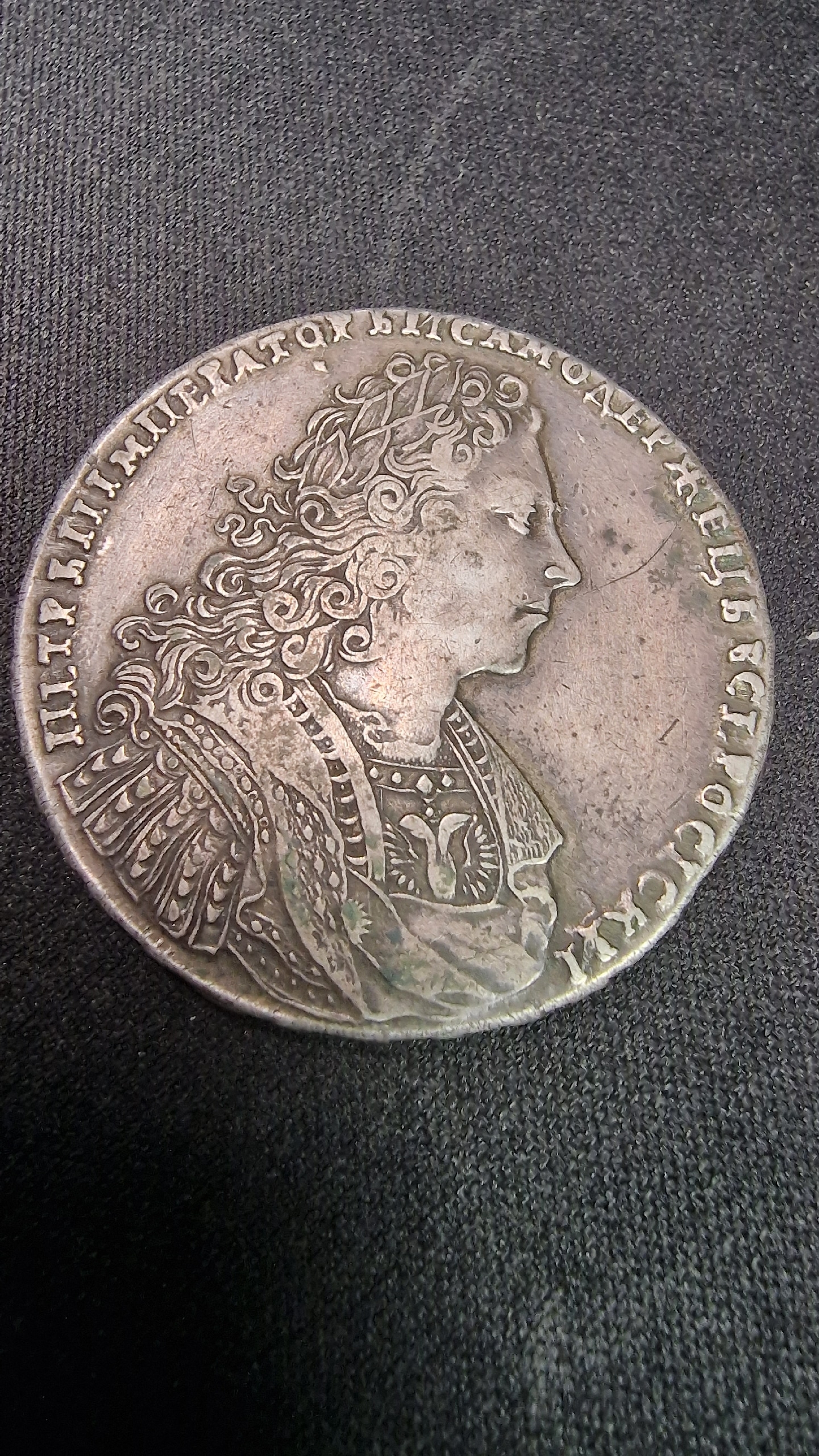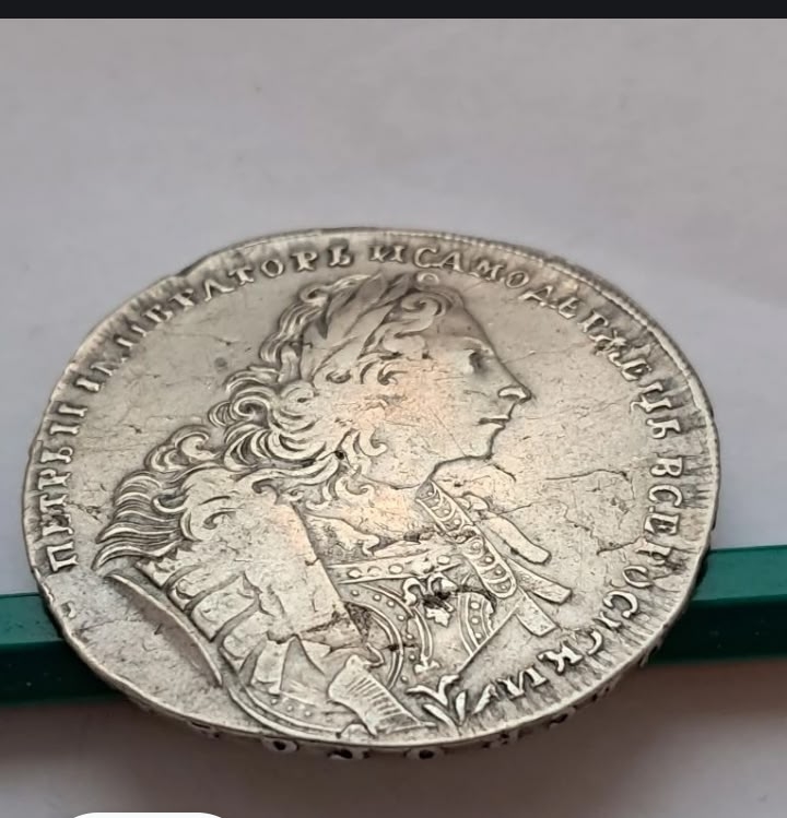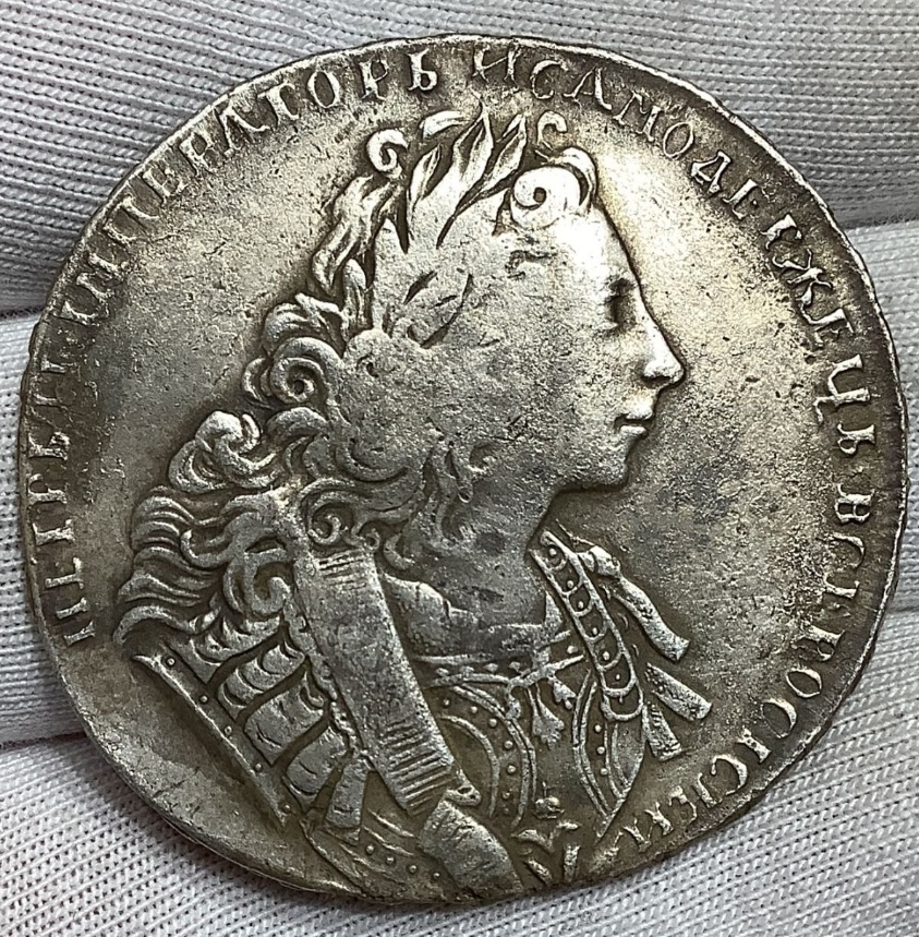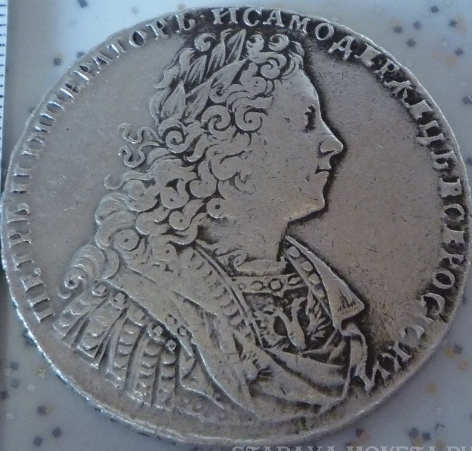 Монета номиналом 1 рубль 1728 года, отчеканенная в правление императора Петра II из серебра. Несмотря на внешнюю ровность, большинство экспертов в комментариях сходятся во мнении, что это современная копия (фуфло, шляпа). Подобные подделки часто встречаются на рынке.