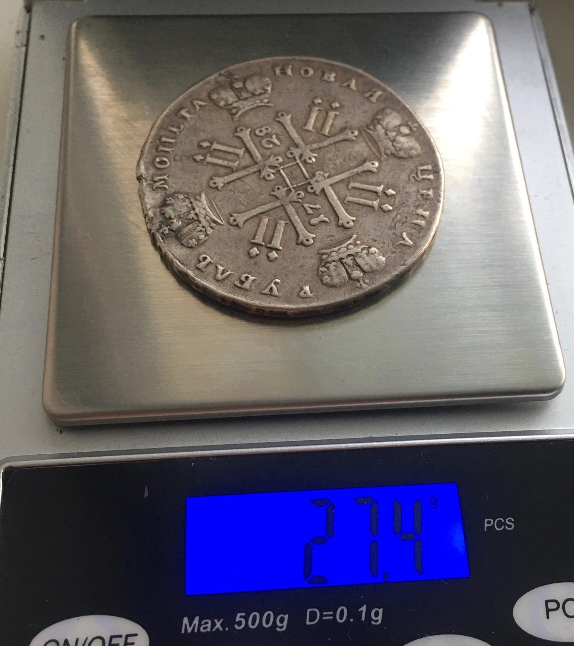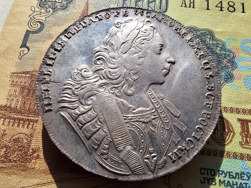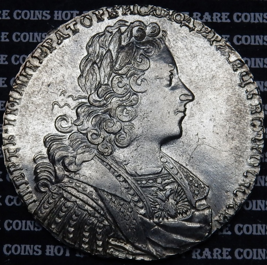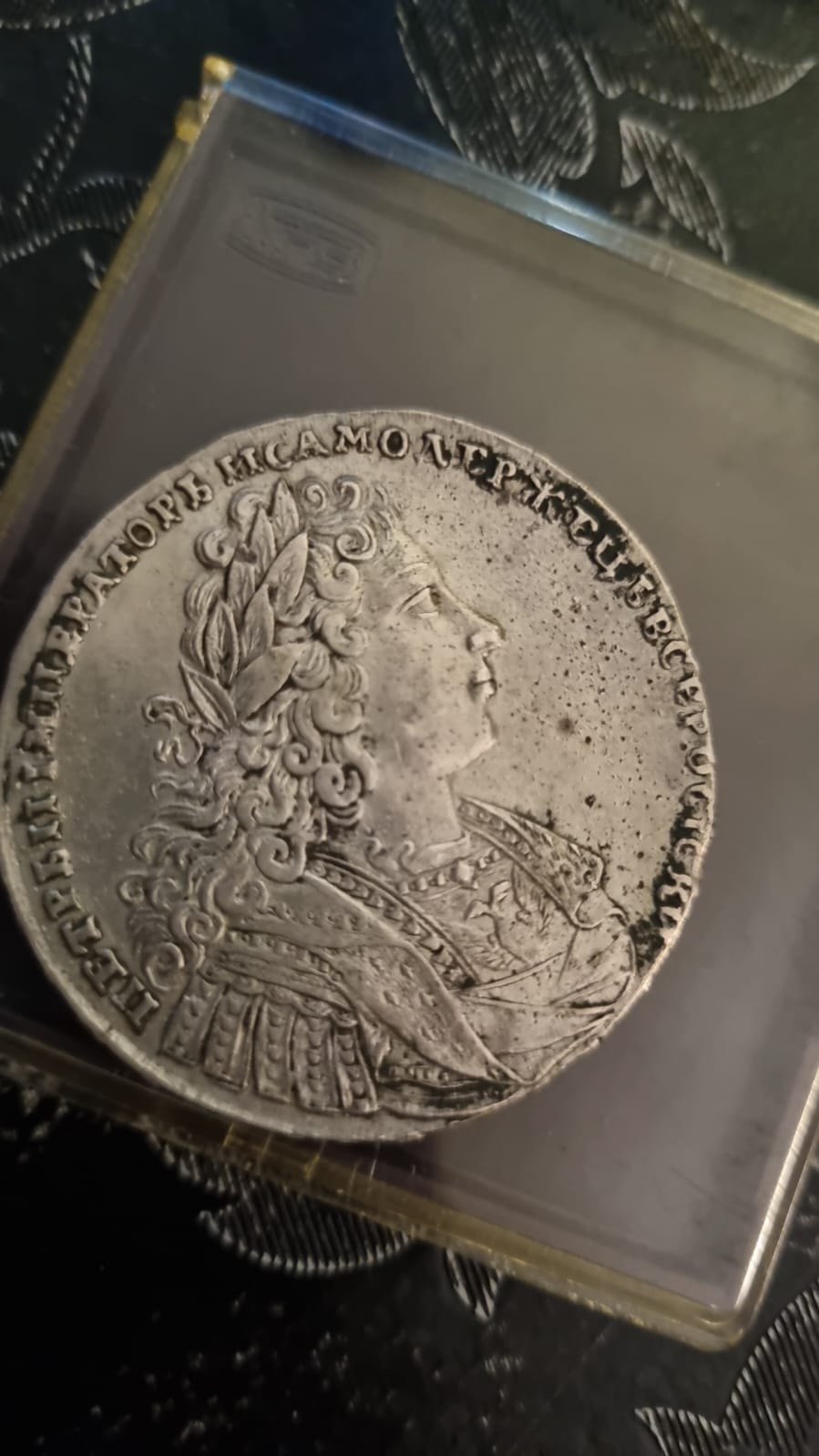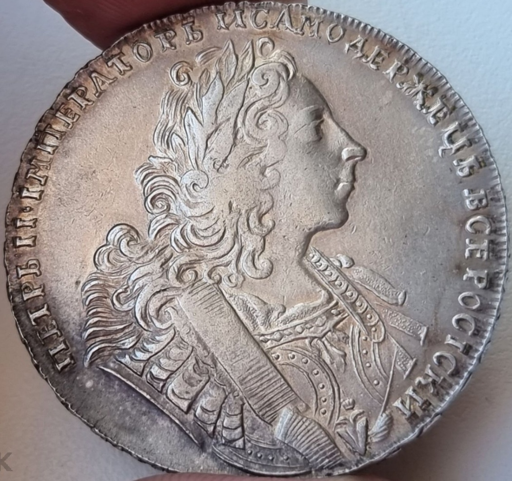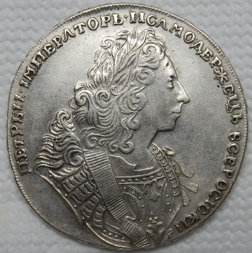Монета номиналом 1 рубль 1728 года, отчеканенная в правление императора Петра II из серебра. Несмотря на внешнюю ровность, большинство экспертов в комментариях сходятся во мнении, что это современная копия (фуфло, шляпа). Подобные подделки часто встречаются на рынке.