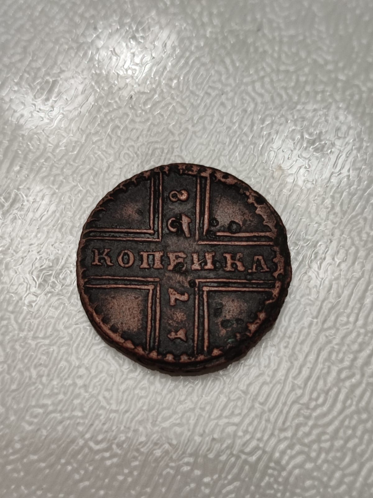 Монета представлена как медная копейка 1728 года, отчеканенная в период правления Петра II. Однако, согласно консенсусу экспертов в комментариях, это современная копия. Подлинные монеты этого периода имеют чёткие детали и характерный штемпельный блеск, которых у данной копии нет.
