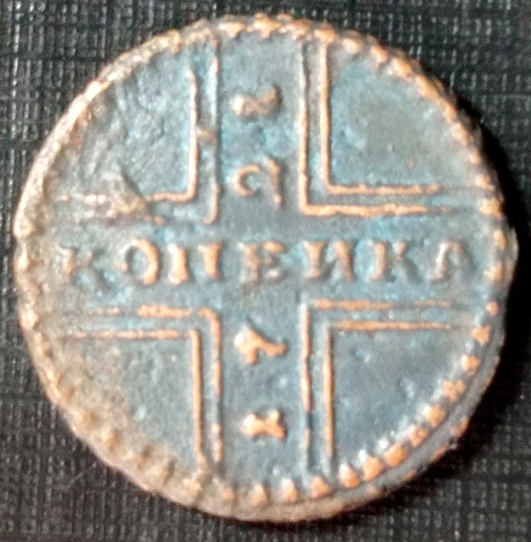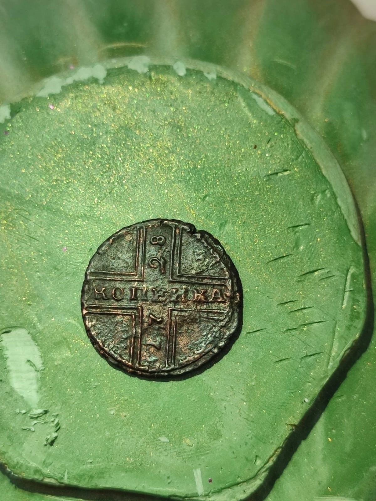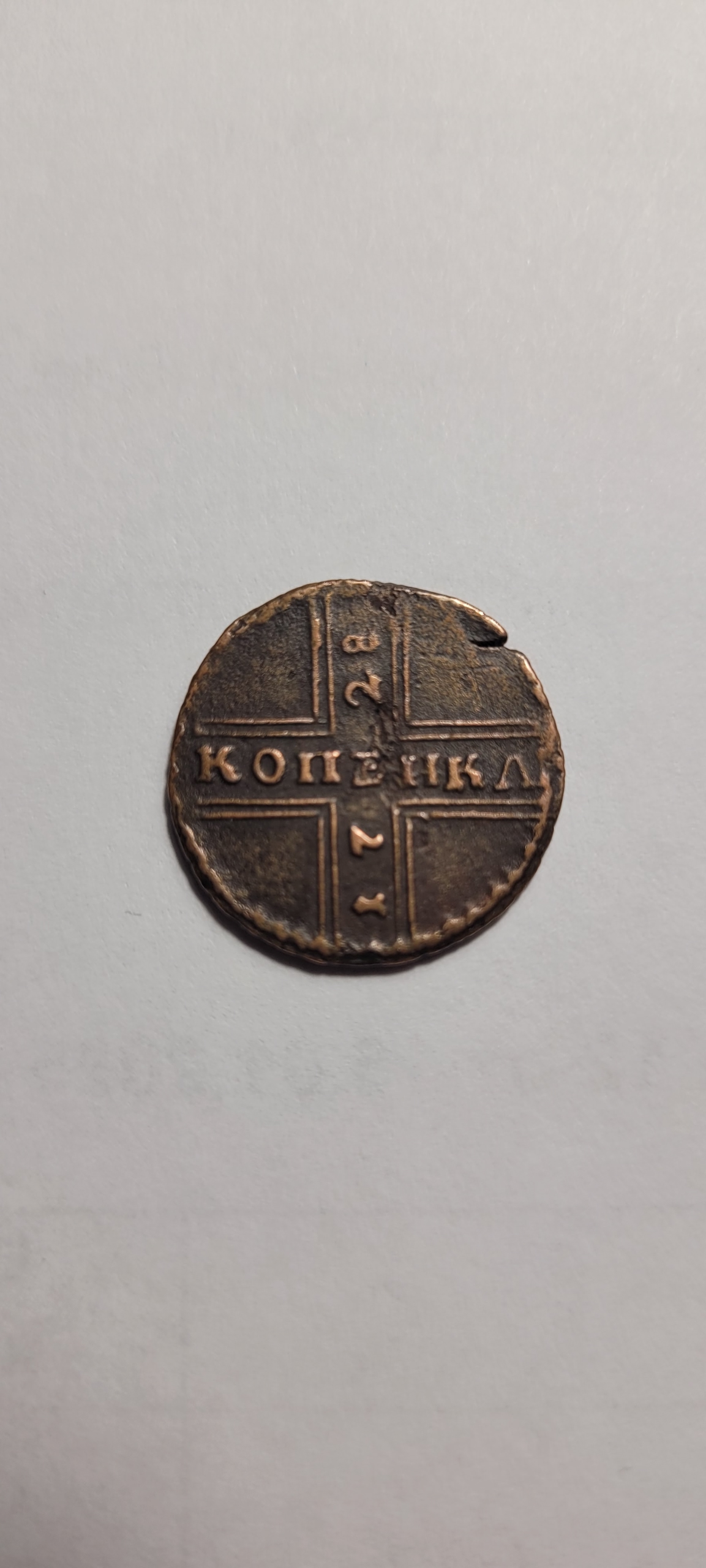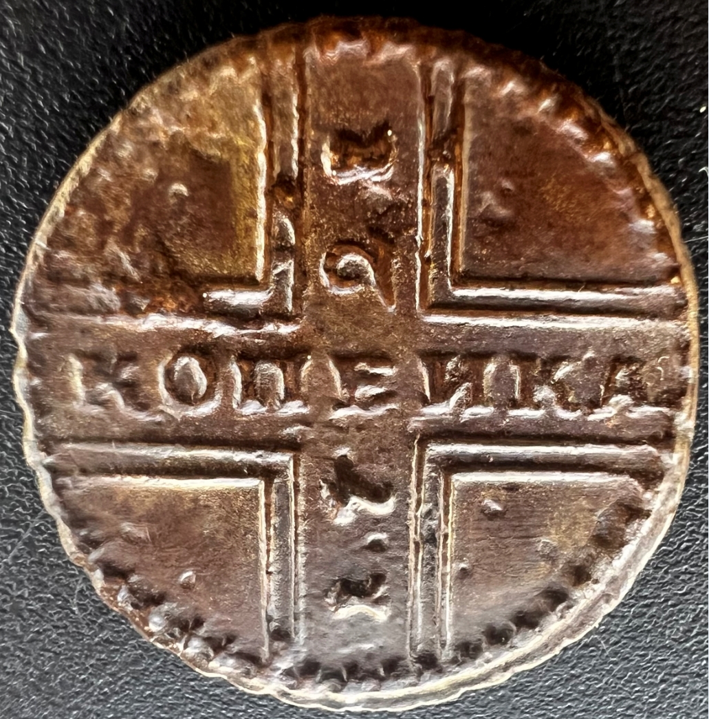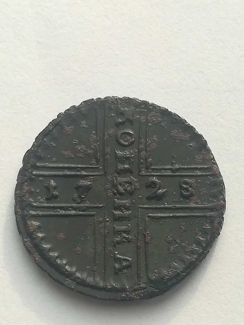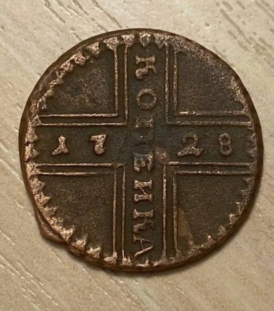 Медная копейка 1728 года, отчеканенная в период правления Петра II. Монета имеет характерный для данного периода дизайн с всадником с копьём (копейщиком) на аверсе и двуглавым орлом на реверсе. Несмотря на некоторые сомнения в комментариях, консенсус опытных коллекционеров склоняется к её подлинности.