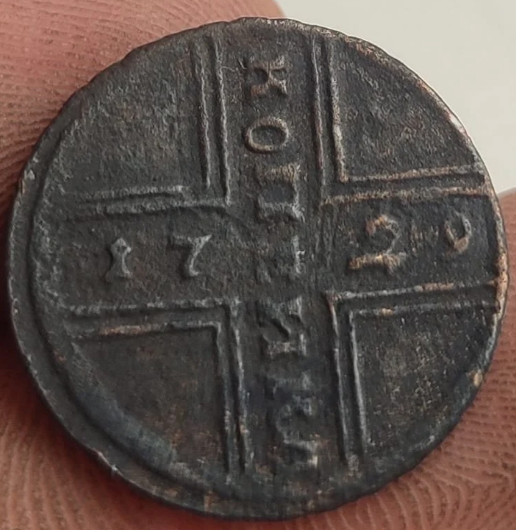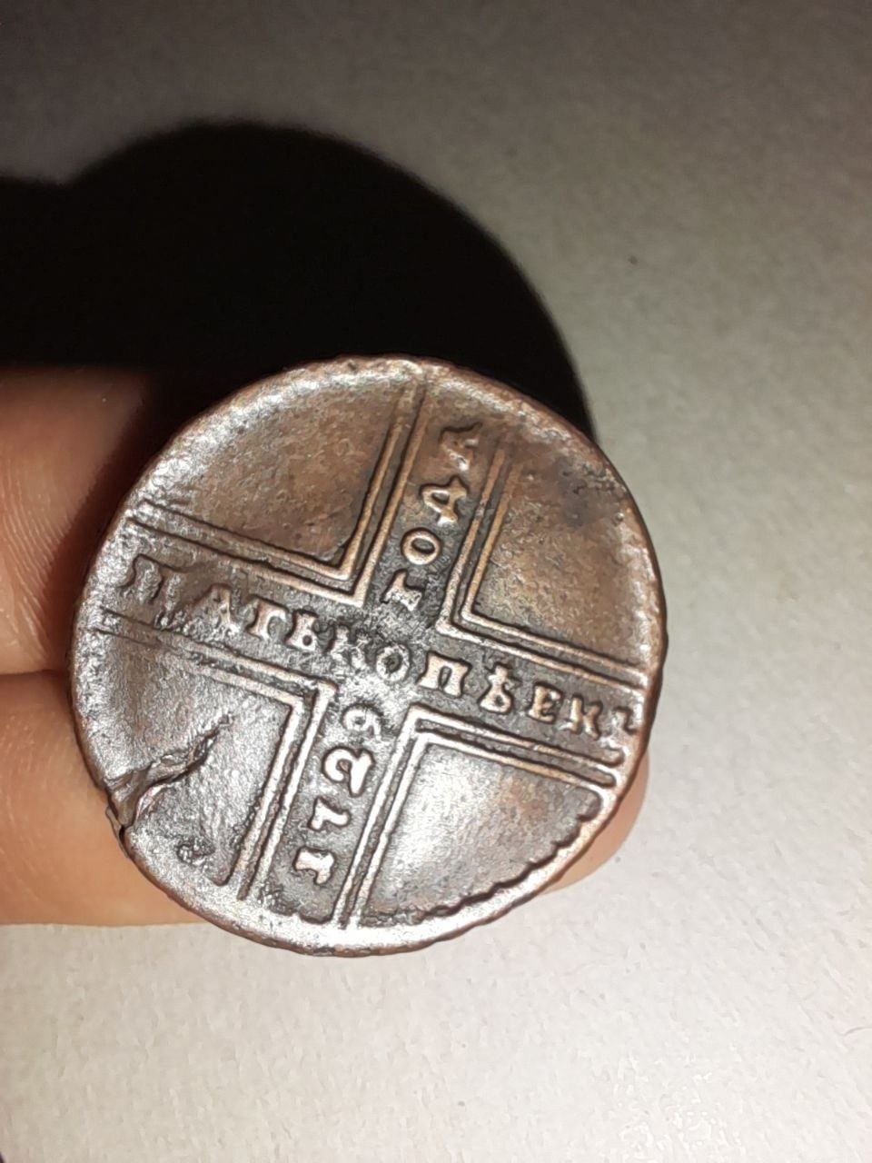 Монета номиналом 5 копеек, отчеканенная в 1729 году в правление императора Петра II. Медные монеты этого периода имеют высокую коллекционную ценность и часто подделываются. В данном случае автор поста прямо указывает, что монета является подделкой.