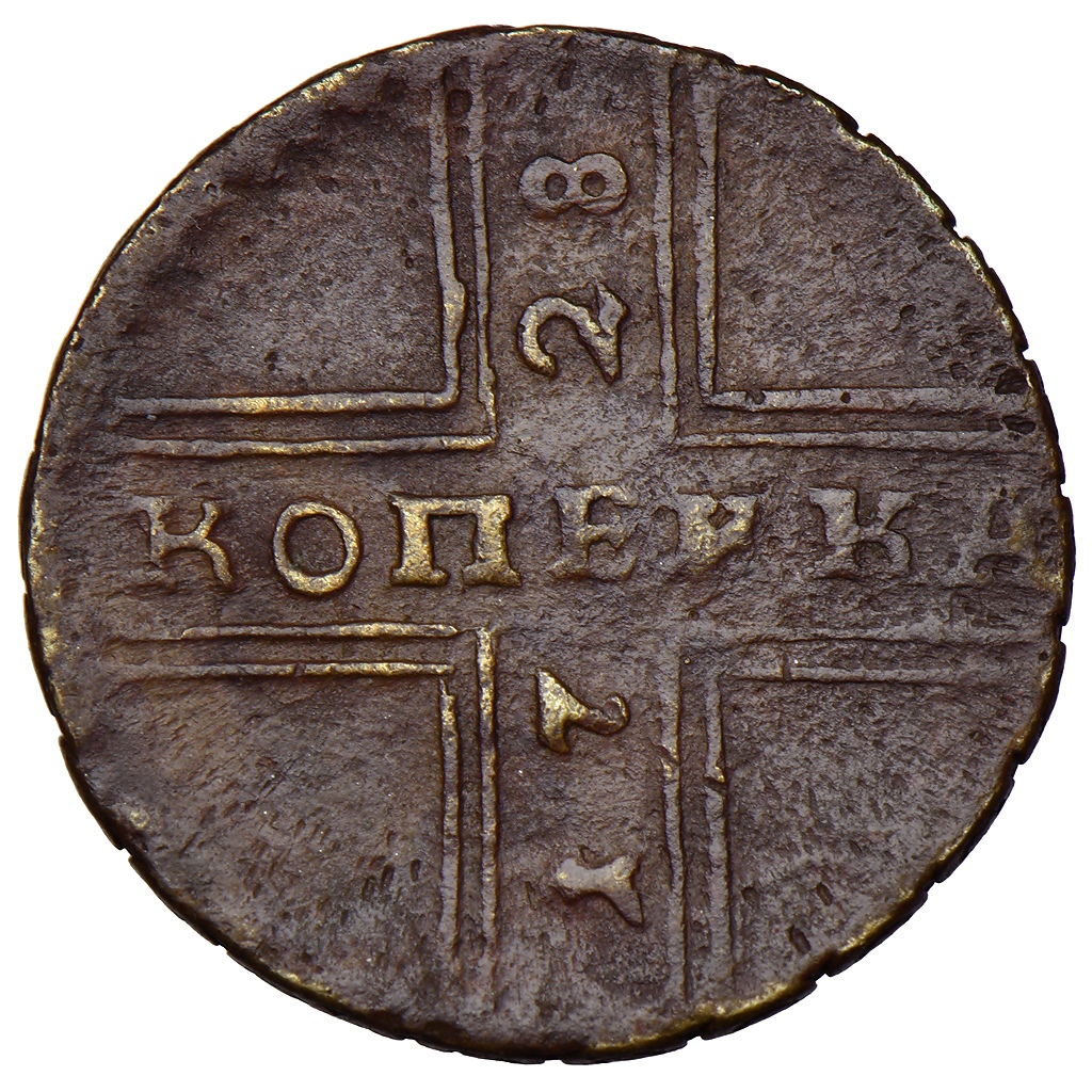 Медная копейка 1728 года, отчеканенная в правление императора Петра II. Монета данного типа имела широкое хождение, но представленный экземпляр является современной подделкой. Основной признак фальшивки — технология изготовления (литьё), что не соответствует оригинальной чеканке того периода.