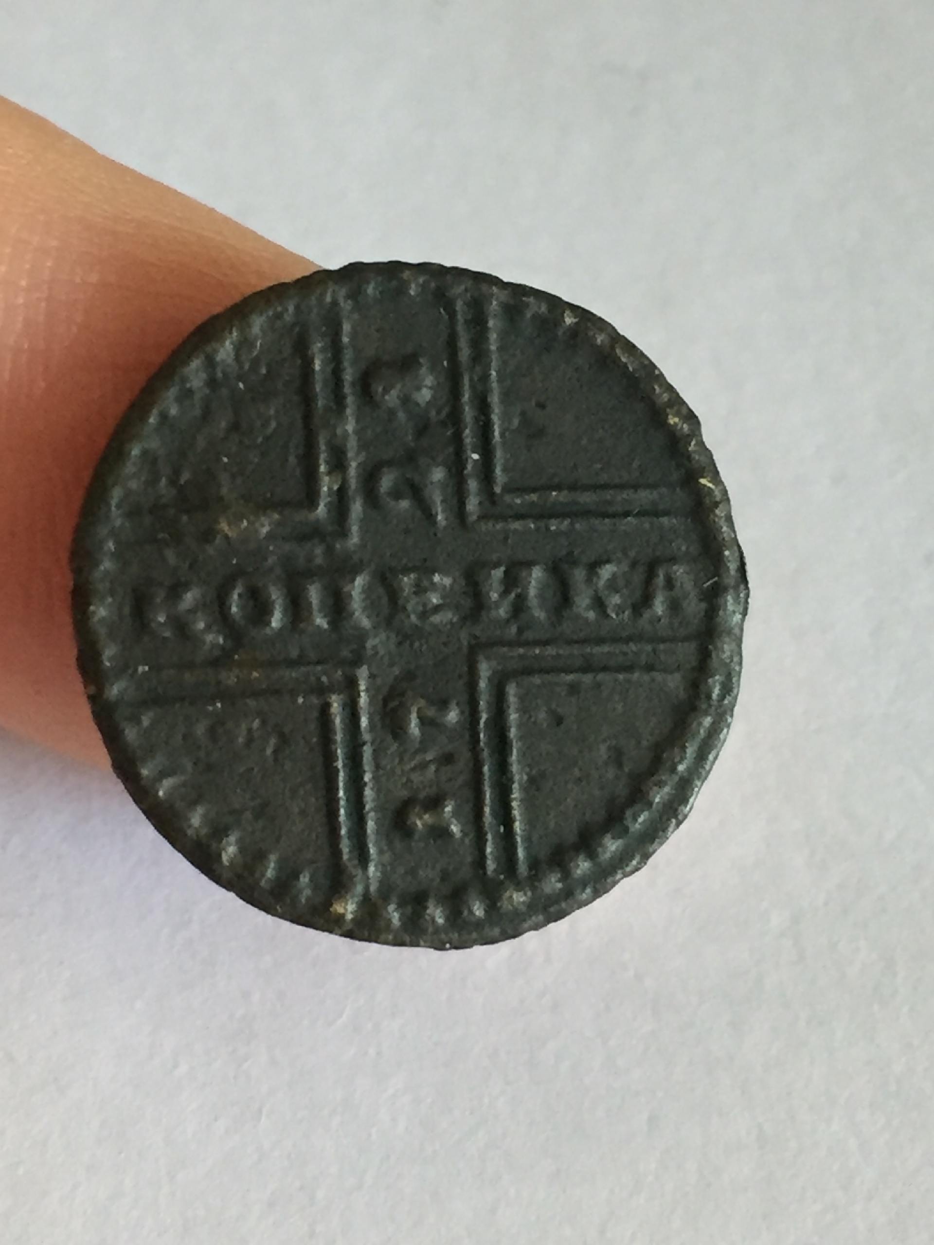 Медная копейка 1728 года, отчеканенная в период правления императора Петра II. Монета имеет характерный для данного периода дизайн с всадником, поражающим копьём змея (Георгий Победоносец), на аверсе и двуглавым орлом на реверсе. Подавляющее большинство экспертов в обсуждении признали её безусловно оригинальной, отметив соответствие всем признакам подлинника.