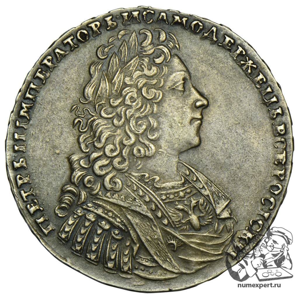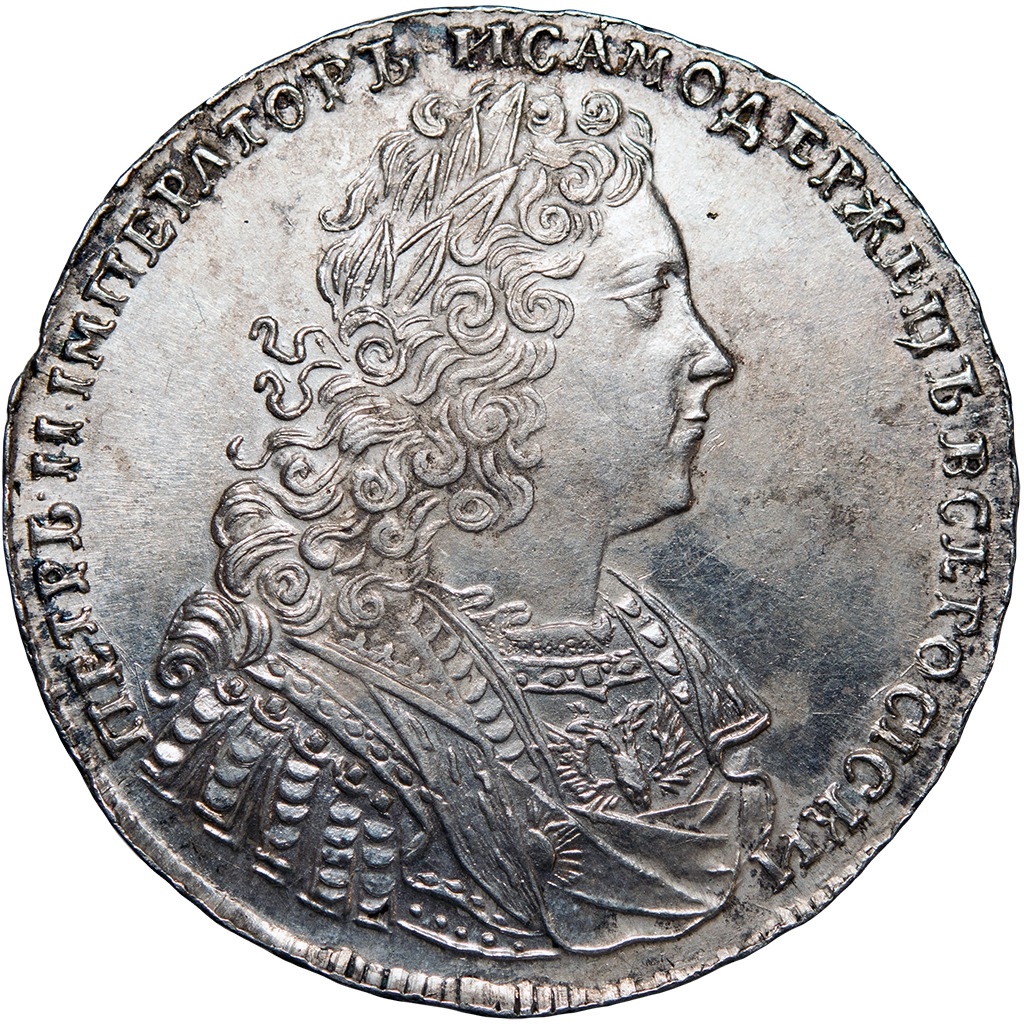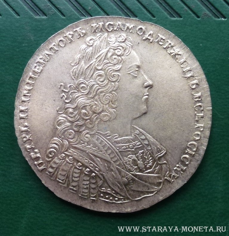 Монета номиналом 1 рубль, отчеканенная в 1728 году от имени императора Петра II. Несмотря на внешнее сходство, большинство экспертов в комментариях сходятся во мнении, что представленный экземпляр является подделкой. Отмечаются низкое качество деталей, отсутствие фото гурта и общий вид, не соответствующий оригинальным монетам того периода.