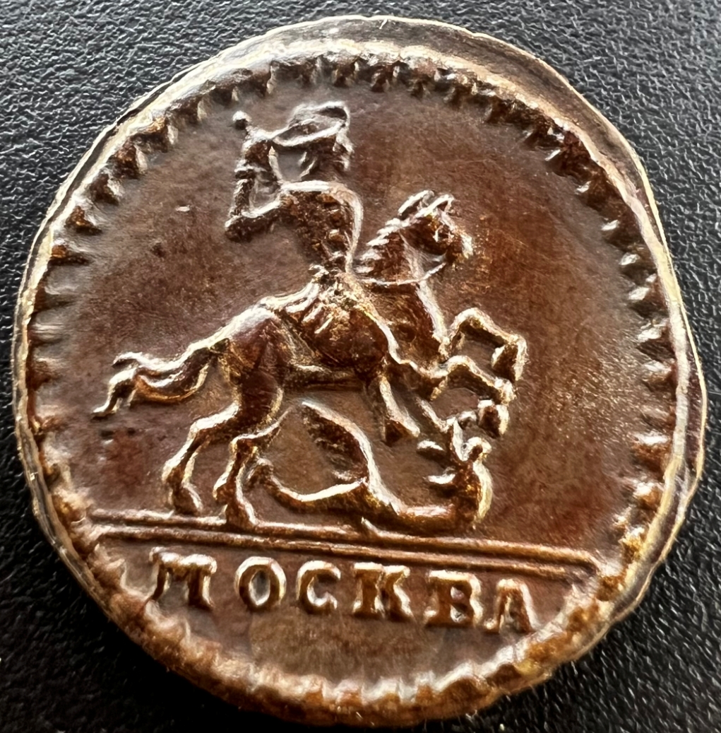 Медная копейка 1728 года, отчеканенная в правление Петра II. Монета является подлинной, несмотря на нестандартный вид всадника (Георгия Победоносца), что объясняется особенностями ручного штемпельного производства того времени. Возможная механическая чистка в прошлом также могла повлиять на её внешний вид.